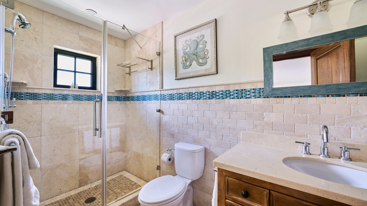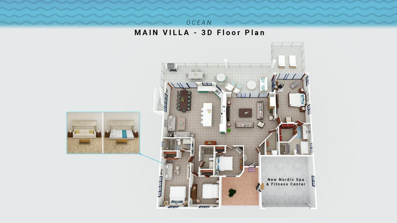 • Main Suite: King bed, walk-in closet, private ensuite bathroom, ocean + pool views