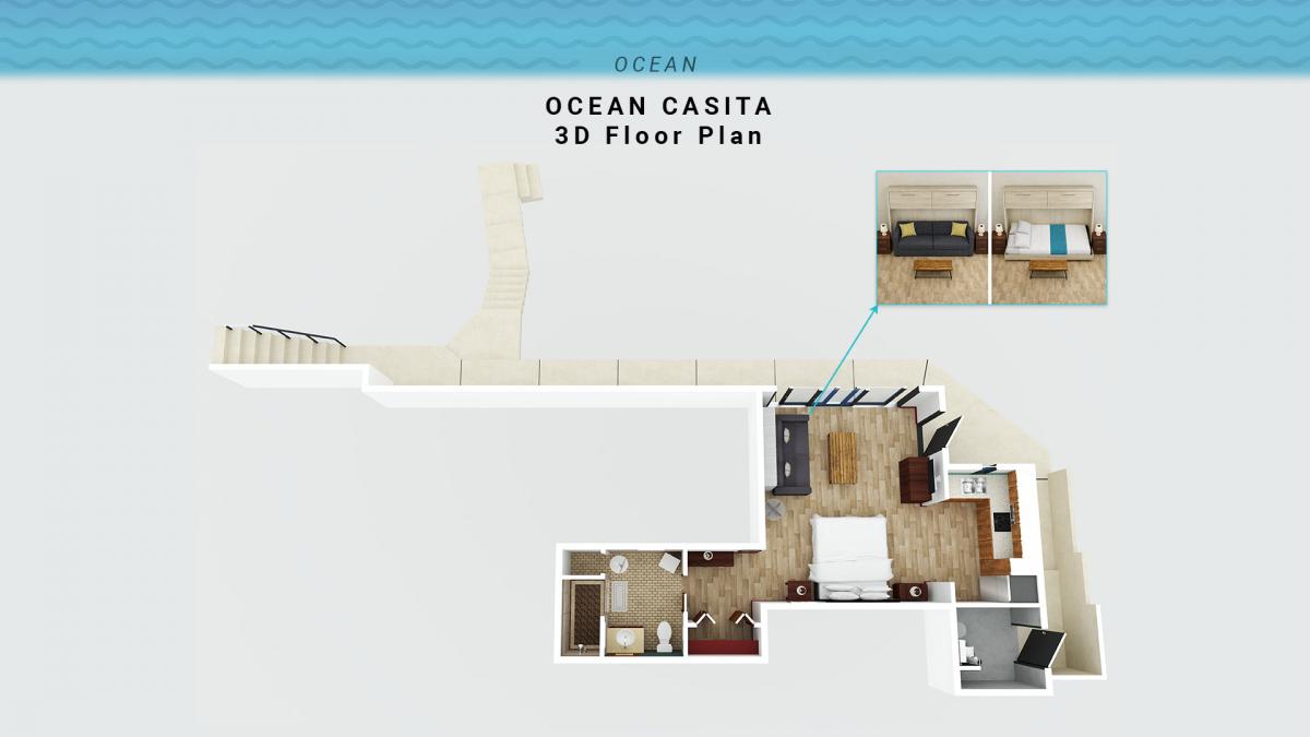 • Ocean Casita: King bed + Queen Murphy/Wall bed (a full second bed with a luxury foam mattress), private kitchen, private ensuite, ocean views