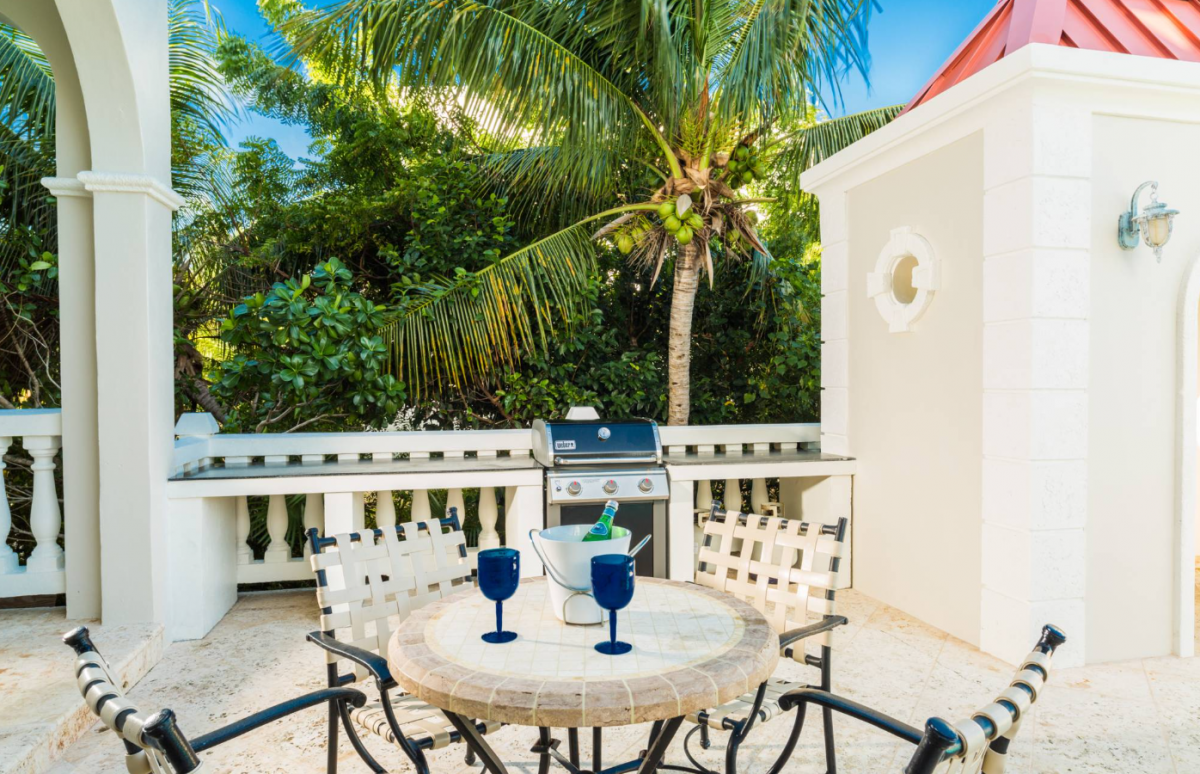 Rejuvenate in Caribbean classical grandeur at an elegant three-story beachfront estate on Grace Bay Beach. Grace Bay is voted “World’s Top Beach” year after year. Everyone is happy with room selection at Beach Villa Paprika, because the 5 spacious bedroom suites are equal in size. Each master suite has a beautiful water view, a private patio/balcony with outdoor furniture, and an en-suite bathroom. Villa Paprika sleeps 12 people comfortably with 7 king beds. There are 5 full baths and 2 half baths. The covered, poolside dining table comfortably seats 12 to 14 people and is perfect for large groups and special celebrations. The indoor table seats 10. Enjoy the outdoor grill and fully-equipped gourmet kitchen, or hire a villa chef or catering service to prepare memorable dining experiences.