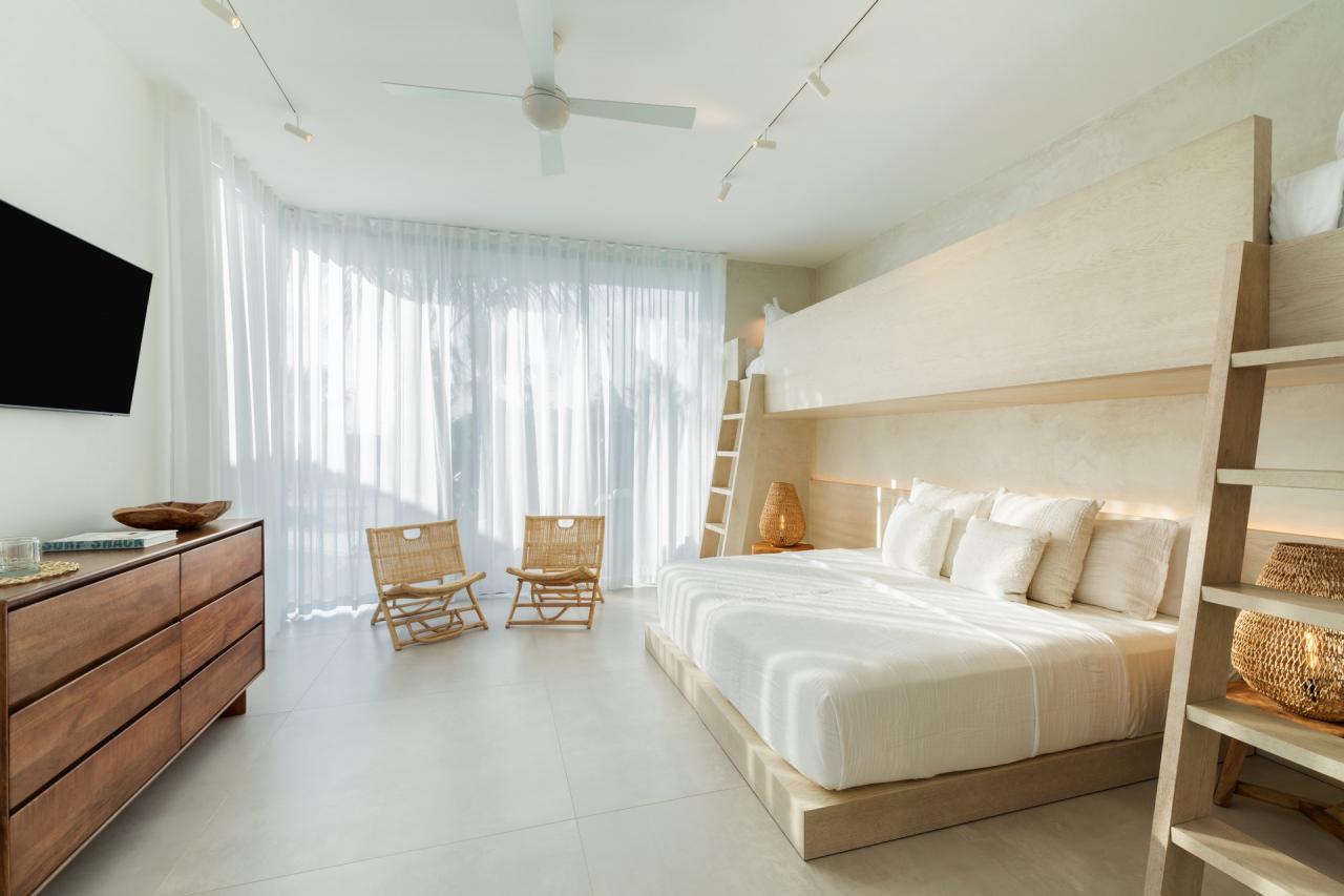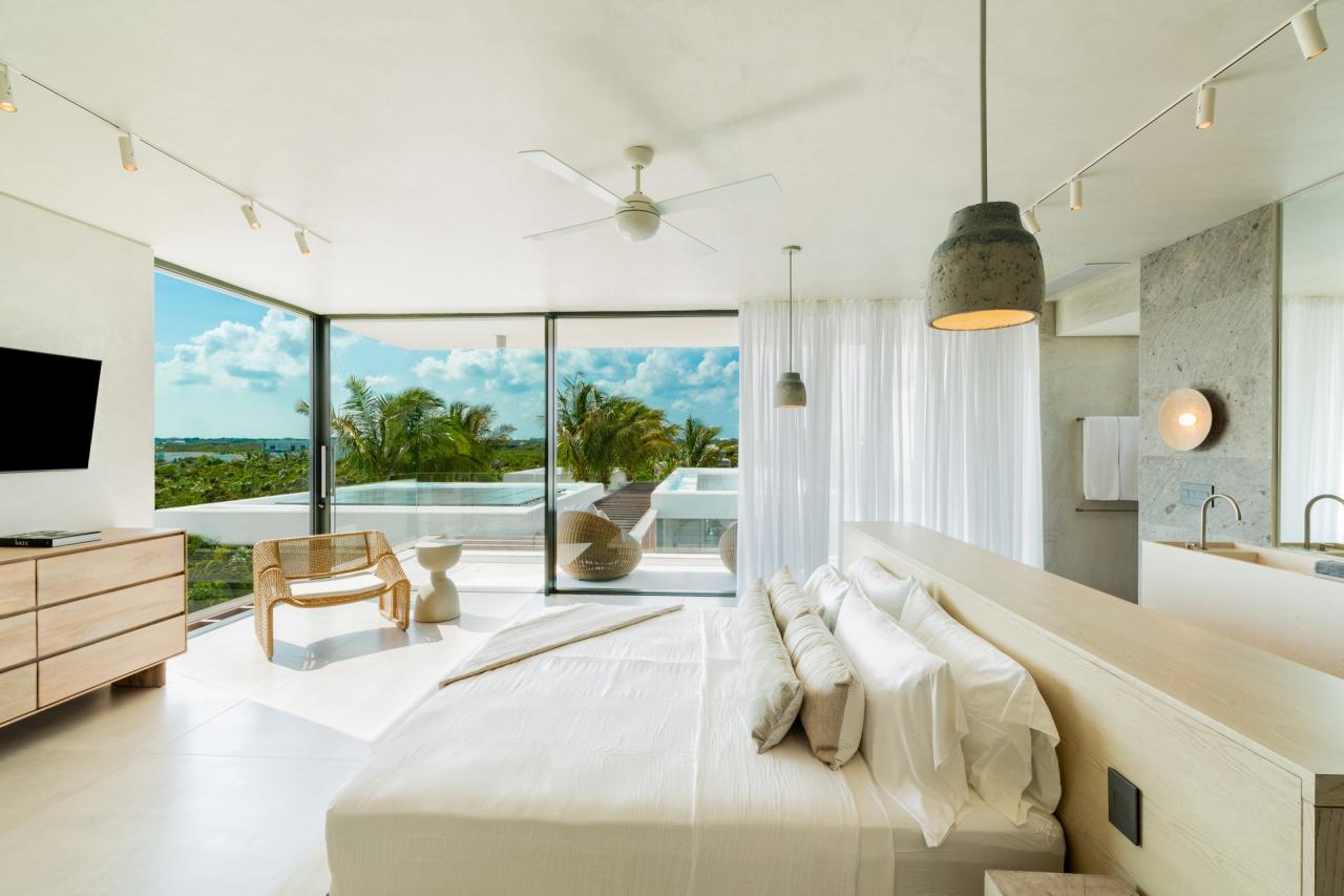 Main House: The main house has three bedrooms upstairs; all rooms have king-sized beds, a balcony, a TV, an open-concept closet with a safe, and an ensuite bathroom with double sinks.