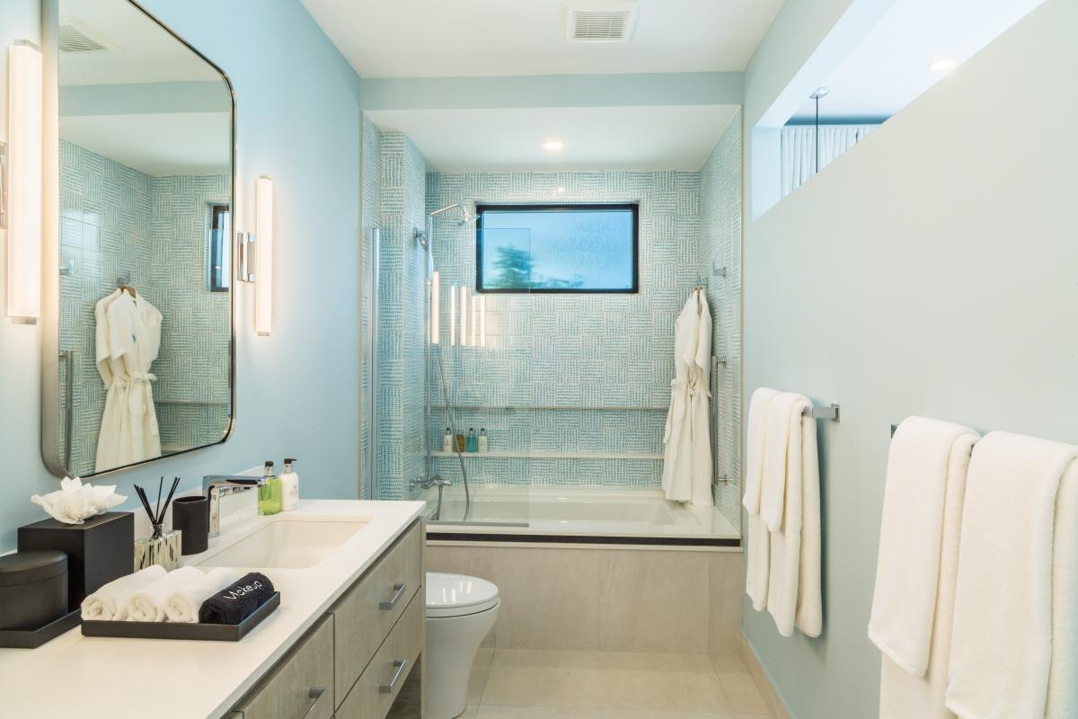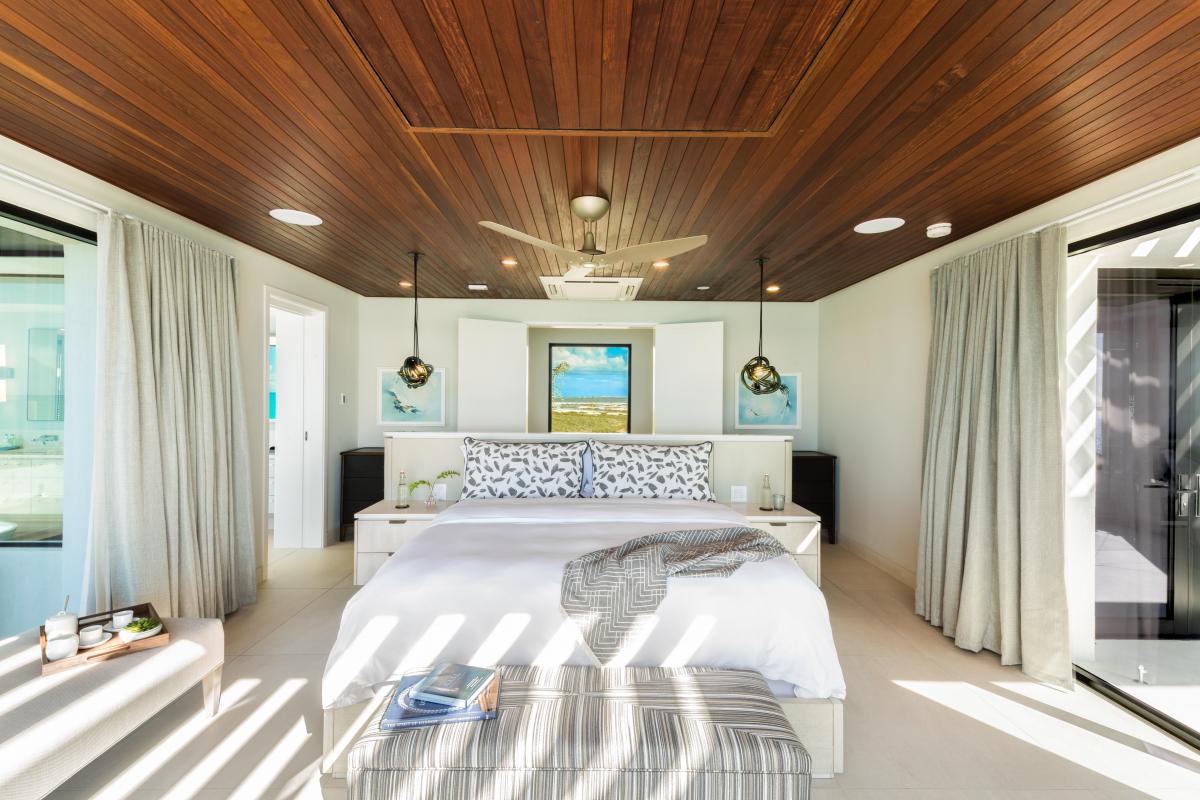Principal Bedroom: Second level, king-sized bed, 120 degrees Caribbean ocean view, covered master patio, uncovered bathroom patio, rainfall shower, tub and outdoor shower.