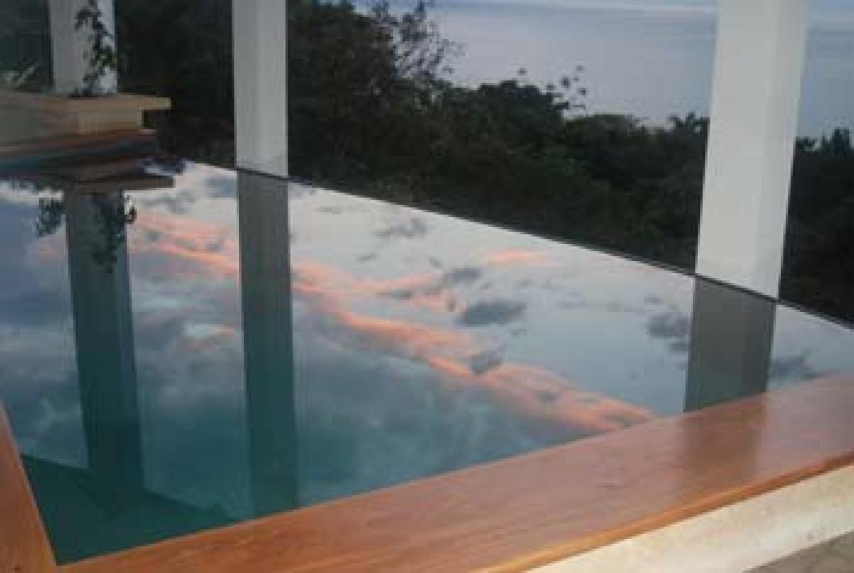 Casa Las Nubes is a new, luxury villa, nestled hillside in a Costa Rican jungle in Tulemar Gardens of the Manuel Antonio National Park. Designed by an award winning architect, the sweeping curve design of the villa drinks in the lush jungle environment and expansive Pacific Ocean views, which can be enjoyed from private terraces on each of the three levels. The large windows and open air expanses help to achieve a strong relationship between the natural surroundings and interior spaces. With a pool feature extending throughout the main level, a guest is literally "walking on water" as they enter the house. The jungle is invited inside with the greenery and tropical flower planters spanning the terraces. Also, neighboring howler, white face and squirrel monkeys, birds, iguanas, sloths, butterflies, and other exotic wildlife visit often. Casa Las Nubes has 4,000 luxurious square feet, including three bedrooms and three and a half bathrooms. The kitchen has been nicely appointed with both granite counter tops and stainless steel appliances, including a gas range. Catering services or a private chef are available for an additional fee. Guests have access to the house manager as well as concierge services daily, who are available to assist with tour and activity arrangements. Maid and gardening services are performed daily.