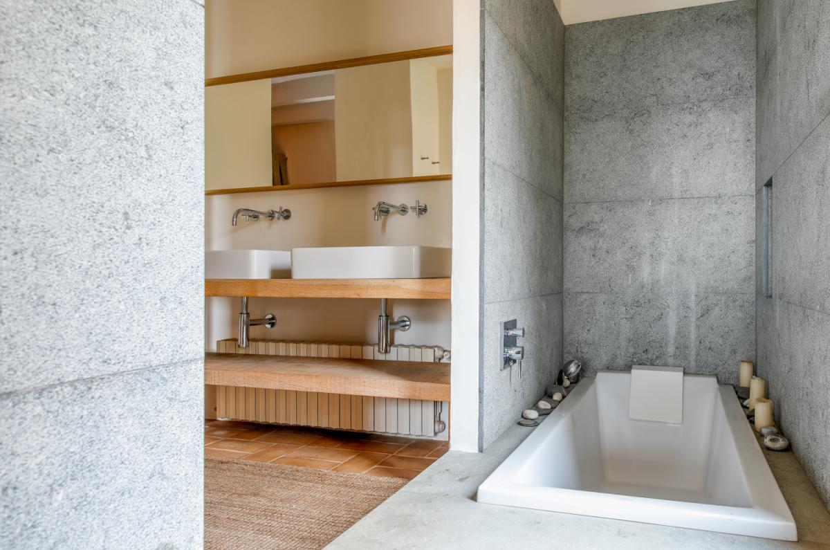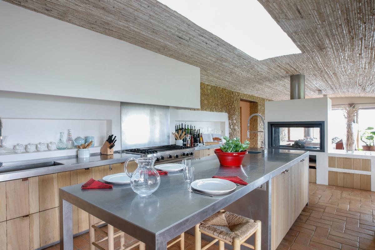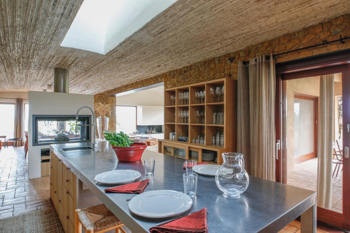An open concept great room allows for the same jaw dropping views to be visible throughout the main living area. Mini vaulted ceilings with Spanish tile floors create a perfect setting from which to enjoy time spent with family. Two deep, comfortable sofas and an armchair encircle the room, allowing guests to sit back and bask in the breathtaking views of the Spanish countryside. Adjacent to the living room is the dining room with an original stone wall, textured ceiling and sleek, wooden table with seating for up to eight guests in round back chairs. Serving the dining room, and sitting opposite the dual sided fireplace, is the home’s enviable kitchen. This gourmet space invites for group meal creation with a large stainless steel island, breakfast bar with seating for four, abundant counterspace and state of the art appliances.