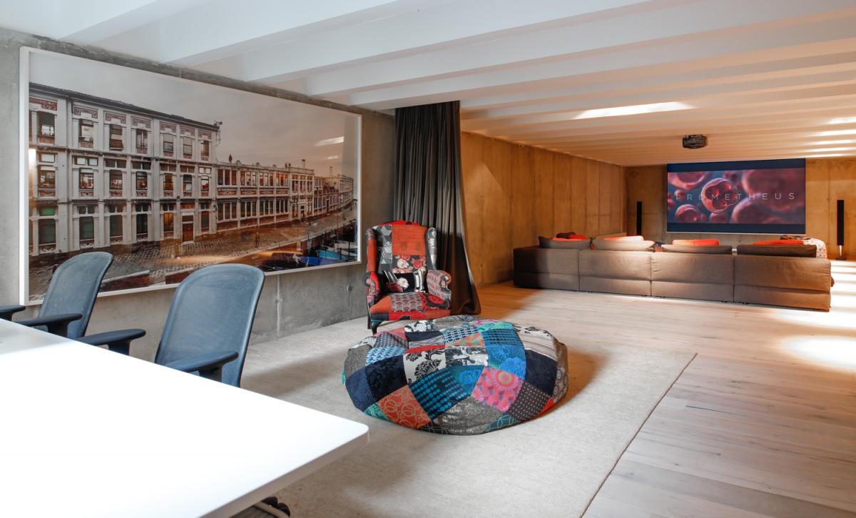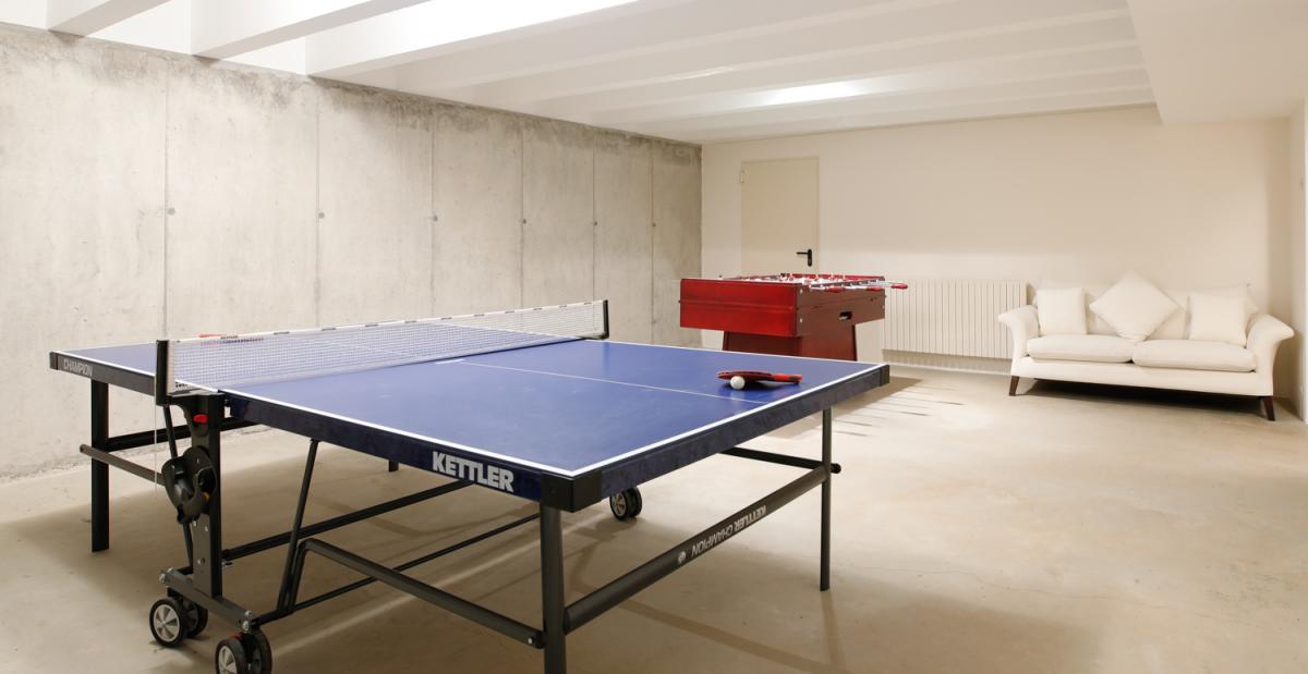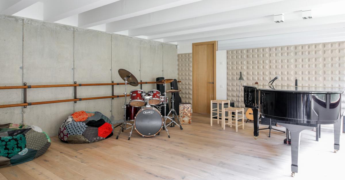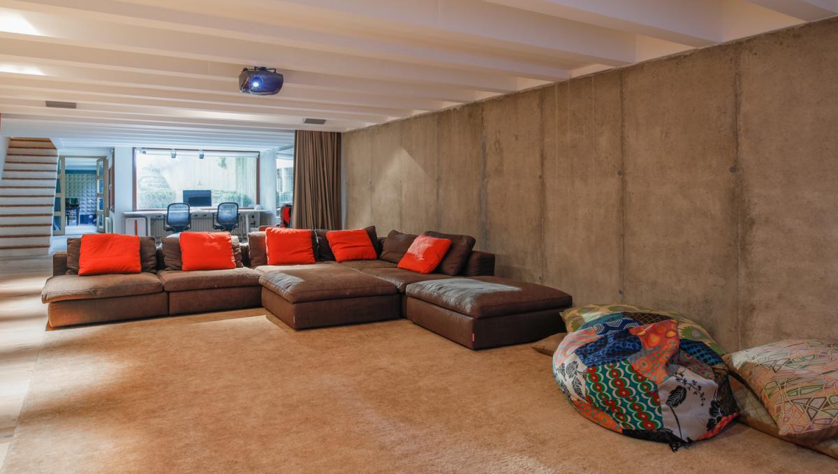 A plethora of entertainment options occupy the estate’s lowest level. A large in home cinema plays host to an oversized, deep sectional sofa with projector, screen and a full library of movies to enjoy. The neighboring lounge area offers a full size foosball table, as well as ping pong and two sofas for spectators. Looking to make some music? Look no further than the home’s soundproof music room with full size piano, drum set and guitar! For those who aren’t able to escape work, a quiet escape also awaits on the bottom floor.