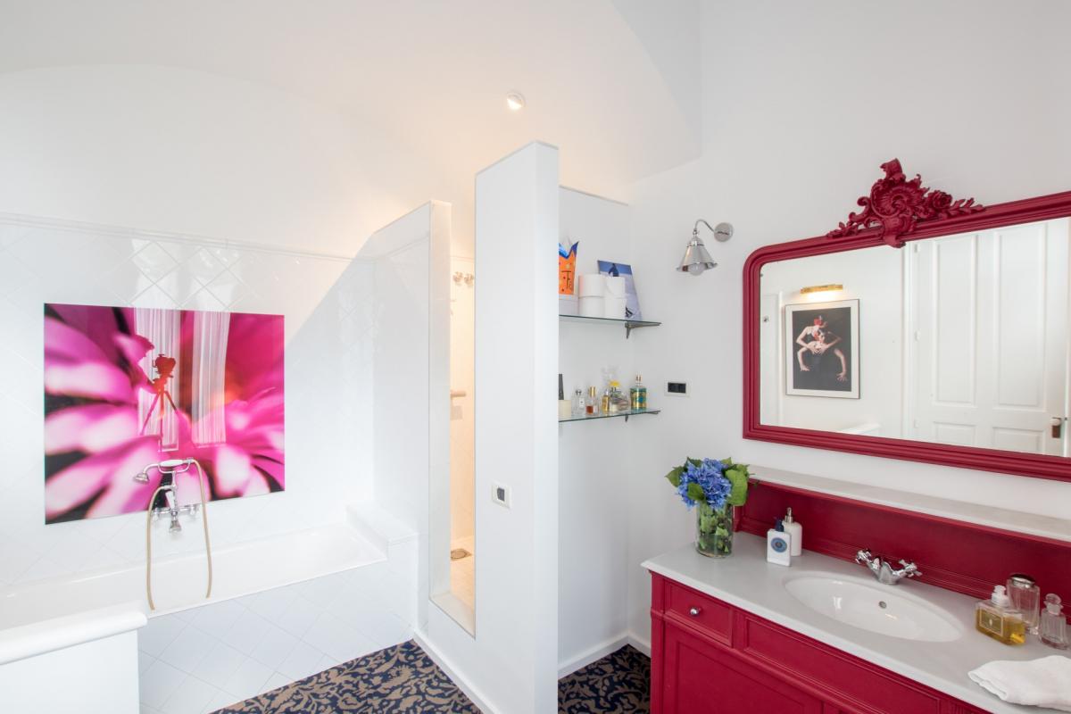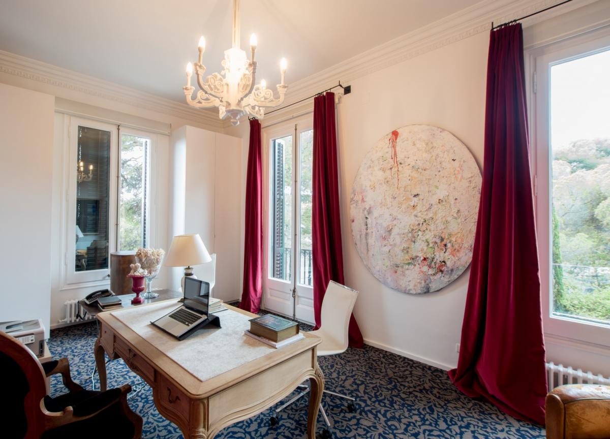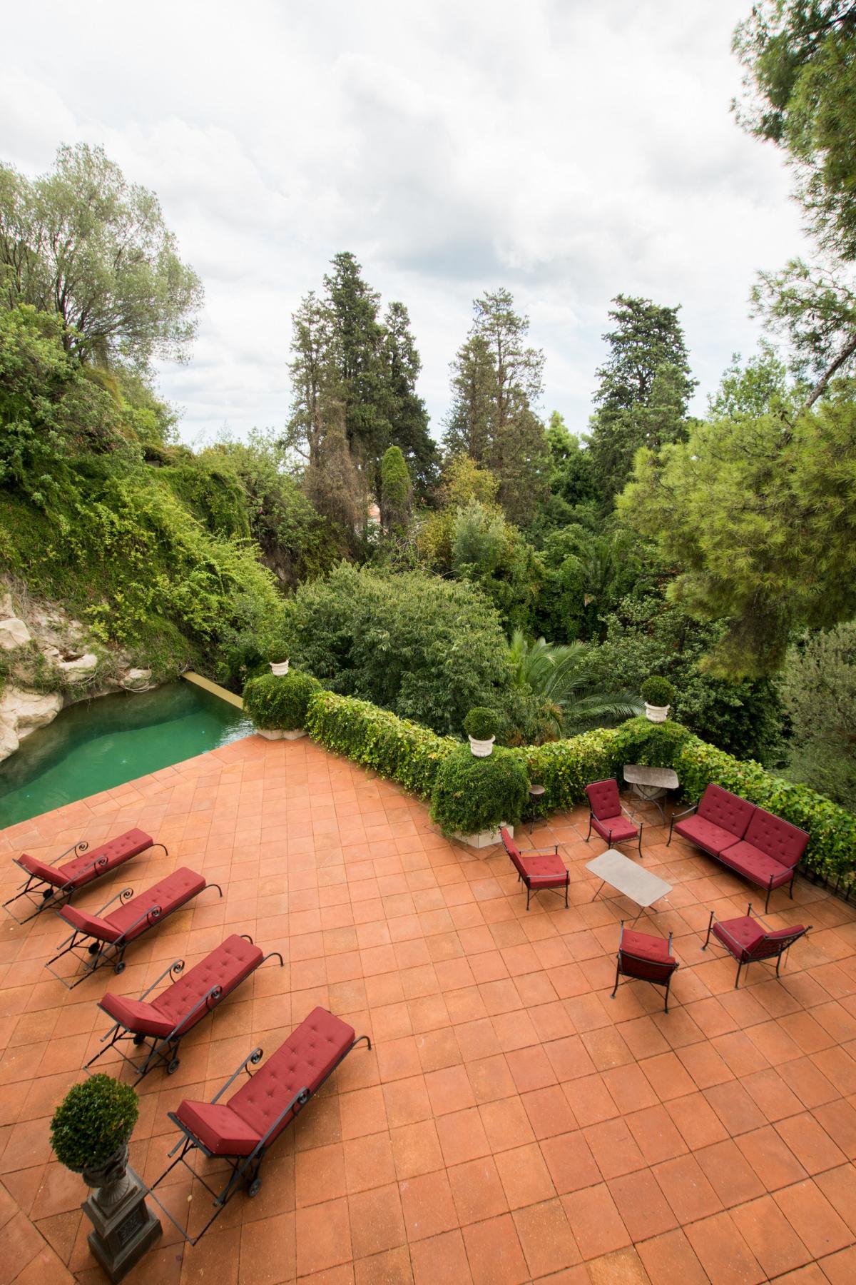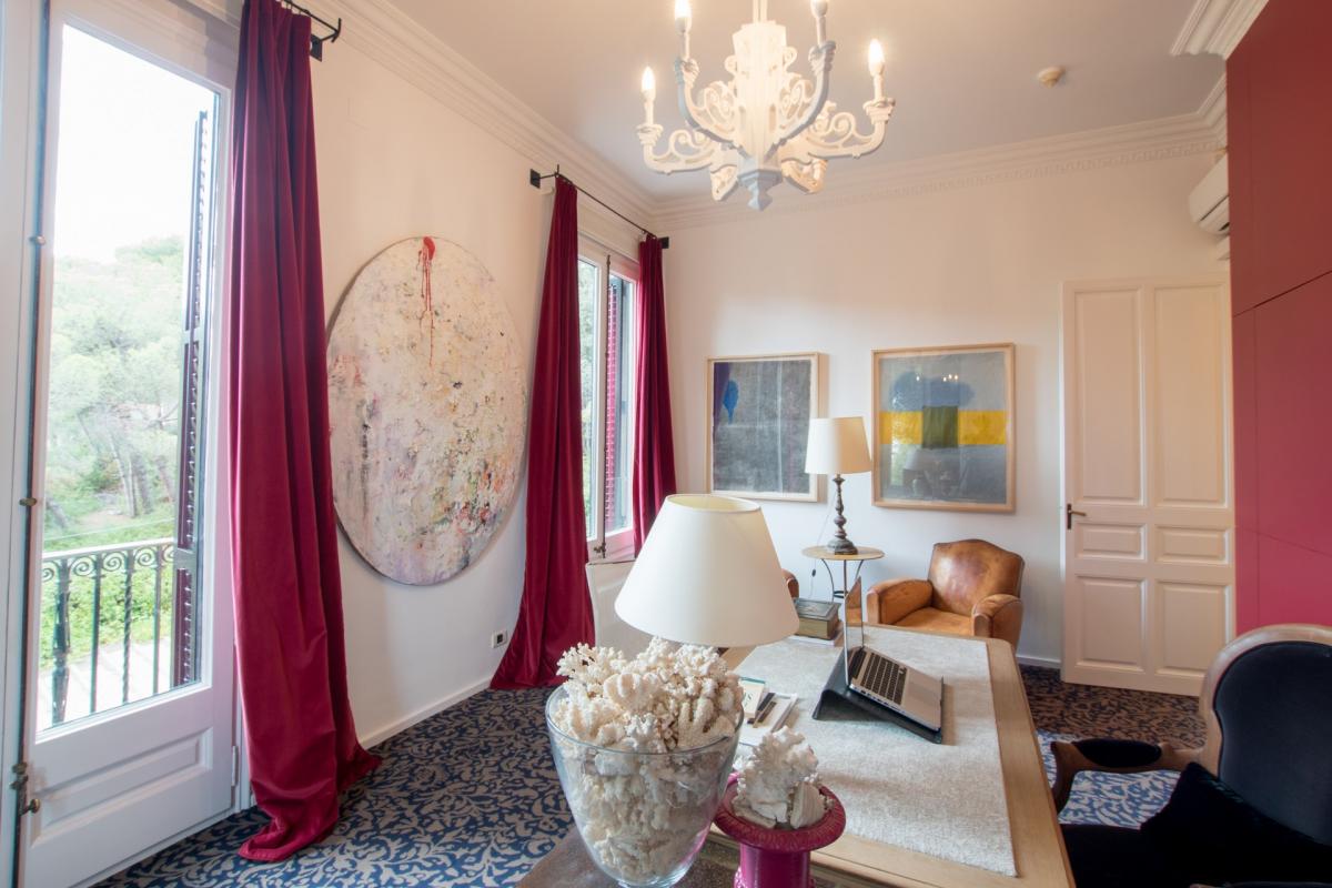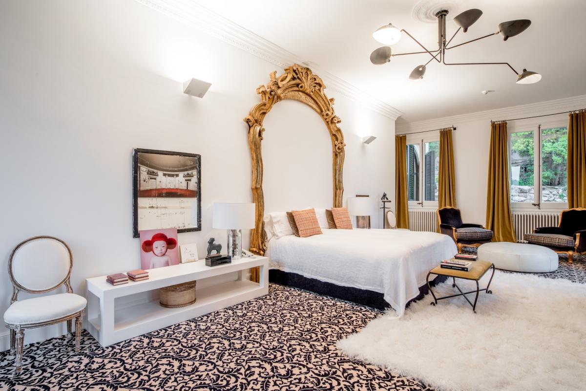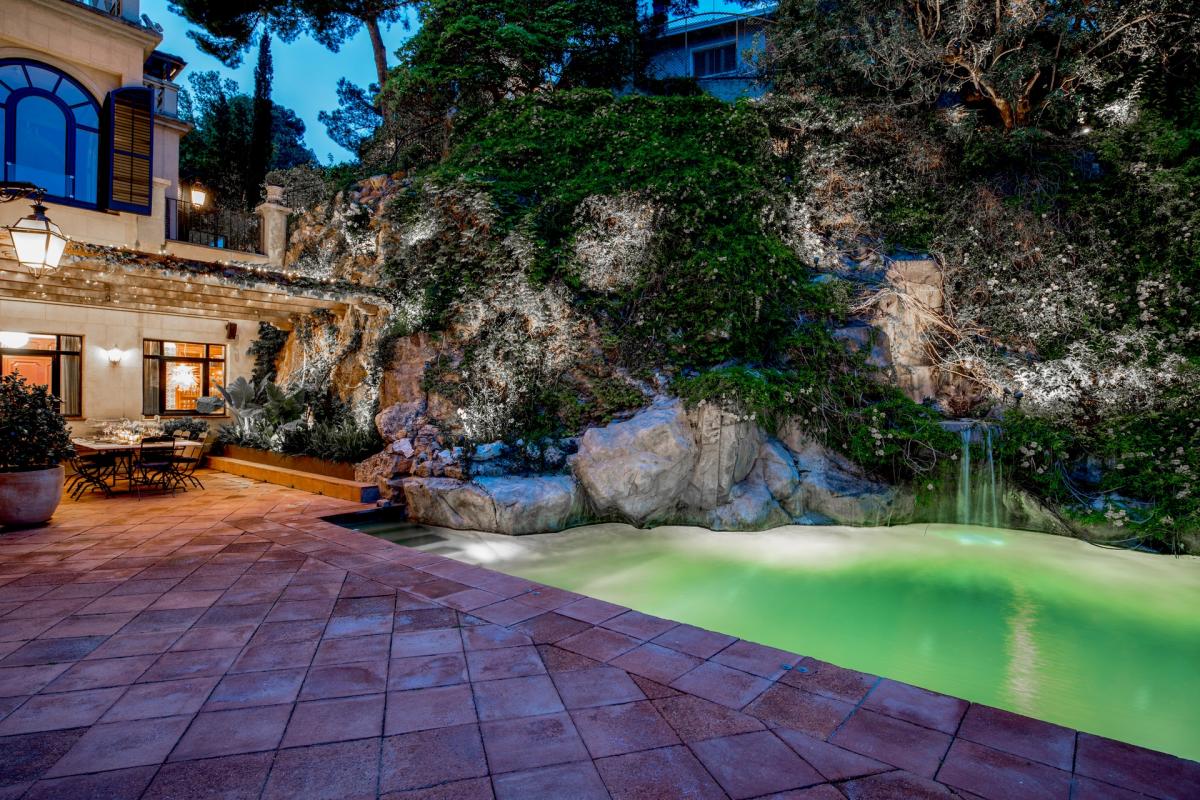 Villa 1904 is accessed via a prestigious, private road in middle of the city, where once you enter through the private gates you’ll arrive at the splendidly palatial entrance. On the home’s main floor, the grand living room was decorated by one of Spain’s top interior designers with a mix of antiques and modern furnishings. A cozy den opens up off the living area with TV, fireplace with ornate wooden mantle and intimate sitting area overlooking the gardens. The extravagant ceilings are 15 feet high, typical of the modernist era, with delicate crown molding, period trim and details that transport guests back to a more lavish and regal time. Opening off this room is an eclectic office which also functions as library with books shelved as high as the ceiling. The dining room boasts a red lacquer table for 12 which seamlessly unfolds into the outside patio and alfresco dining area for eight, sheltered by a floral entwined gazebo. The patio on this level is carved out of the mountain rock and surrounded by vegetation eventually opening up to a stunning natural shaped pool carved into the rocks. Relaxing on the terracotta tile patio with a plethora of lounge chairs and bistro seating, guests absorb the spectacular view of the city with beautiful sea beyond. The state of the art kitchen, informal dining room and cellar are also located in this level.