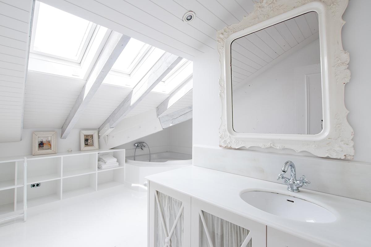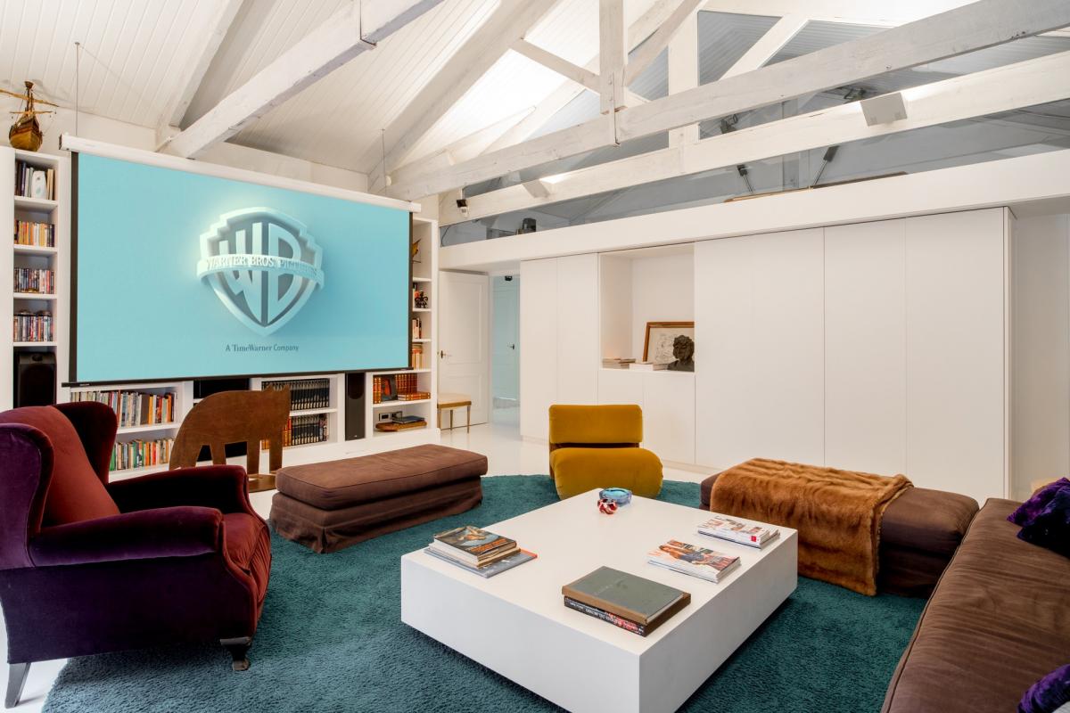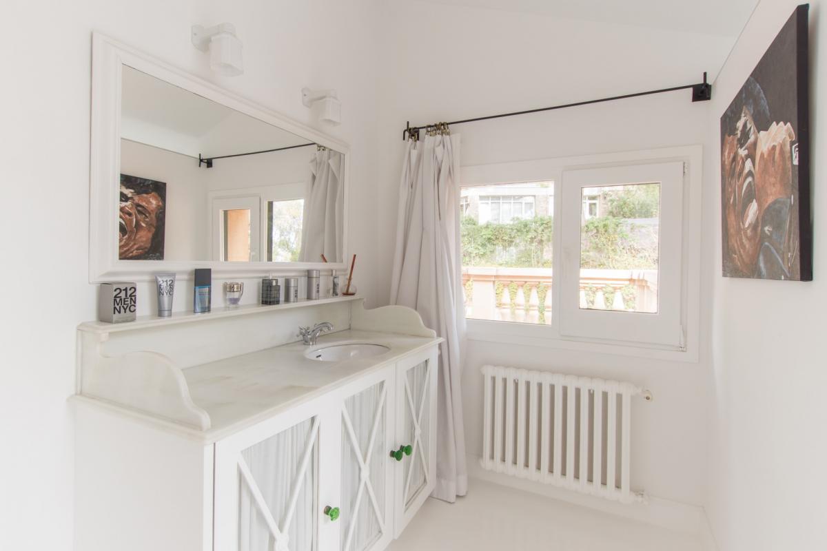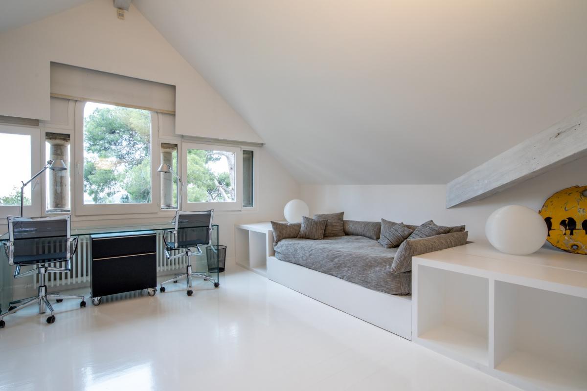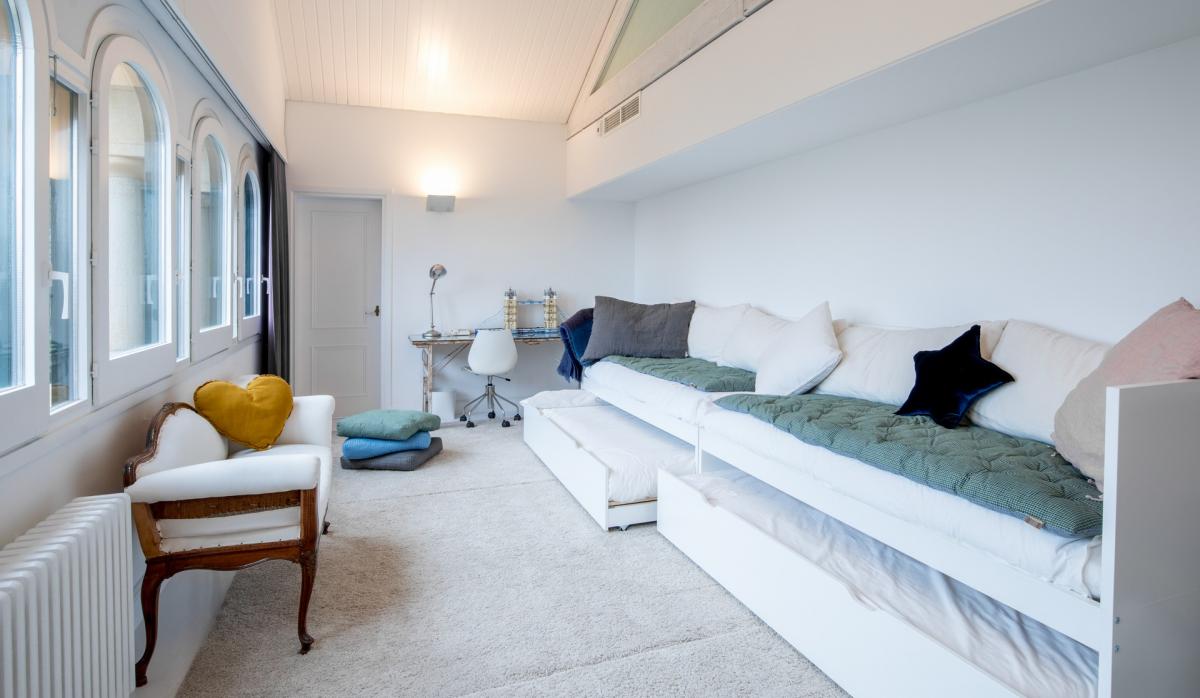 The top floor of Villa 1904 offers a clean, white finish, mixing modern and traditional style with colorful furniture pops throughout. Sitting center stage, a home theater with 9’ x 6’ movie screen and surround sound is upstaged only by the room’s large balcony overlooking Barcelona in all its glory. Accompanying the theater on the uppermost level are three additional guest bedrooms, each with its own en suite bathroom. The first is a king bedroom with mountain views as well as a bathtub and shower in the en suite, while the final two guest bedrooms are perfect for children. One bedroom boasts two twin size beds with twin trundles underneath each and more mountain views, while the other bedroom has a single extra long twin with trundle bed underneath, enjoying sweeping views of the city and the Mediterranean Sea. The en suite bathrooms for both children’s rooms have separate tub and shower.