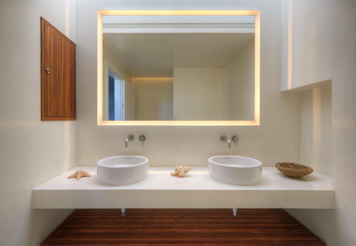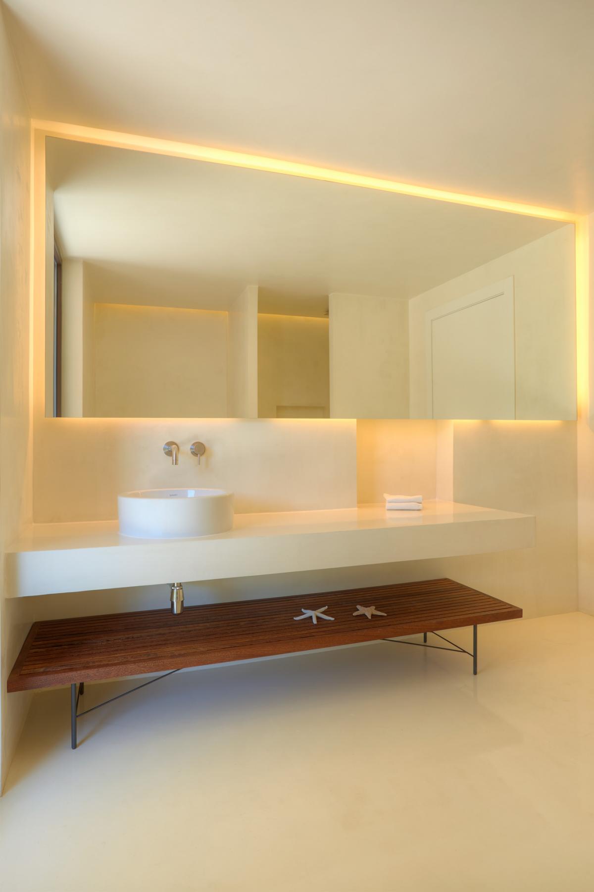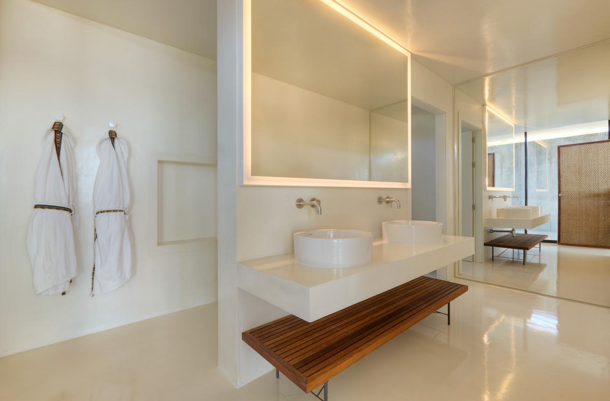 Upstairs, the open air concept continues into the family room with deep, sectional sofa, armchairs and unique fireplace which is suspended from the home’s ceiling. A second dining area serves for continued entertainment which carries onto the home’s top level patio. Also overlooking the pool and the sea, chaise lounge chairs and an al fresco dining table with four chairs create an ideal space from which to enjoy these incredible surroundings in the shade of the pergola.