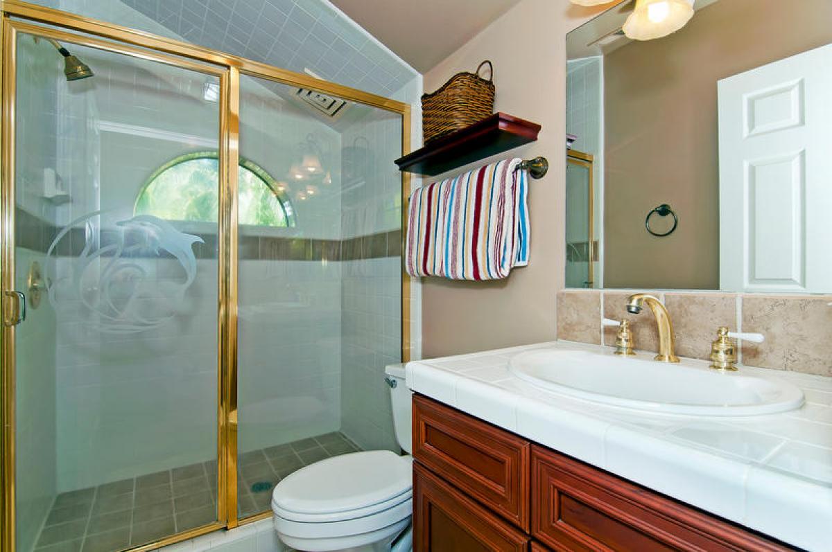 Reaching the 2nd level you realize just how expansive this home is! An enormous open ‘U’ shaped floor plan incorporates large welcoming kitchen, dining and living area complete with gaming table, large screen TV, stereo and DVD player. This truly is a home designed for large scale entertaining and fun. But wait, there’s more, open the French doors to lanai in living and dining areas to view ocean sunset, surrounded by layered tropical foliage. Also on the 2nd level are 2 bonus rooms and a full bath. One located just behind the kitchen which includes a daybed, perfect for children. Another near the bathroom with a king bed. These rooms are wonderful for overflow.