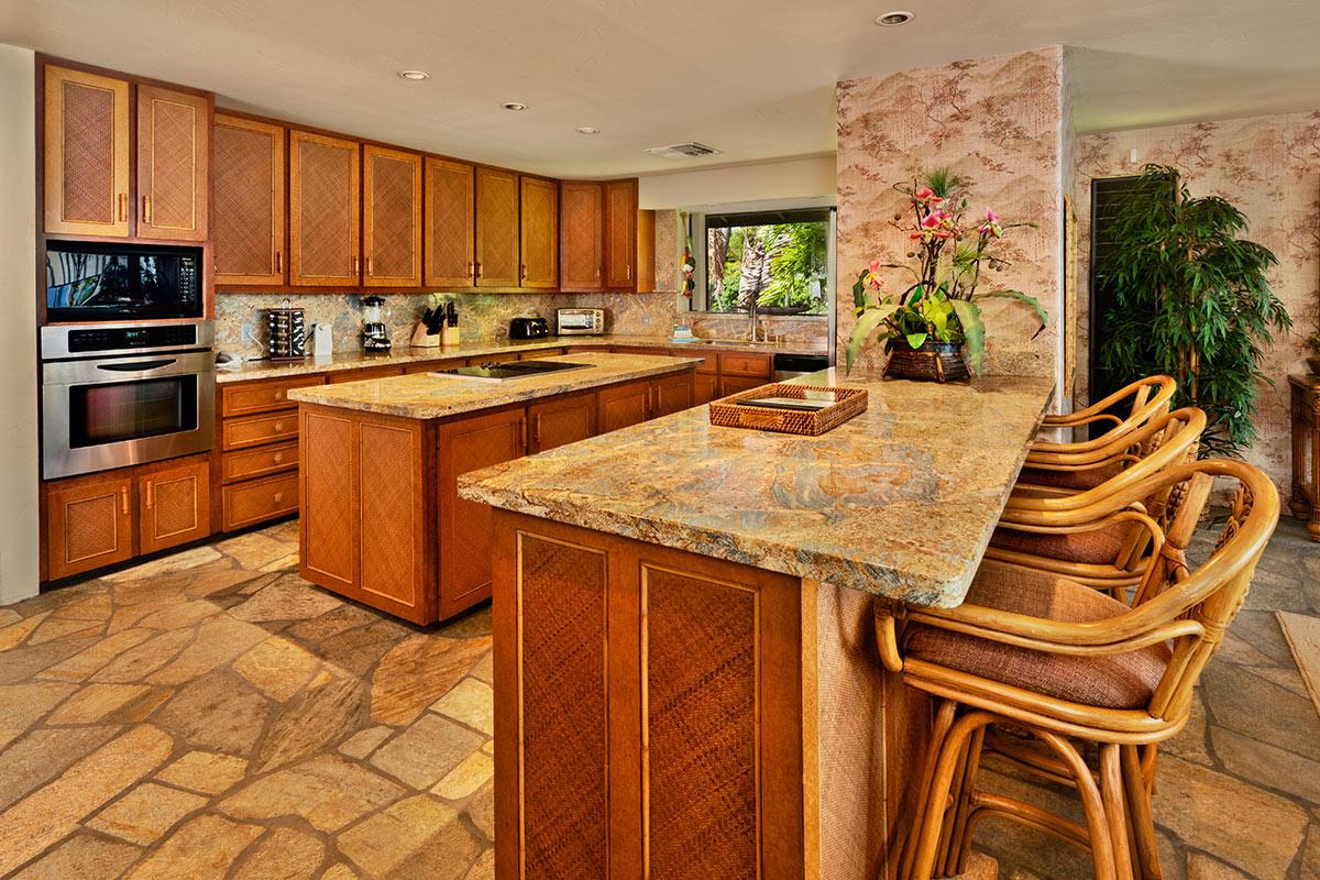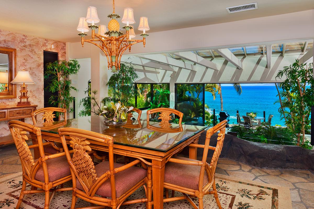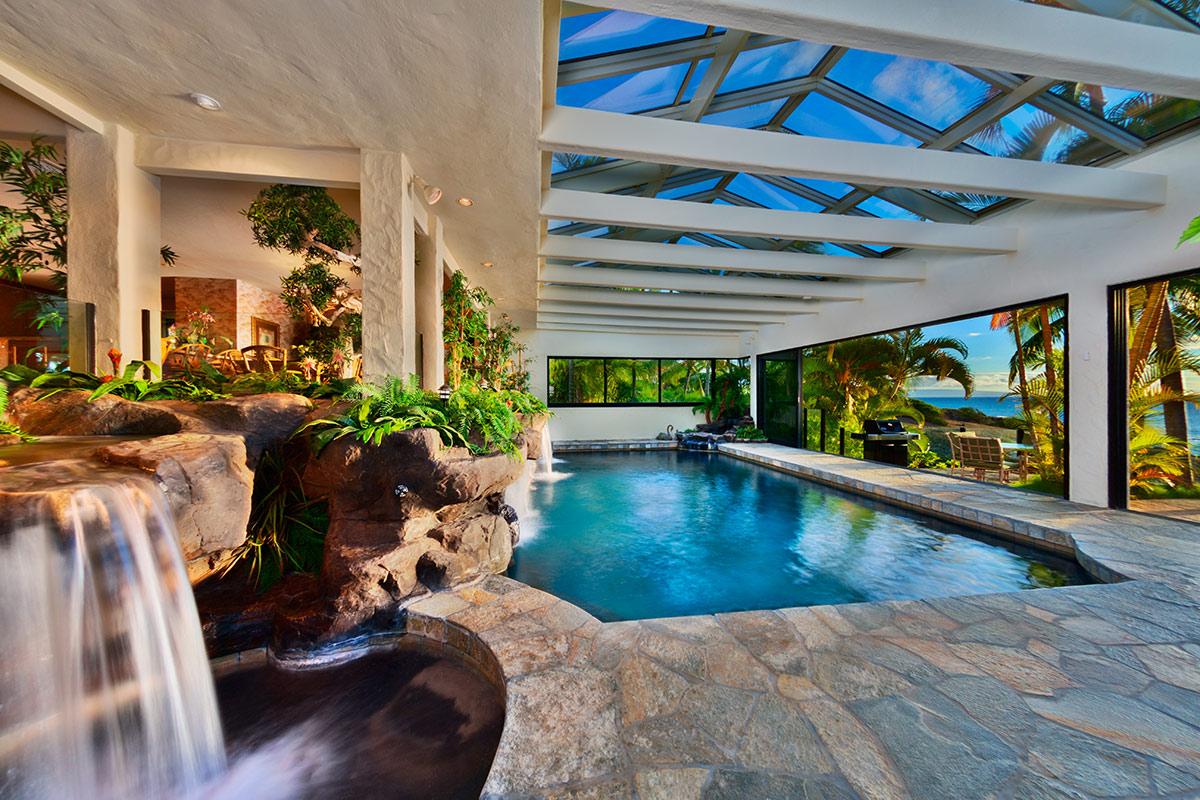 Function and design meld to create this distinctive Kapalua home with pool, waterfalls and Jacuzzi — all saline filtered NO chlorine smell — the water is soft and inviting! Situated for perfect indoor/outdoor use the pool and spa area has glass doors that slide away, opening your sanctuary to ocean breezes.