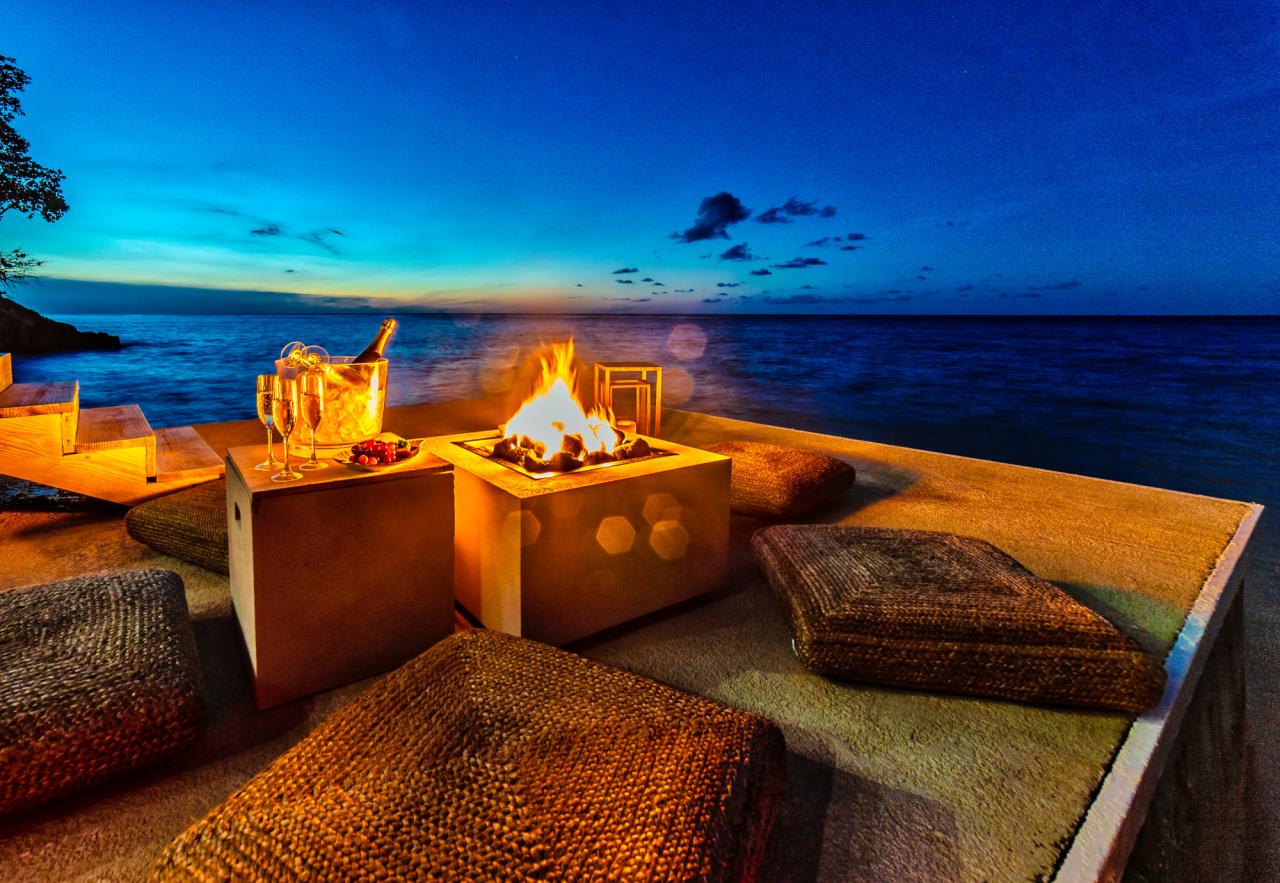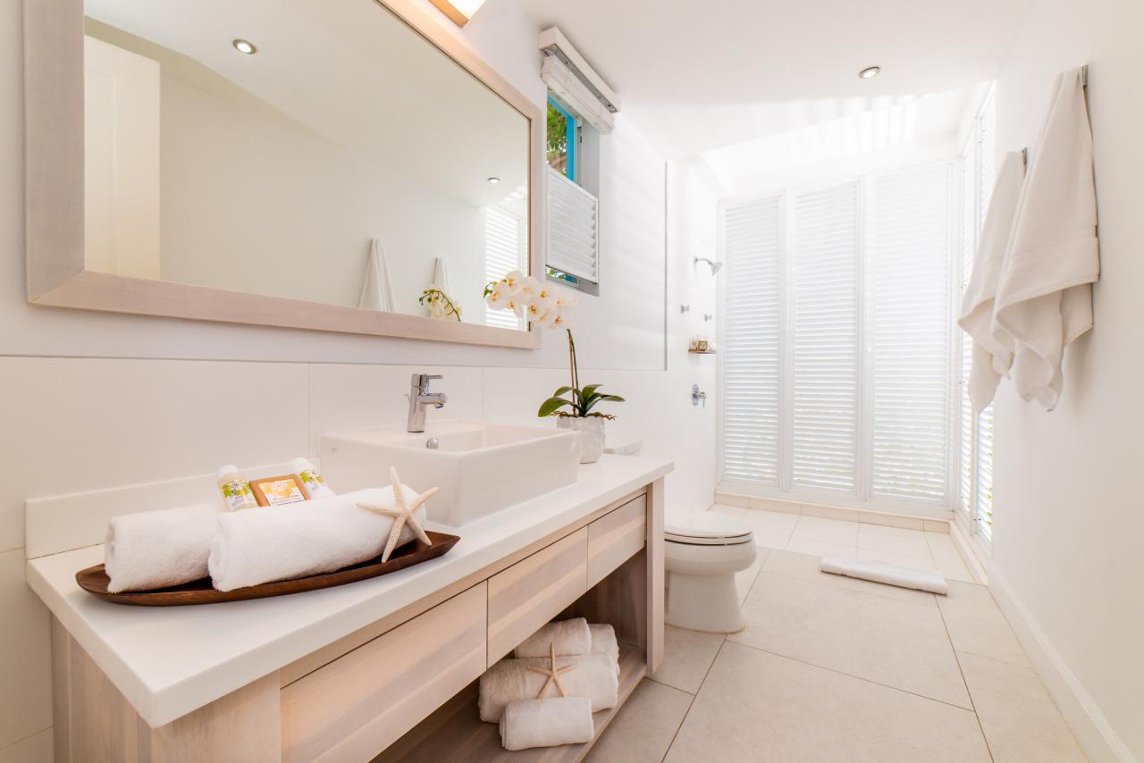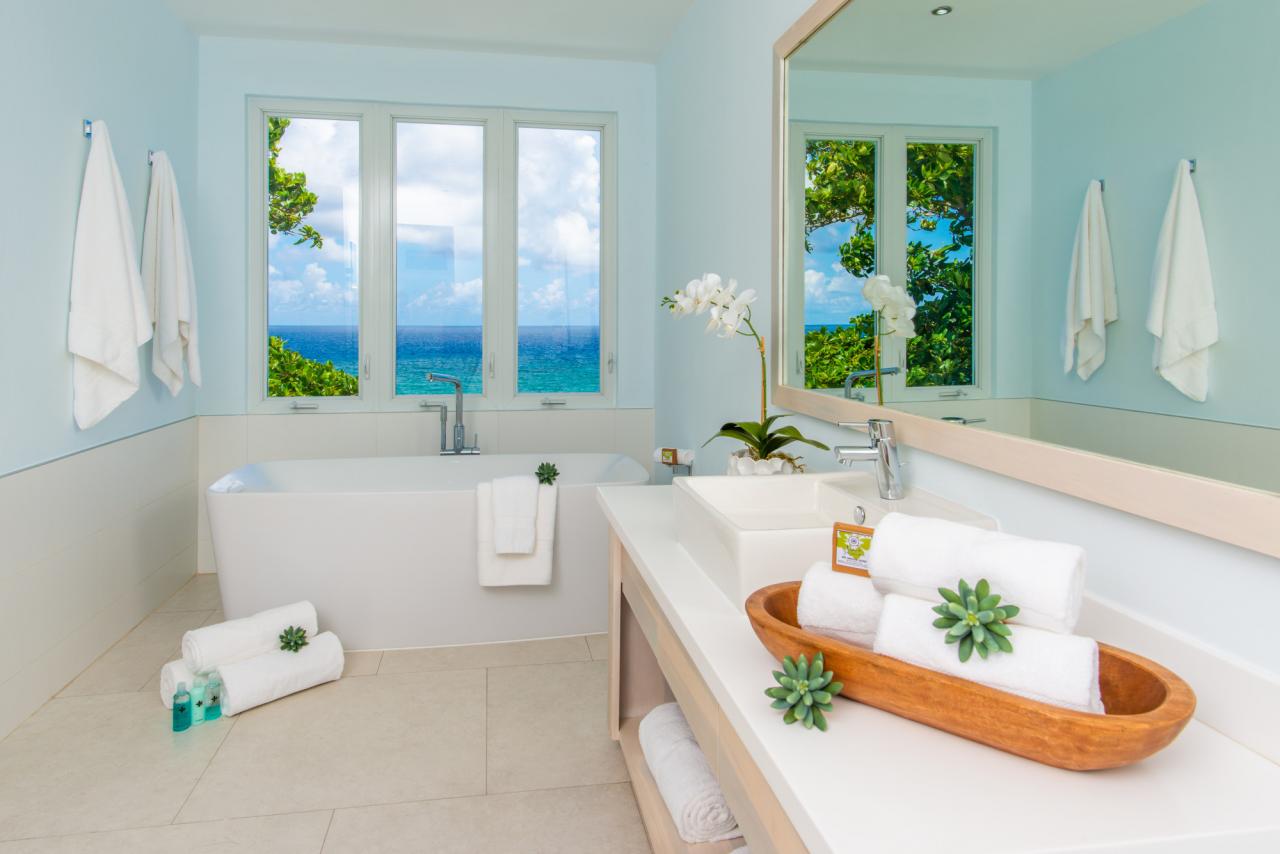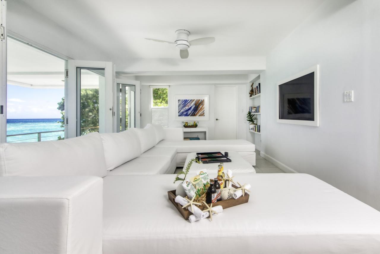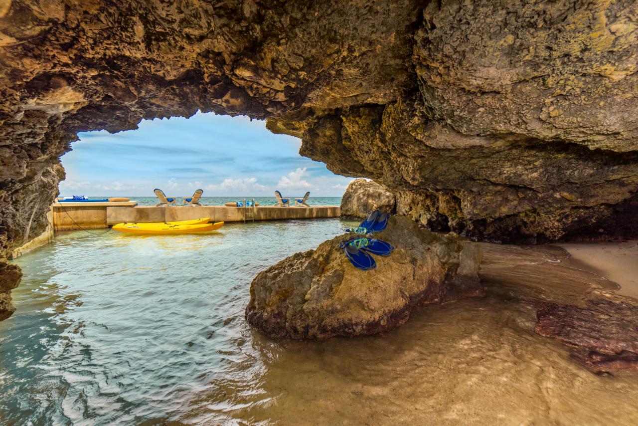 The Rocksteady Over the Water villa has much to offer guests. There are four bedrooms and four bathrooms to accommodate up to eight guests. Each bedroom has air-conditioning and there are personal safes and bathroom amenities. There is a staff composed of a butler, chef, housekeeper, and groundsman to help make the stay as relaxing as possible, personal laundry service can be provided with additional fees. The villa has wireless internet and a flat-screen TV in the media room. Moving outside there is much for guests to enjoy. There are multiple decks and outdoor seating areas with a lower deck with two ladders that provide easy access to the sea. There is a unique sea cove with a shallow area that is perfect for exploring along with kayaks and life vests. There is also a Yamaha sound system that is in all bedrooms and on the pool deck so guests can enjoy their music while enjoying their time at Rocksteady.