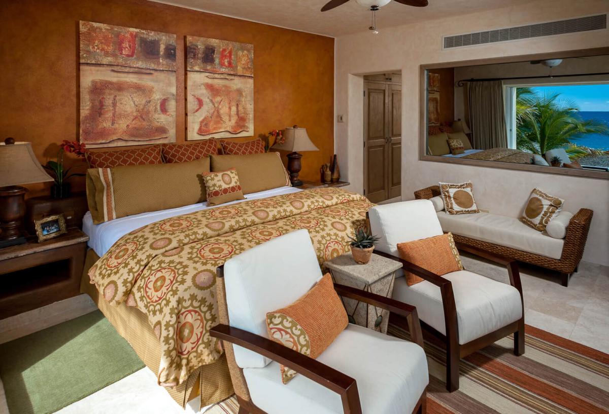 Bedroom 5: This room is equipped with a king-sized bed, a TV, an in-room safe, air conditioning, an ocean view, and a full bathroom.