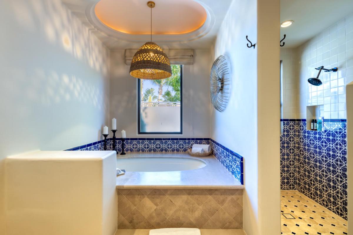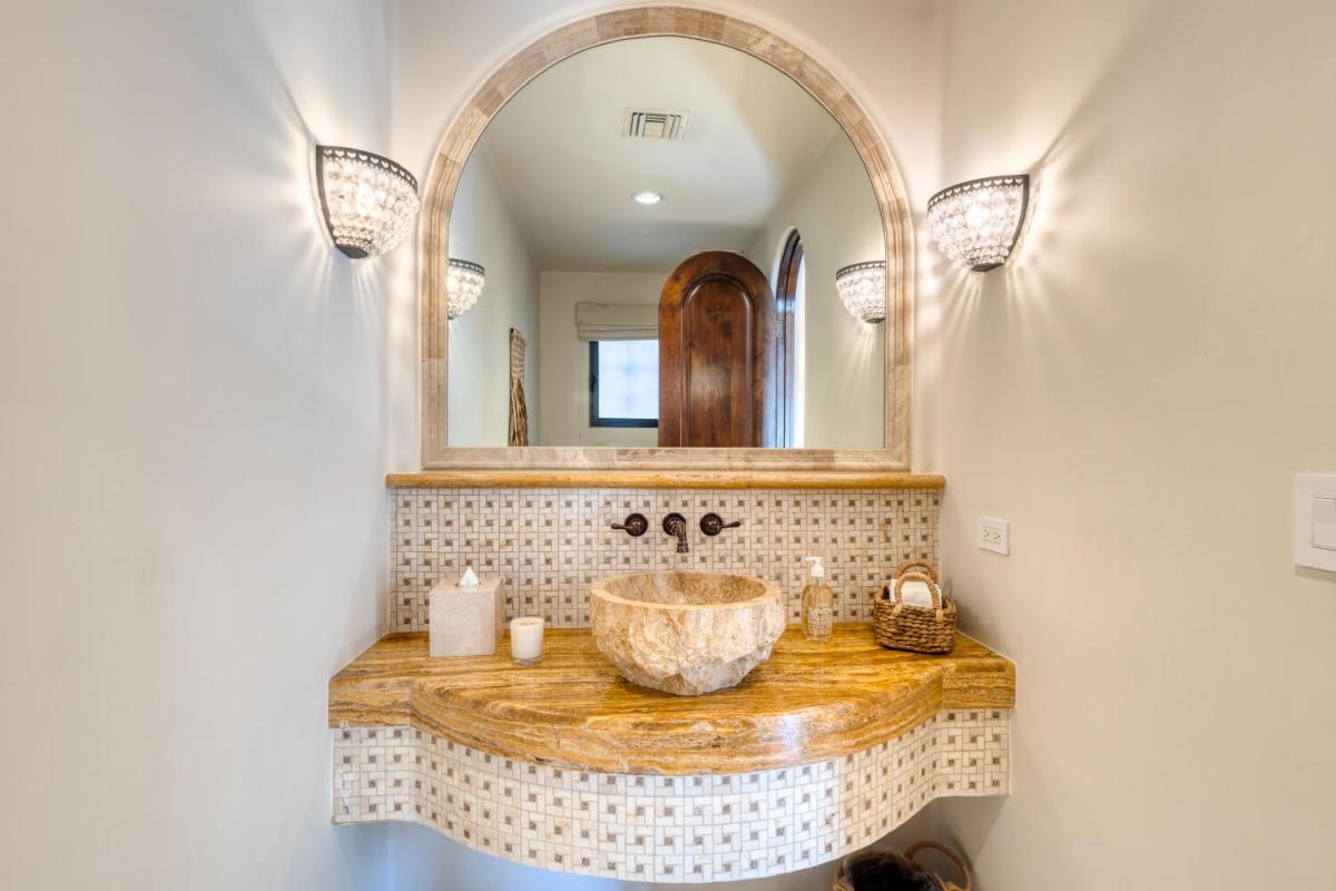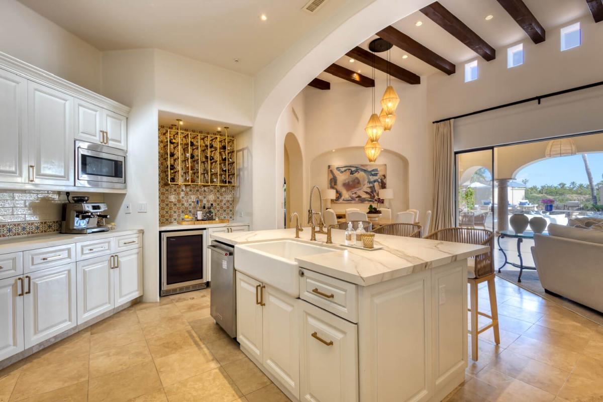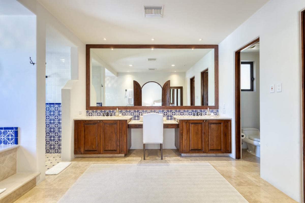 This Cabo villa rental has a beautiful open kitchen, elegant decor, and a dining area. Next to the kitchen is a lovely sitting room with couches and a smart TV, which gives guests a place to relax indoors. Five bedrooms can accommodate up to ten guests. The primary bedroom has a king-sized bed, access to the pool area, a private lounge space, and an amazing ensuite bathroom with a jacuzzi. The remaining four bedrooms all have ensuite bathrooms.