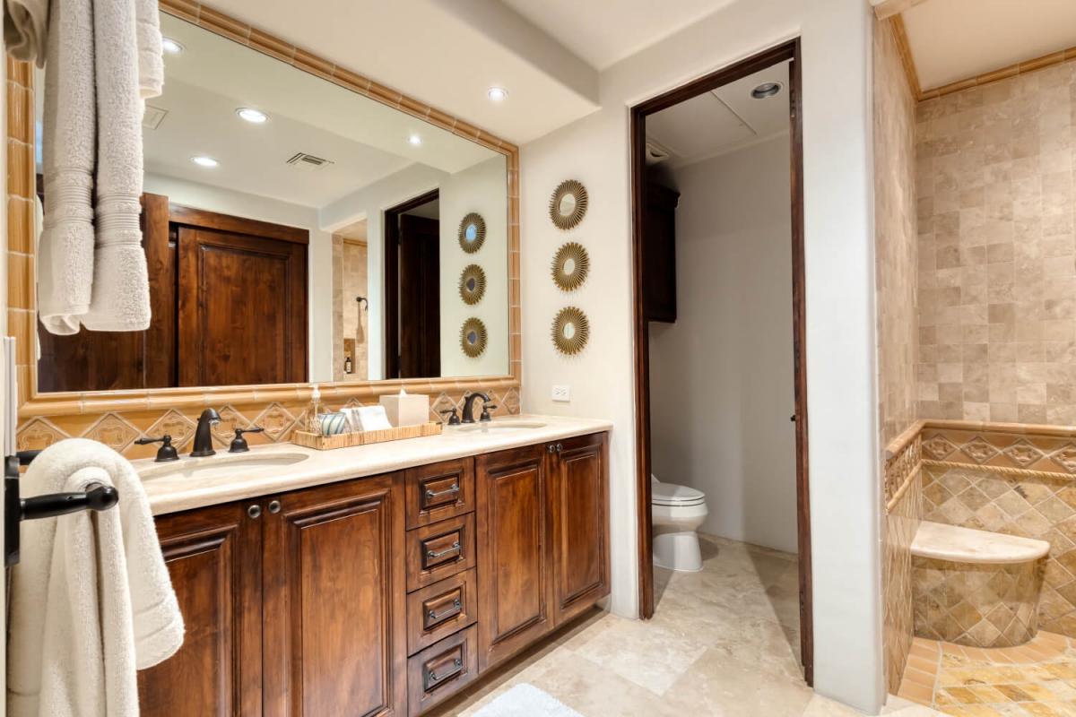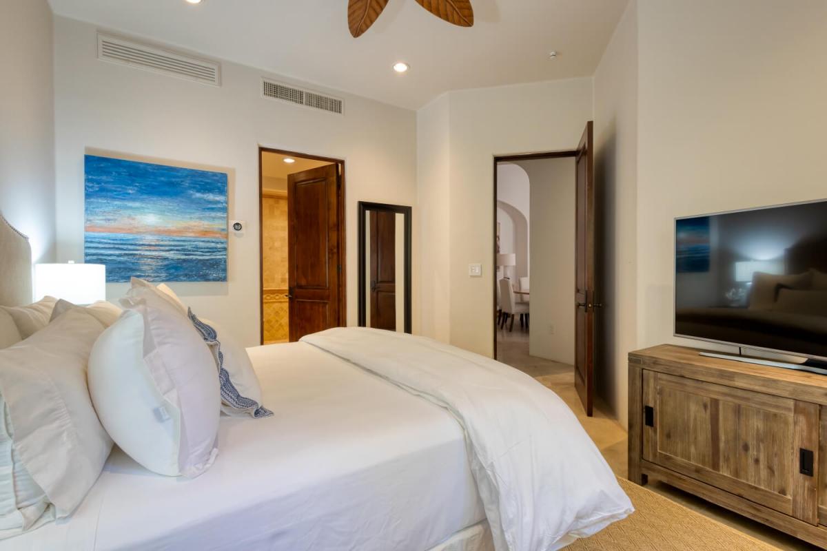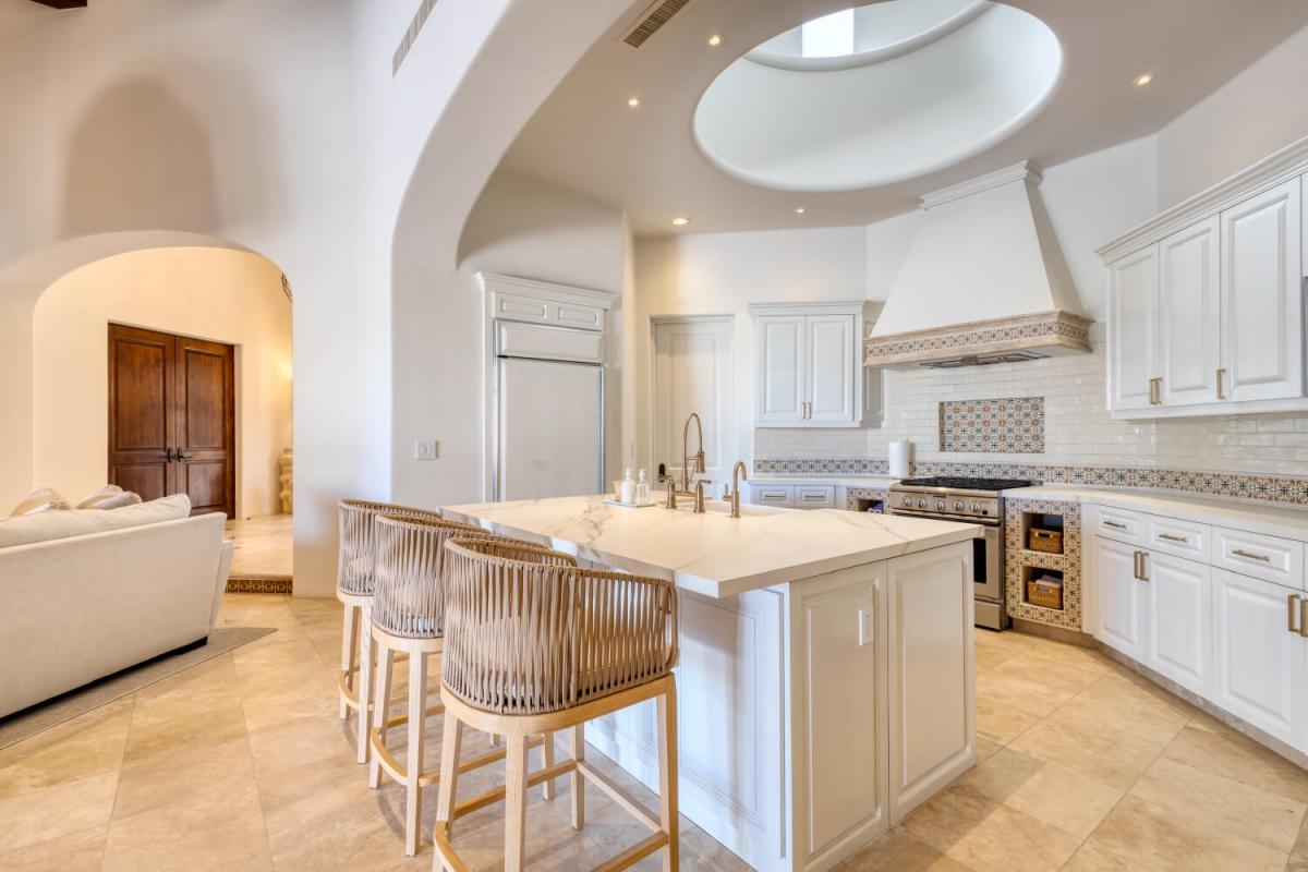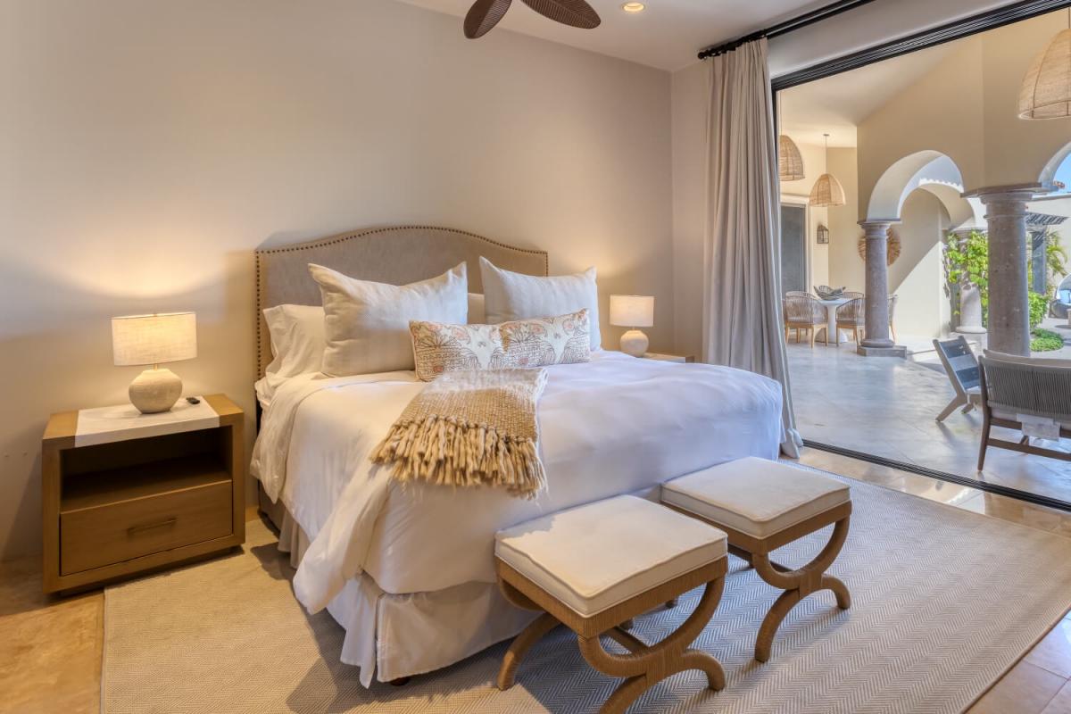 This Cabo villa rental has a beautiful open kitchen, elegant decor, and a dining area. Next to the kitchen is a lovely sitting room with couches and a smart TV, which gives guests a place to relax indoors. Five bedrooms can accommodate up to ten guests. The primary bedroom has a king-sized bed, access to the pool area, a private lounge space, and an amazing ensuite bathroom with a jacuzzi. The remaining four bedrooms all have ensuite bathrooms.