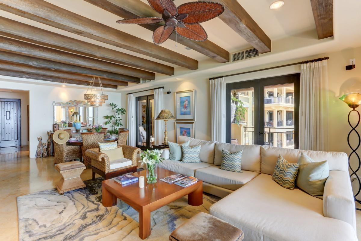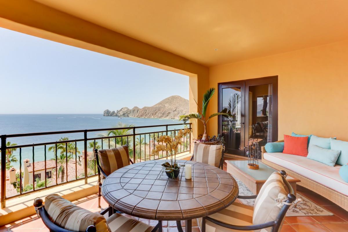 Welcome to Hacienda Tranquila located directly on Medano Beach right in the heart of Cabo San Lucas and just steps away from the Marina. Set in the midst of the vibrant energy of Cabo San Lucas, this newly decorated 2-bedroom, 2.5-bath residence offers a tranquil atmosphere and every comfort. This 4th floor unit is conveniently situated in Building 4 which is close to the Spa, pools and restaurant. En-joy breathtaking panoramic views of the Sea of Cortez and Land’s End from the living area and wrap around covered terrace (one of the largest in the resort).