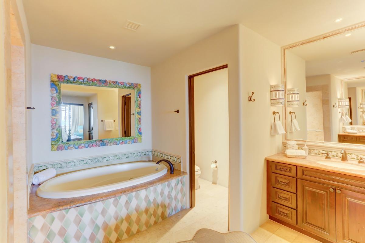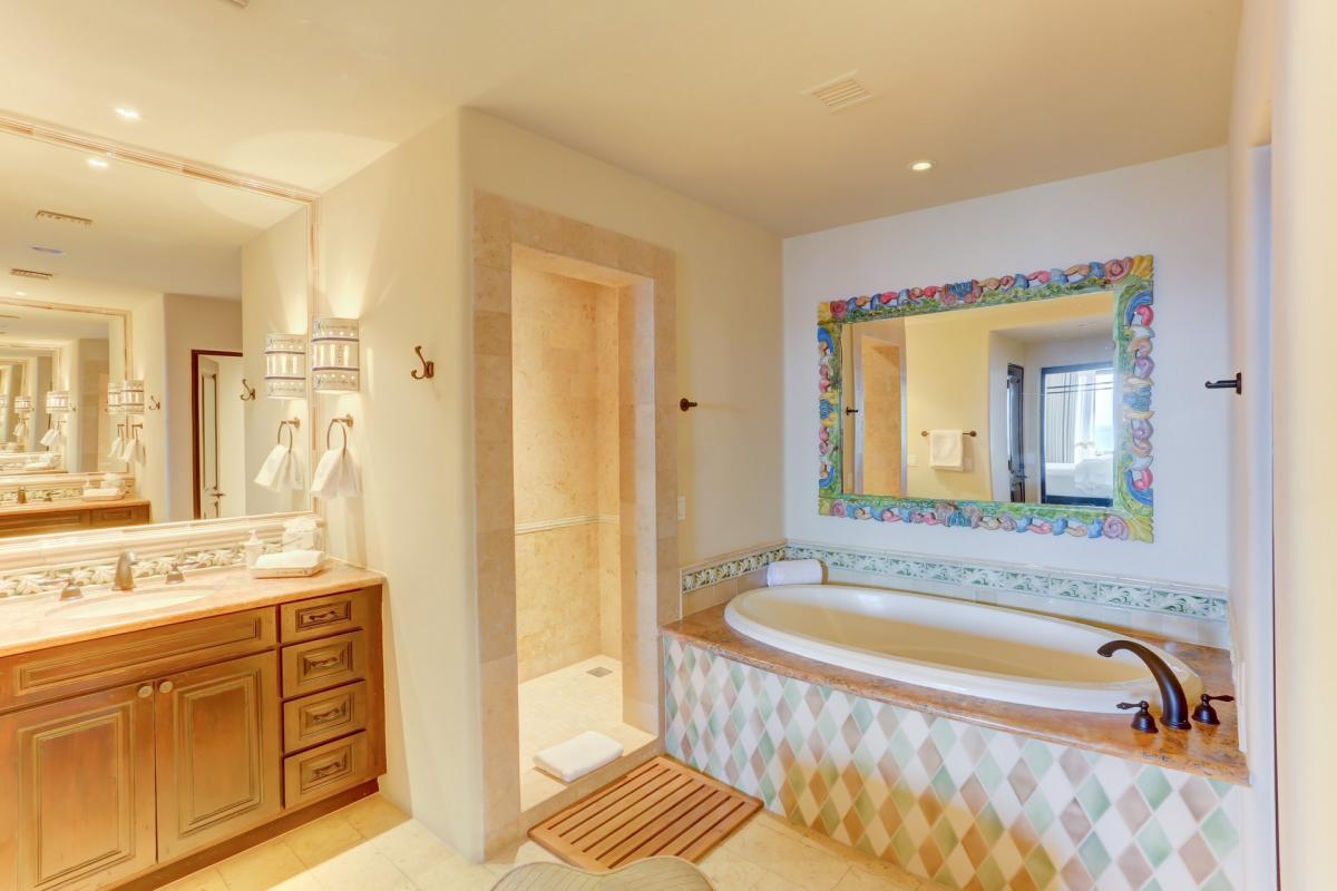 This luminous unit includes two California king bedrooms with en suite bathrooms. The master suite features stunning sea views and French doors that open on to the private terrace. The his & hers master bath features an over-sized jacuzzi tub and separate shower stall, and adjoining walk-in closet.