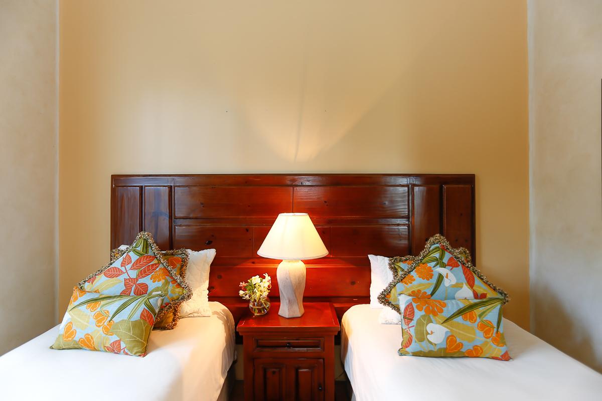- Bedroom 3: Two twin beds, en suite bathroom with shower, ceiling fan, AC, TV