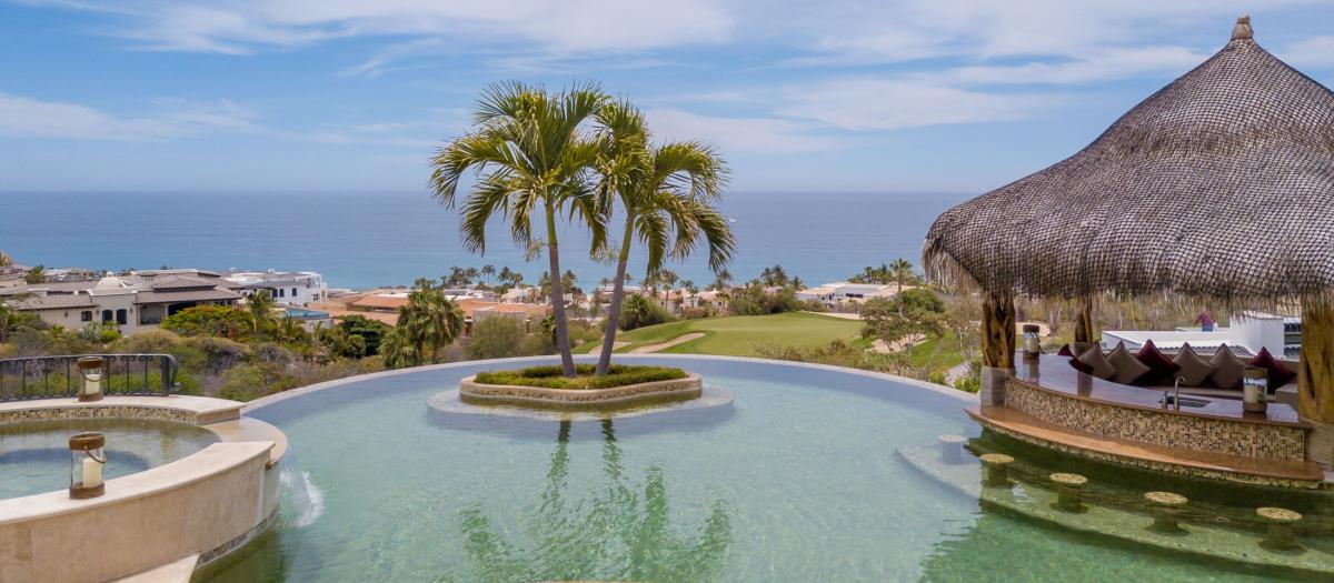 Located in Puerto Los Cabos, Villa Fondren is a Los Cabos villa offering a lavish retreat with breathtaking ocean views and top-tier amenities. Nestled in the gated Fundadores community, the six-bedroom, seven-bathroom villa provides a resort-like experience for up to 12 guests. The outdoor space features a stunning infinity pool with a swim-up bar, a jacuzzi, a firepit, and a shaded living area, all framed by palm trees and white arches, making it an ideal spot for relaxation and enjoyment