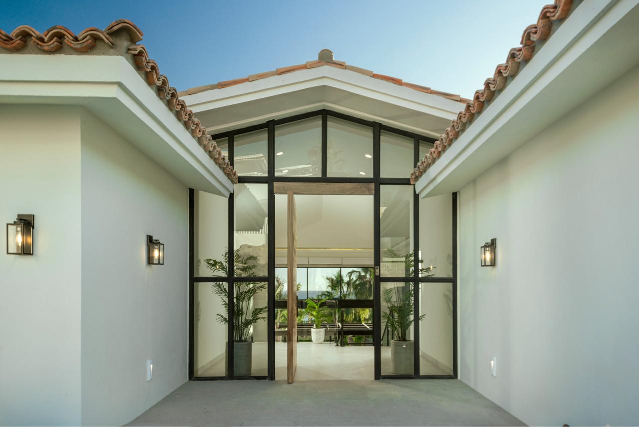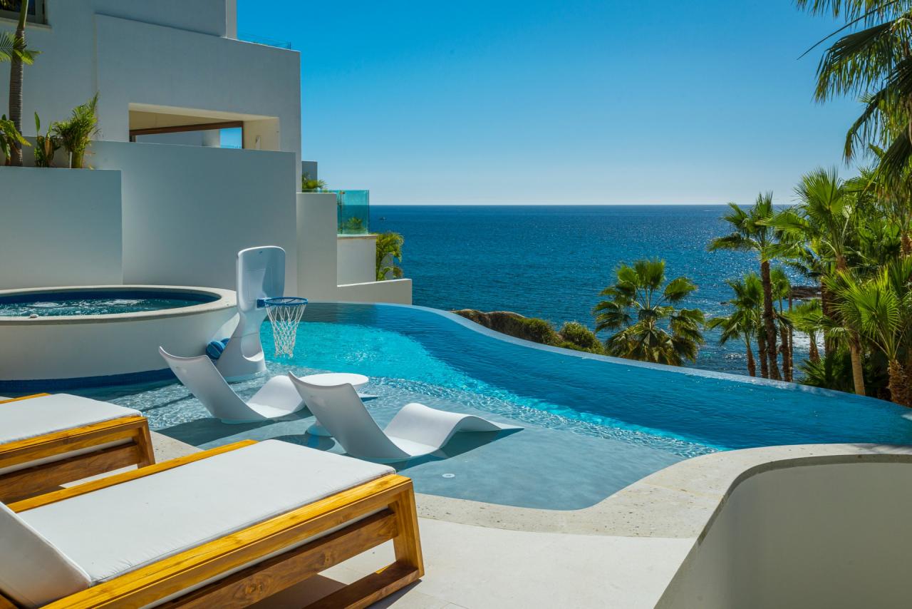 Villa Mareas is a luxurious five-bedroom villa retreat designed for sun-soaked fun and relaxation in Cabo San Lucas. This Los Cabo villa offers private, spa-like ambiance with opulent features such as a double-height sunken living room, gourmet kitchen, and walls of glass that blend indoor elegance with stunning outdoor views. Accommodating up to 10 guests, the villa boasts a partially shaded main pool deck, complete with a sunning pool, Jacuzzi, outdoor grilling area, and a conversation space. Guests can enjoy cocktails at the outdoor bar or dine inside, surrounded by sophisticated touches like a marble dining table, a sleek kitchen island, and chef-caliber appliances. Family-friendly amenities include a stereo system, pool basketball, and palm-framed vistas of the ocean and sunset.