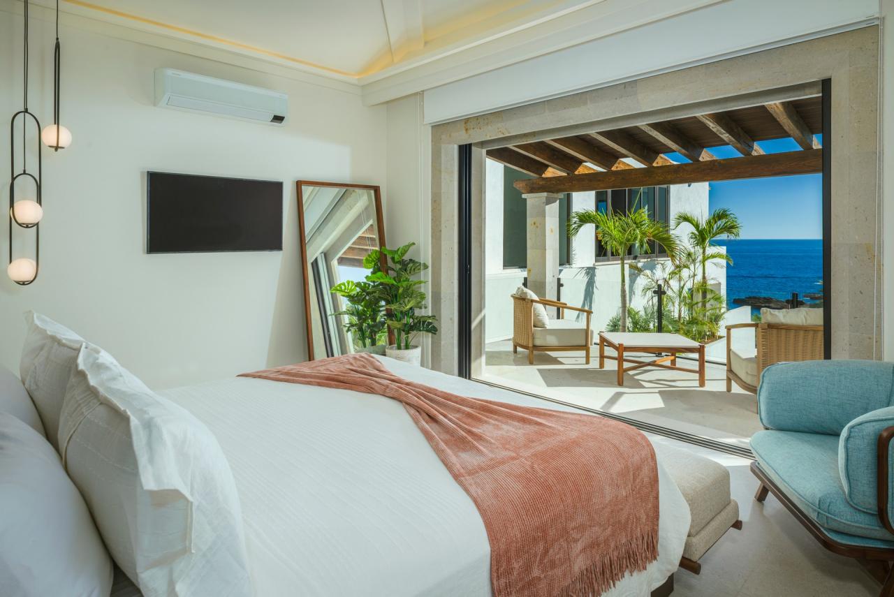 Inside, entertainment and wellness are at the forefront, with offerings like a 100-inch cinema screen, Apple TV, Netflix, video games, and a Crestron/Sonos home system. Guests can unwind in the home theater, wine cellar, or wet bar, or rejuvenate with the indoor jacuzzi, massage table, gym, sauna, and steam room. Each bedroom at Villa Mareas features a king-sized bed, private terrace access, and zoned air conditioning. Nestled in a gated community with panoramic views, Villa Mareas provides both privacy and proximity to Cabo San Lucas’s nightlife, beaches, and golf courses. Whether snorkeling, exploring the marina, or indulging in the villa’s comforts, guests are sure to experience the ultimate Los Cabos vacation.