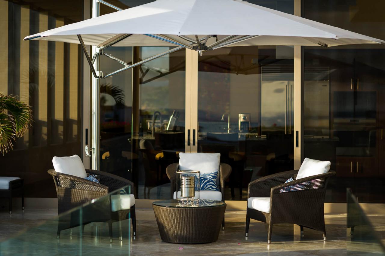 The villa has massive glass windows that offer ocean views from every corner of the open-concept living and dining area. The windows open out onto the main terrace, where guests can grill on the deluxe gas BQQ and dine outside under the stars on the outdoor table. The terrace also has white umbrellas, lounge beds, and casual seating areas where guests can relax. The main terrace also has an infinity-edge pool.
