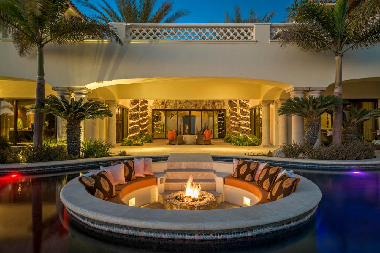 Villa Sandcastle is a stunning home away from home located in the exclusive gated community of El Encanto. This luxury Cabo San Lucas rental also boasts stunning views of the azure waters of the Sea of Cortez. November through April guests might catch a glimpse of whales swimming by. Outdoors at Villa Sandcastle, the sunken fire pit in the middle of the pool is the perfect place to lounge, day or night!