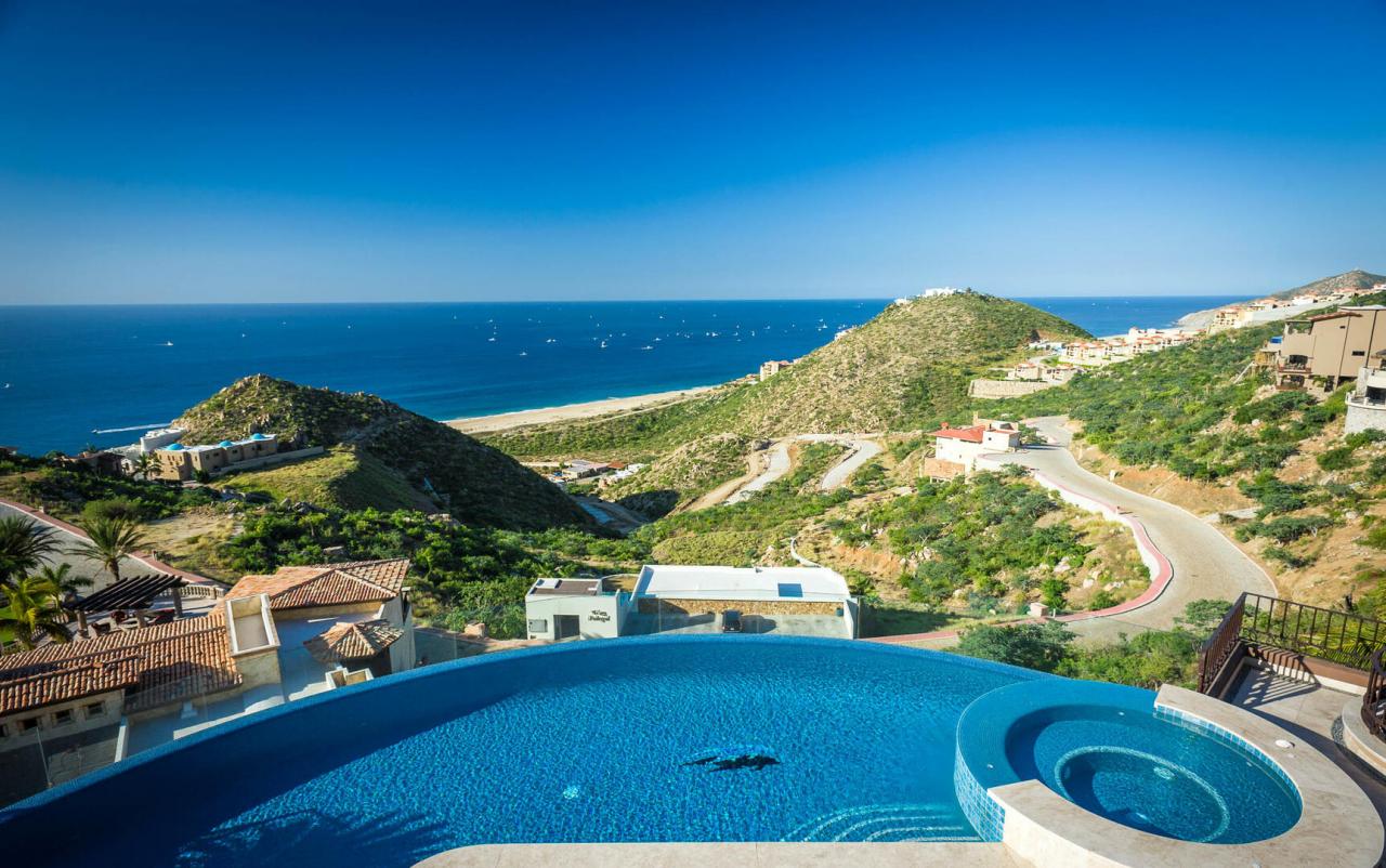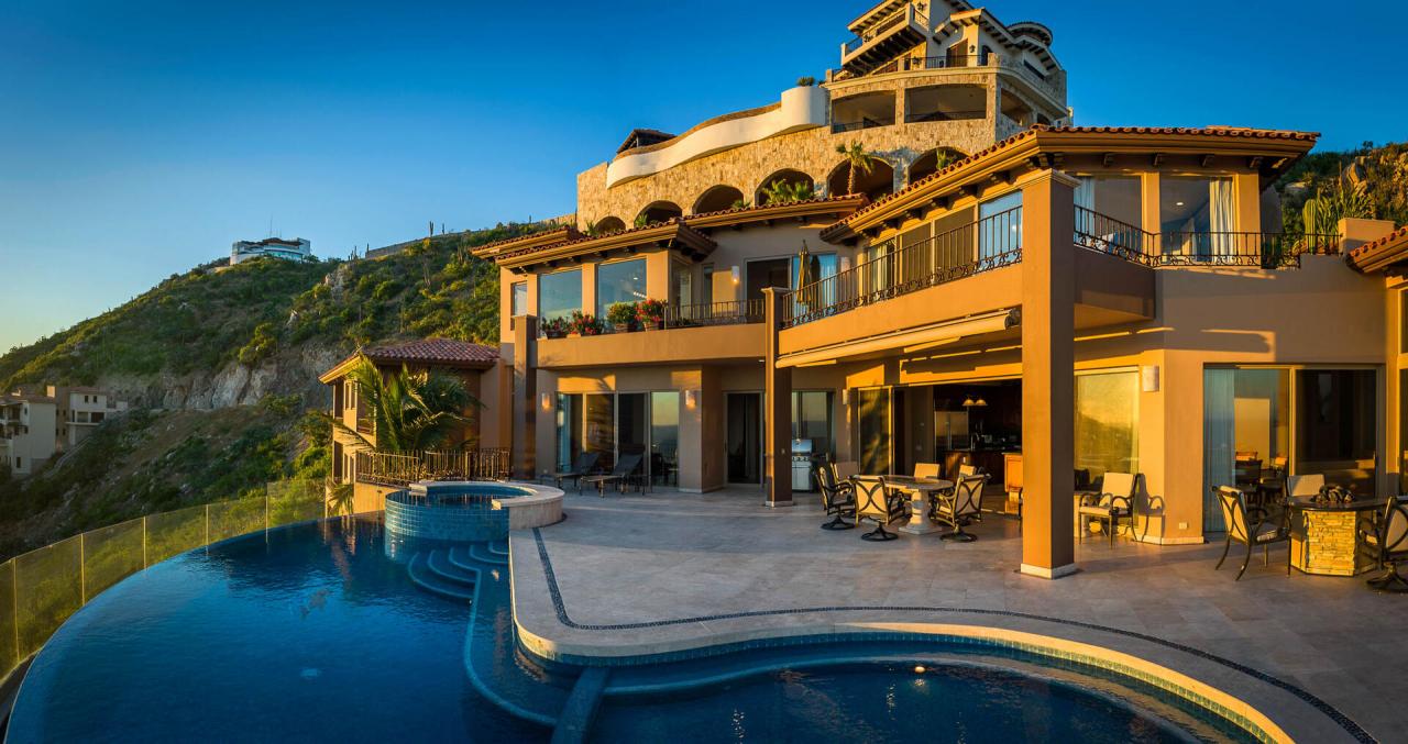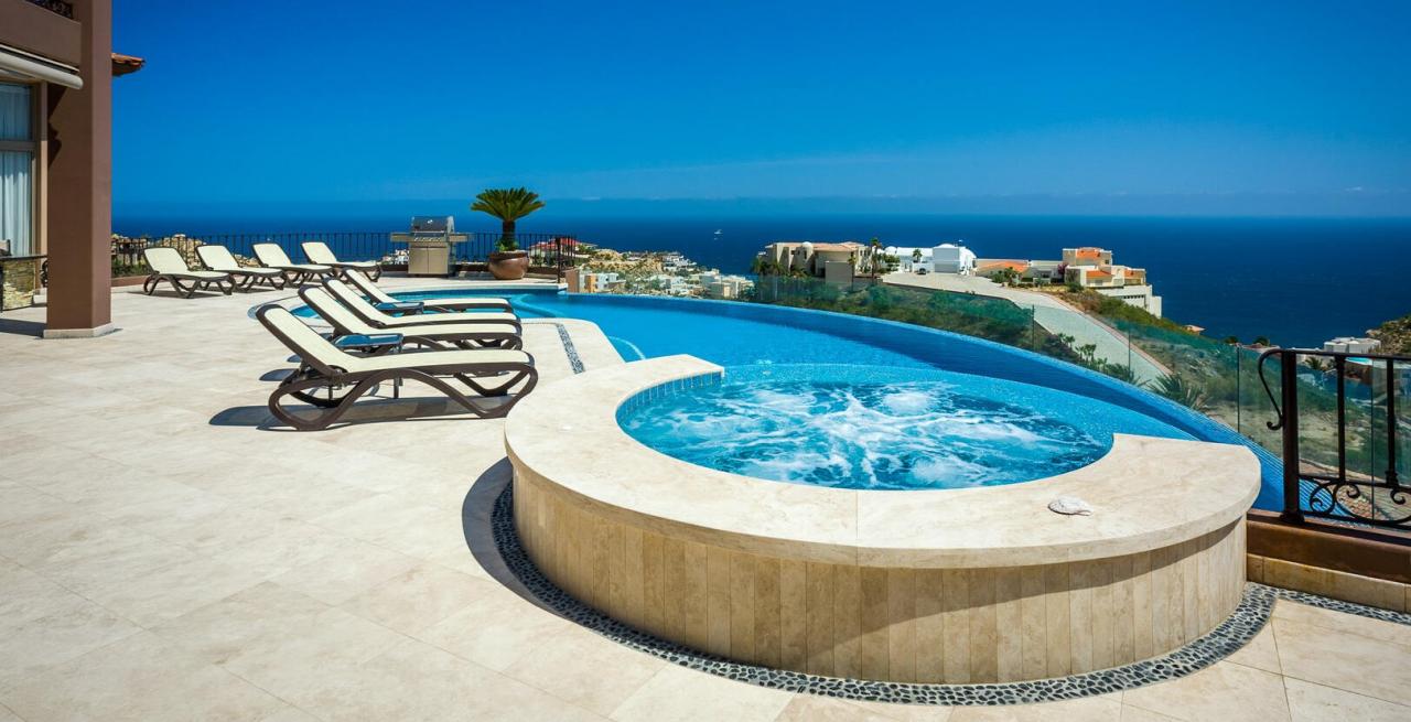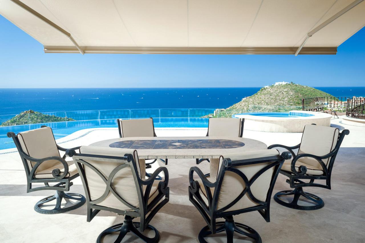 Tucked into the hills overlooking Pedregal Beach, this 10-bedrrom Los Cabos luxury villa blends upscale luxuries with high-end appeal. With multiple levels of the home and its outdoor spaces to choose from, there's no need to compromise. Each terrace boasts its own lavish features. Open the sliding glass doors for a seamless indoor/outdoor experience. This terrace includes lounge space and gently rocking hammocks, perfect for peacefully taking in the sand and water views below. The main, sun-soaked terrace features a refreshing infinity-edge swimming pool and Jacuzzi, both with commanding water views. The outdoor space is equipped with eight deck loungers, multiple seating and dining areas, a gas BBQ, an outdoor stereo system, and a fire pit.