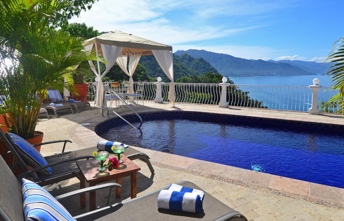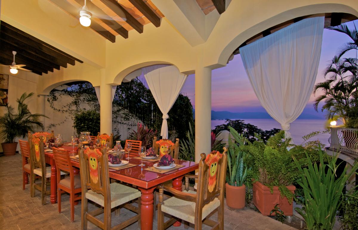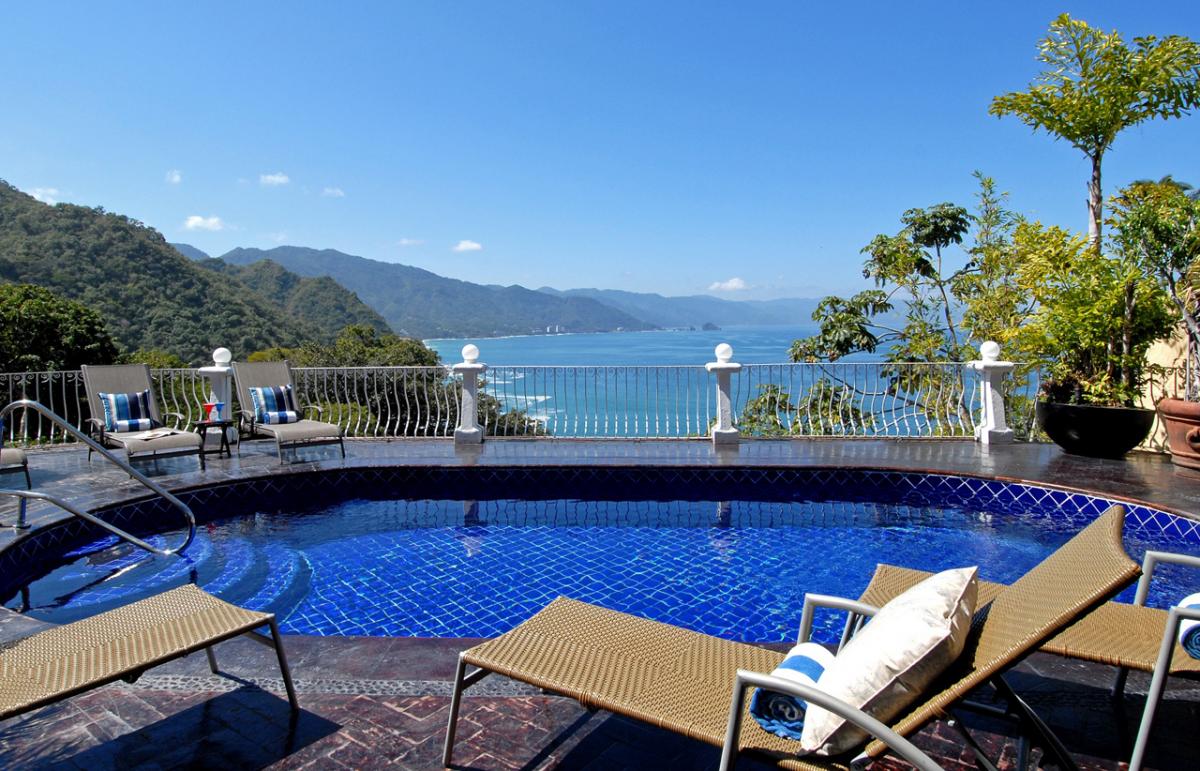 A spectacular 6 bedroom villa set on a quiet cul de sac in upper Conchas Chinas, Casa Aventura is within a short walk to the beach and only a 5 minutes drive from the charm and energy of downtown Puerto Vallarta. Casa Aventura is a multilevel 7000 sq. ft villa that has breathtaking views of the rugged jungle covered south coast including Los Arcos. Casa Aventura includes 3 separate living areas and with multiple terraces. There is space and privacy even for large groups. Casa Aventura is child friendly and welcomes events such as weddings and special celebrations. The main level has a large heated pool and a lower terrace has a large jacuzzi. Casa Aventura is decorated in a sophisticated contemporary style with splashes of color and Mexican artisania, surrounded by lush tropical flowering gardens.