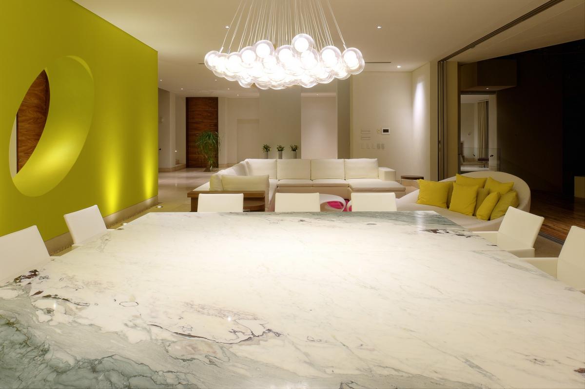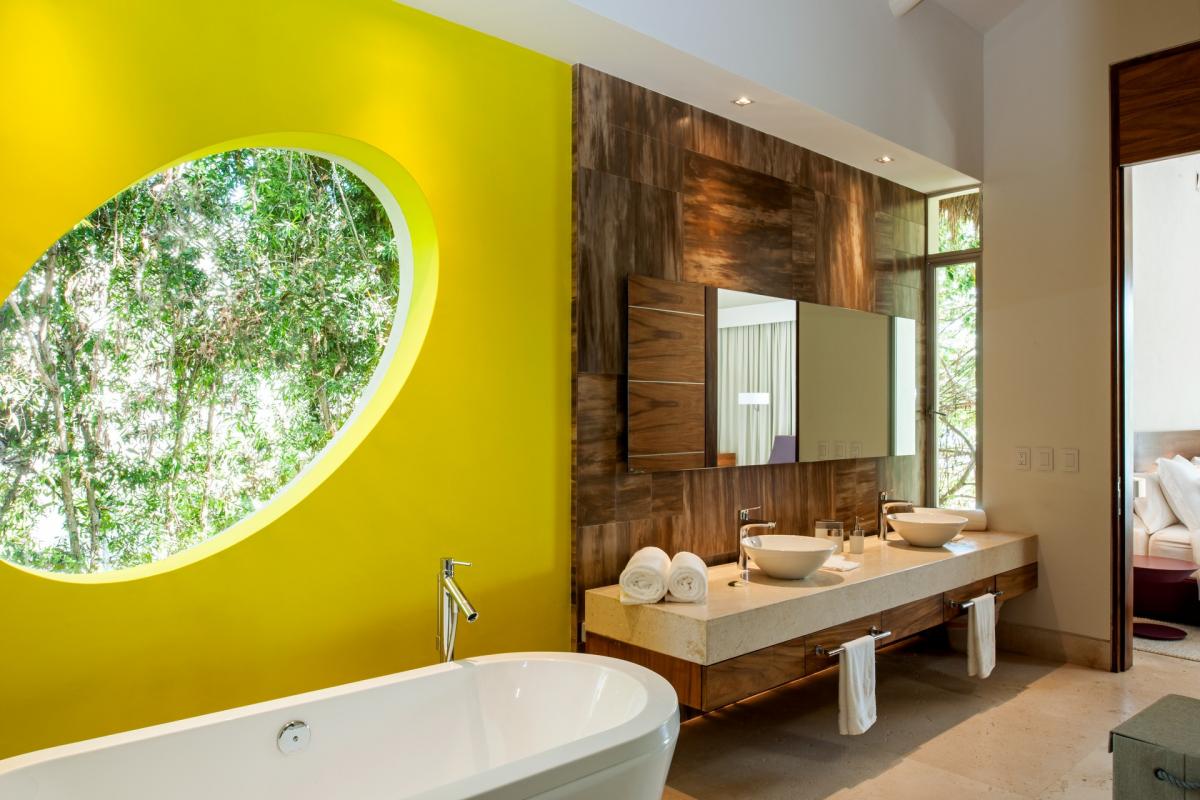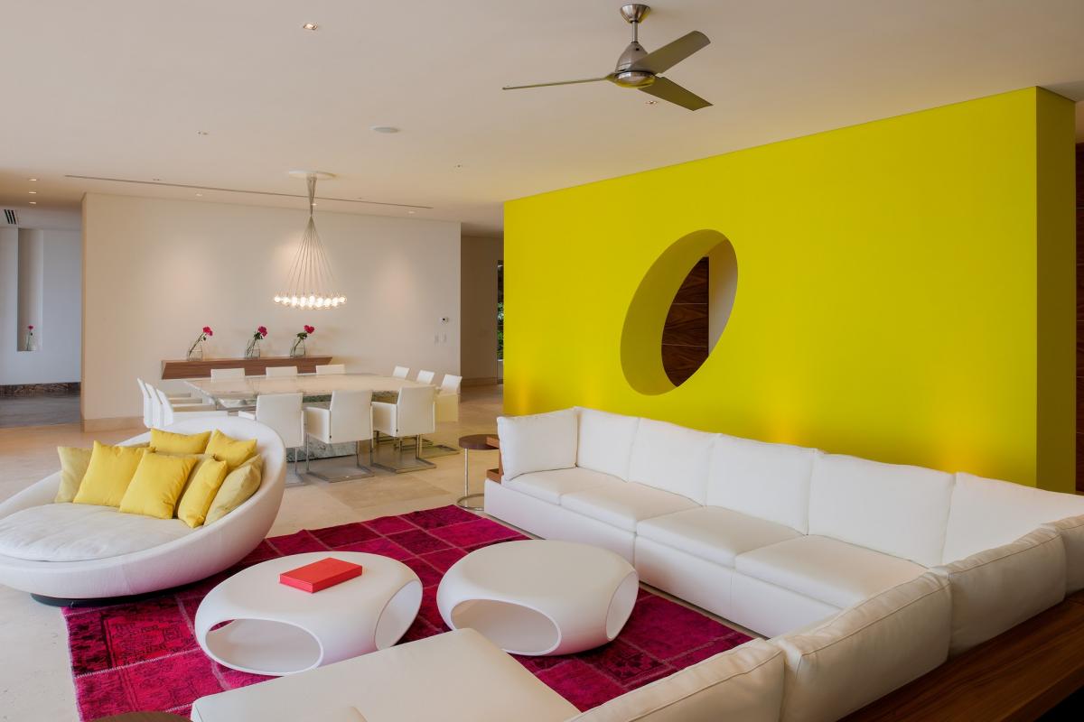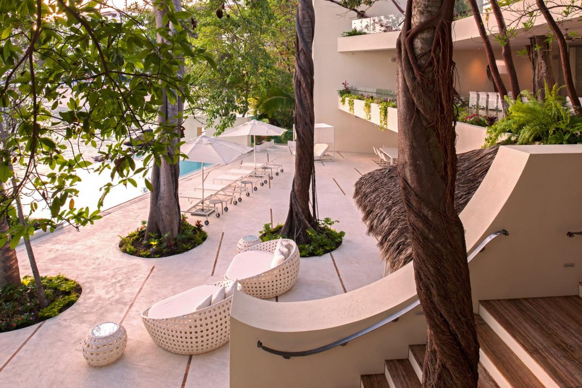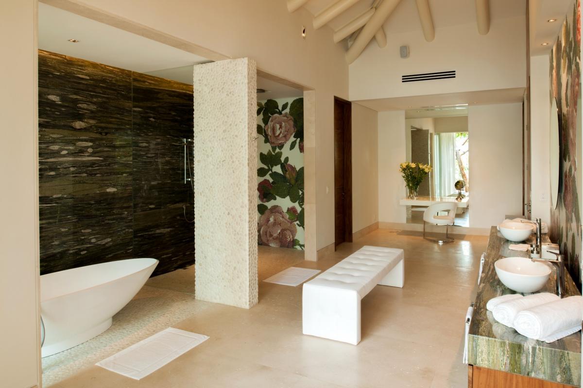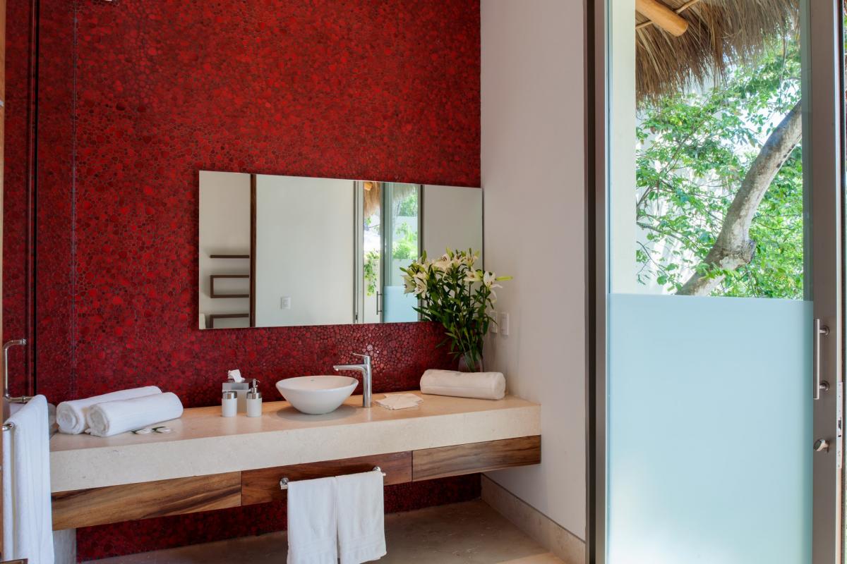 Casa Papelillos is a unique mix of sleek contemporary furnishings and natural features. Trees growing through the oceanfront balconies have been left intact, making the open-plan living areas feel as though they’ve grown out of the landscape. In the living room, clean-lined white seating is cool and modern, while pops of color like a red carpet and yellow cushions add a whimsical touch. A statement stone dining table has room for twelve, and the fully equipped kitchen has a spacious breakfast bar.