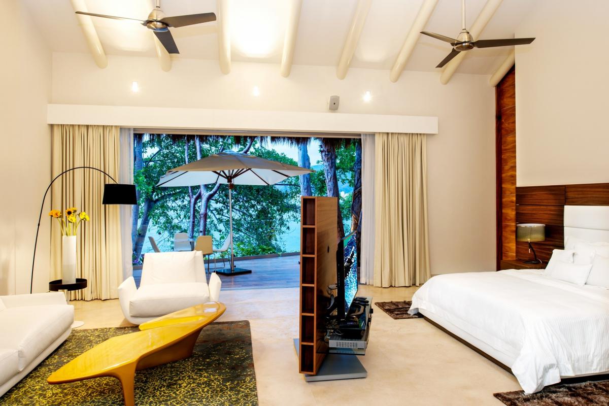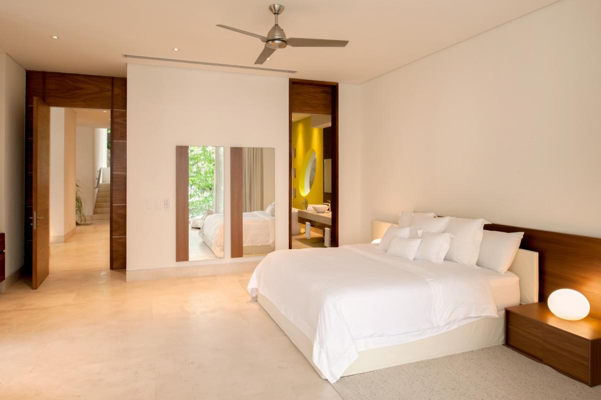 Bedroom 1: Primary with king bed, en suite bathroom with shower, bathtub and bidet, in room air, ceiling fans, TV, Blueray DVD player, sound system, telephone, interphone, safe, walk-in closet, access to terrace, ocean view
