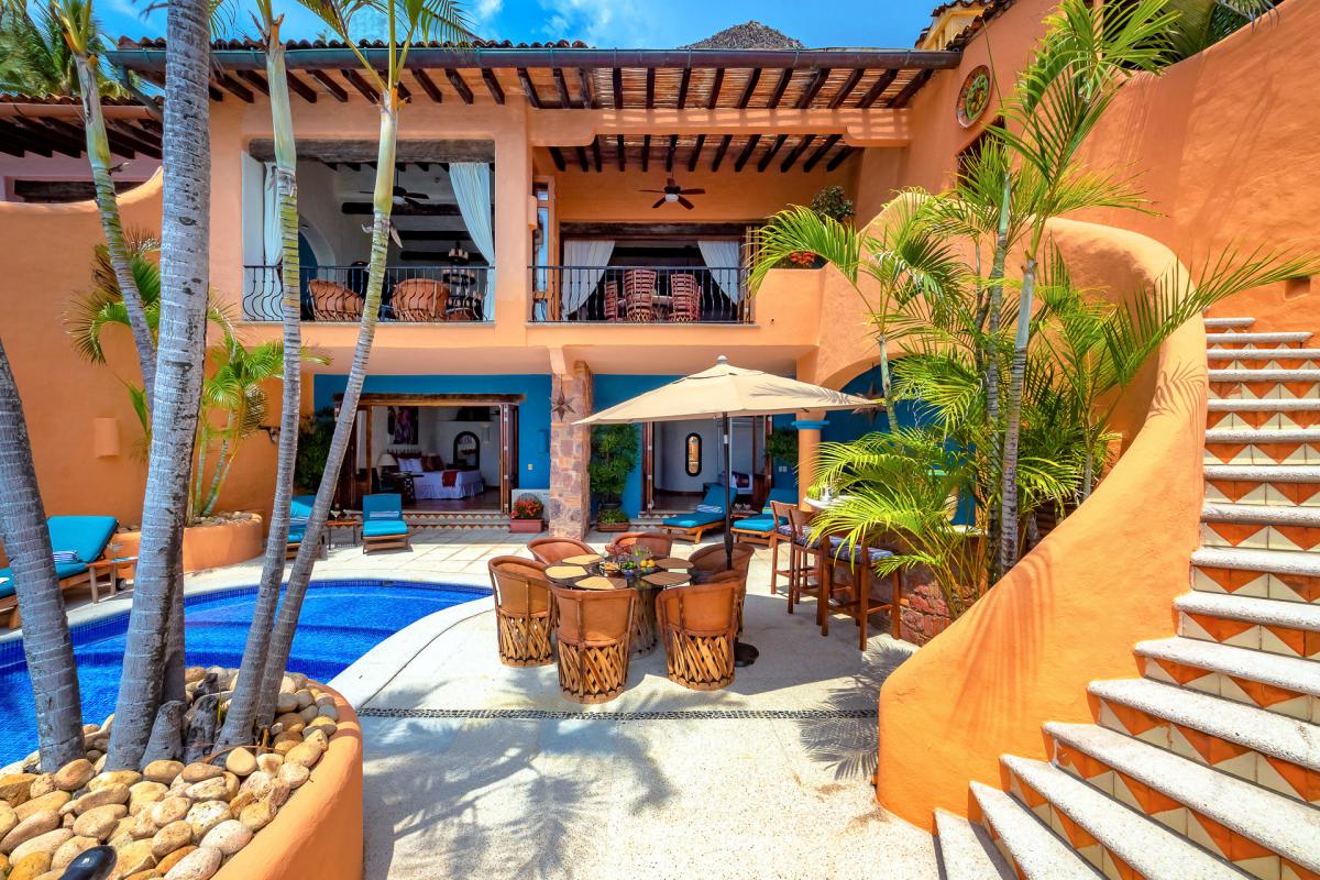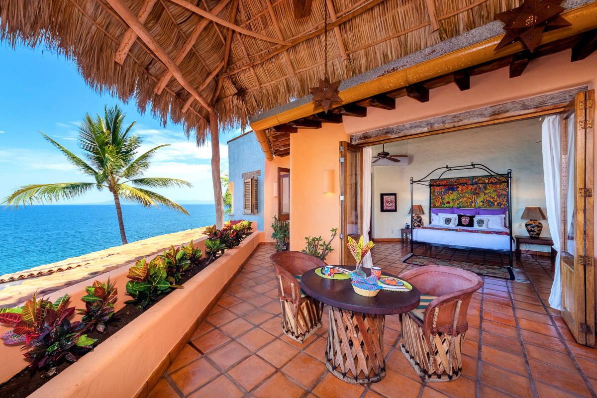 Three capacious bedrooms with en-suite bathrooms and air conditioning accommodate up to six guests at Villa Azul Celeste. The master suite on the second floor is spectacular with a king bed, decorative fireplace, large bath and a cupola shower overlooking the sea. A palapa off the master suite offers a great place to sit with your morning coffee, a great book or an evening cocktail as you watch the sunset.