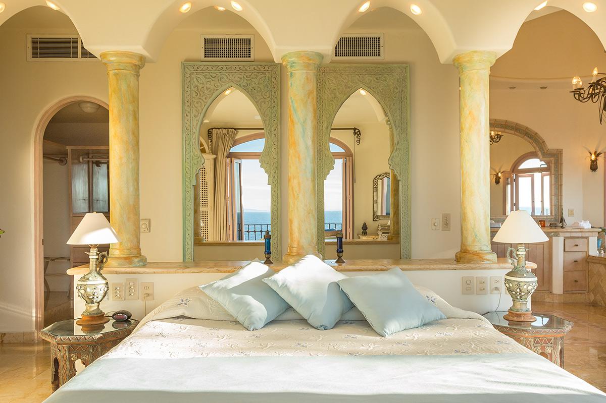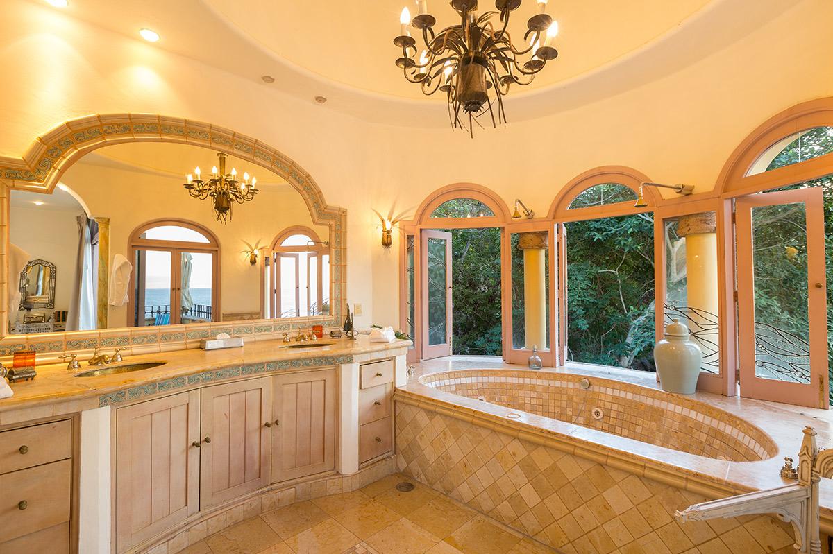 Magnificent Villa Luna Creciente is perched oceanfront into the hillside of Puerto Vallarta’s south shore. Marble floors throughout and a grand staircase from the entrance to the main living area highlight the Mediterranean architecture. Enjoy the spectacular views of Los Arcos from the almost every room in the home or from one of the many terraces or stick your toes in the sand on the private man-made beach.