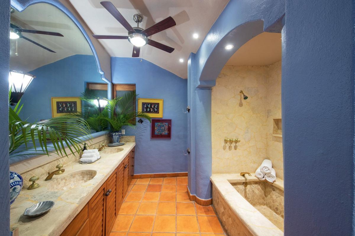Villa Marea Alta is part of a 2 villa walled complex, the 2 villas are designed to be completely private & self-contained, just sharing the common elevator to the lower level for Beach Access for Marea Alta & access to the main entrance of Villa Mara Baja. The names of the villas translate as High Tide (Villa Marea Alta) and Low Tide (Villa Marea Baja). Villa Marea Baja the lower villa is closer to the beach & Villa Marea Alta the upper villa is a bit more private looking across the romantic architectural details of the cupulas on the rooftop of Villa Marea Baja.