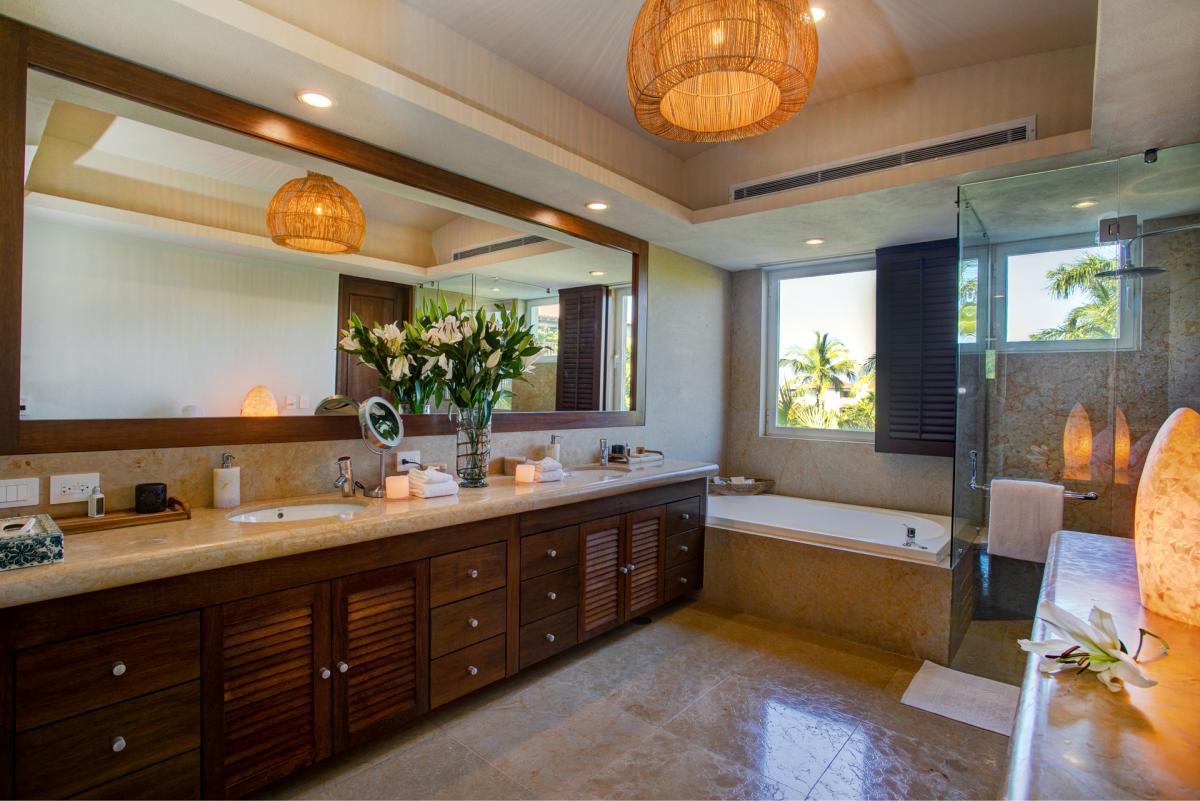 MASTER SUITE: 1 king-size bed. Smart TV. Business desk. A/C. Ceiling fan. Private bathroom with Jacuzzi tub, rain shower. Walk-In closet. Large terrace area. Luxury hotel bed and bath linens. L’Occitane toiletries.
