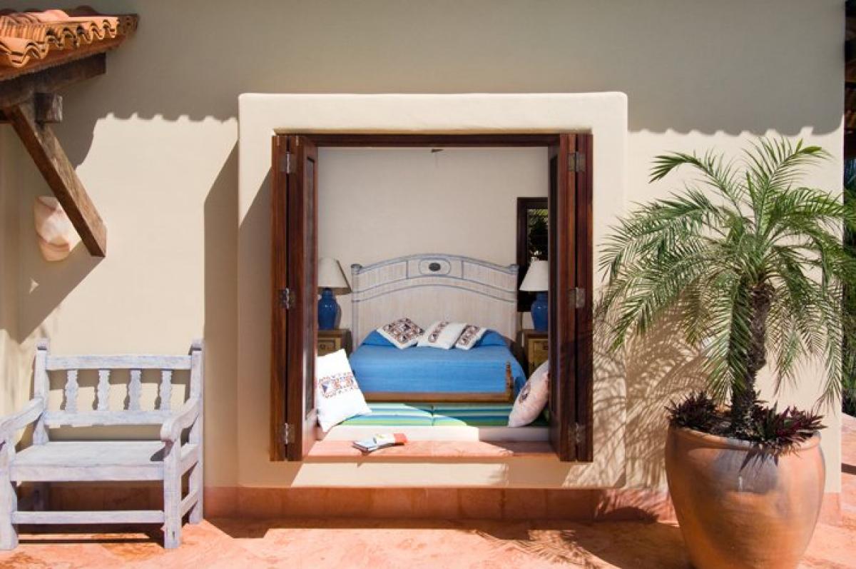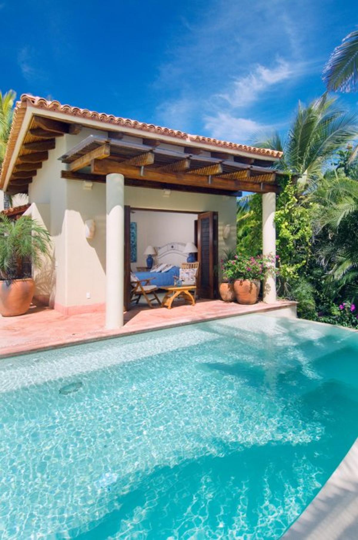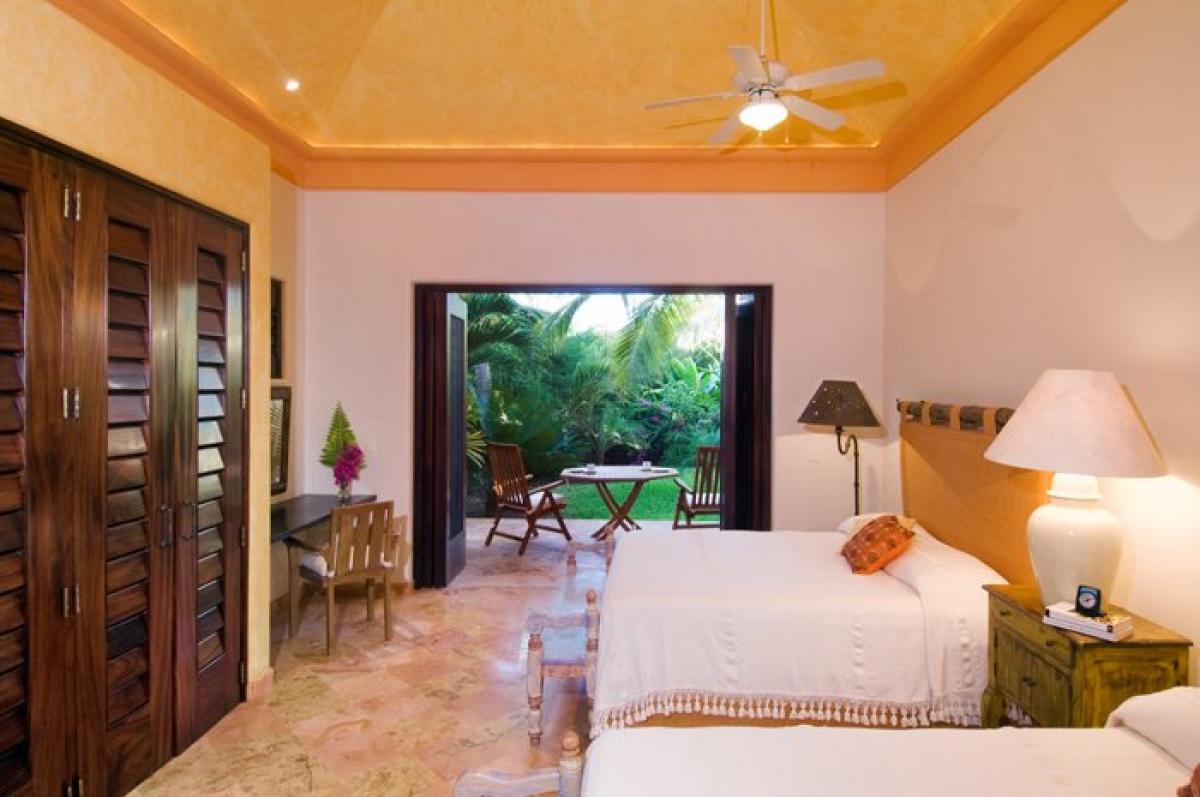 Upon entry to Casa Christina, the grand private garden estate features over 100 magestically towering palms, plus hundreds of smaller palms, trees, flora, and fauna. Facing south overlooking Banderas Bay, this Punta Mita villa's main 2 story house has its principal rooms, the living room, dining room, kitchen, outdoor eating/BBQ area, office, and media room, all on the main level facing a garden. Clever landscaping provides maximum privacy. A stand alone guest bungalow, Casita Christina, contains 2 separate bedroom suites, each with 2 queen beds, private terraces, and ensuite baths. The bungalow also comes with its own fully equipped kitchenette and covered casual dining area. Off the pool deck is a Mexican marble terrace connecting two bungalows, each containing a master bedroom suite with pergola covered terraces, separated by a garden and fountain.