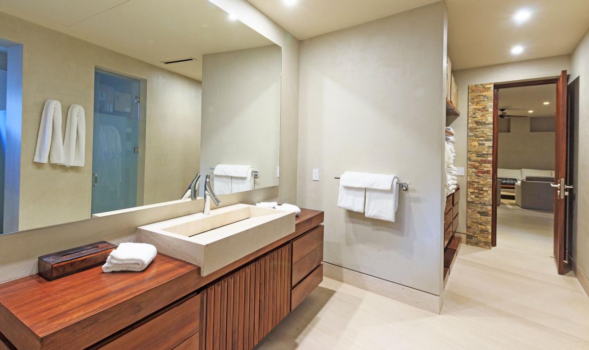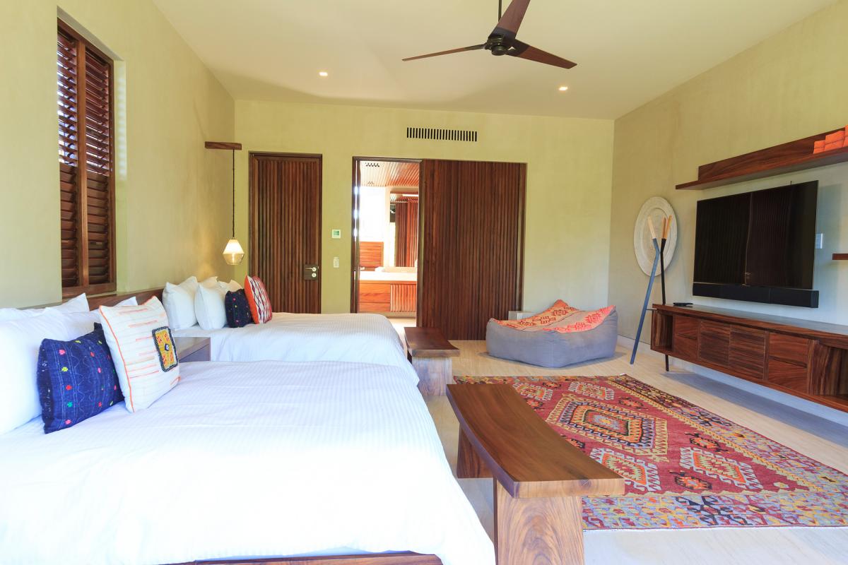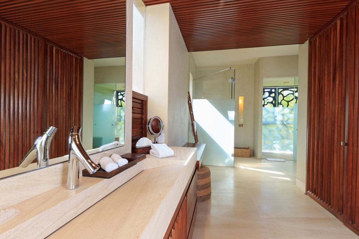 - Bedroom 2: King bed, en suite bathroom with bathtub and shower, al fresco shower, sound system, TV, AC