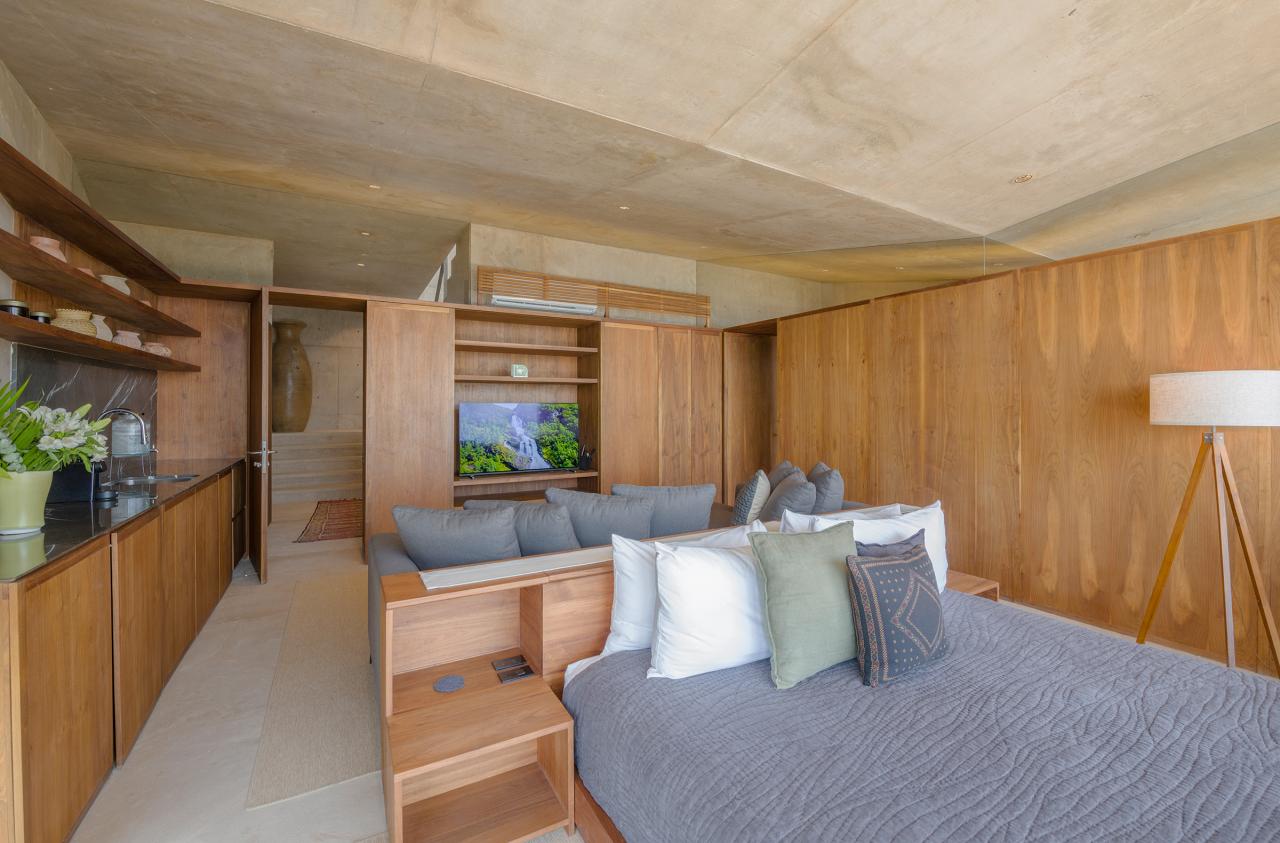 Primary Bedroom: This room has a king-sized bed, a TV, a mini-fridge, and an ocean view. The Primary Bedroom also has an ensuite bathroom with an ocean-view shower.