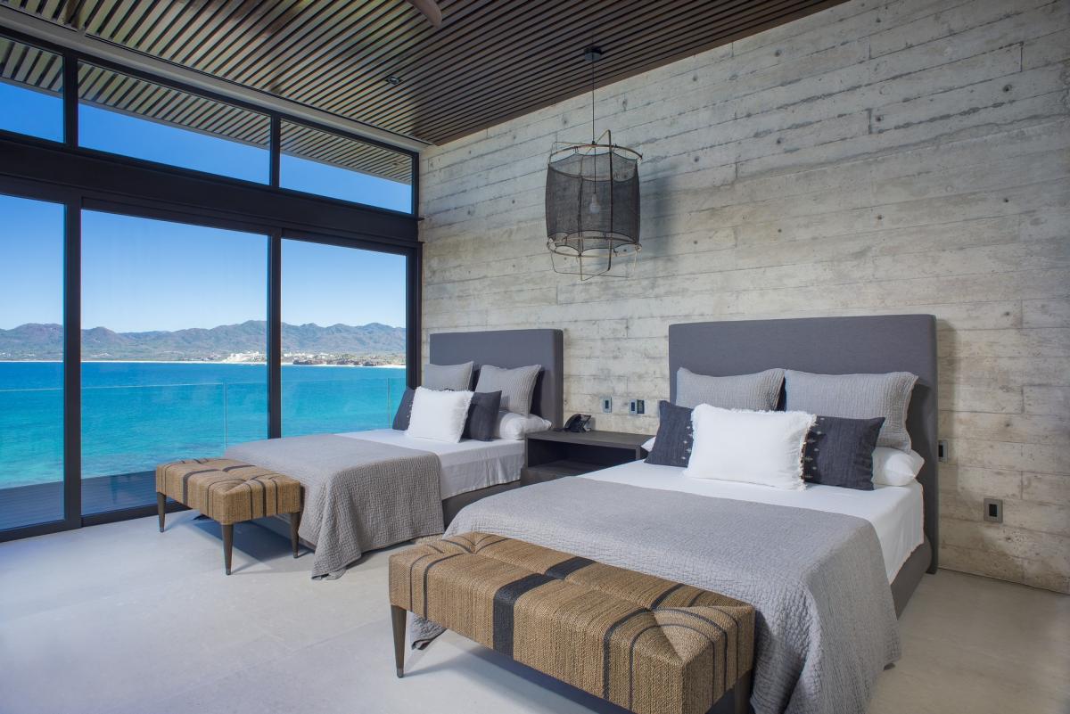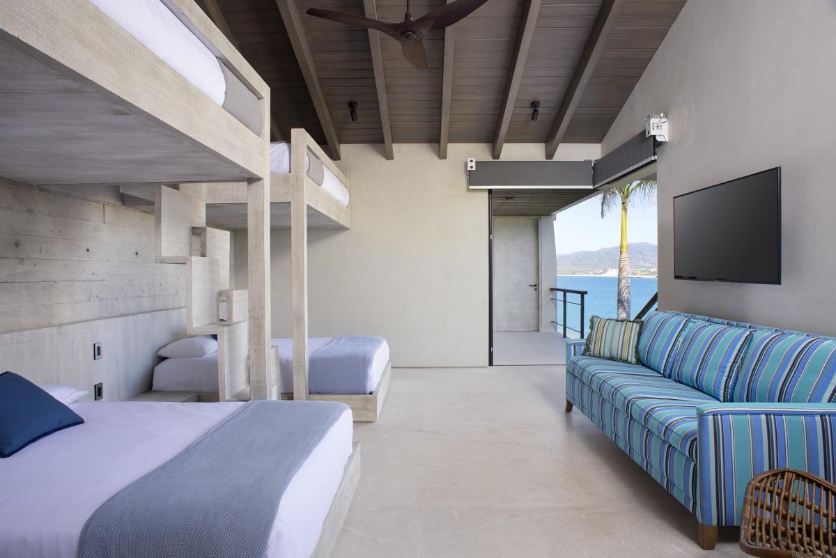 The private level is great but the heart and soul of Todo Bien is the social level. This is where memories are made. The views from everywhere are stunning. It is actually difficult to choose what will inevitably become your favorite vista. The game room is on the west side of the house. It has a pool table and outdoor ping pong table, along with a large sitting area dominated by another 82” smart TV. It looks directly onto the island situated in the pool that runs the length of the house. The island has 2 sitting areas, including one that features a fire pit overlooking the ocean. Below the island is the fitness facility which boasts free weights, a universal machine, a Peloton, Treadmill and Elliptical machines. In the pool is a sundeck with 4 chaise lounge chairs perfect for those that like to take in the sun and quickly cool off. The living/dining area is casually elegant and has both indoor and outdoor seating for meal times. The gourmet kitchen is a chef’s dream and our Chef, Chava, will delight you with his culinary skills. Adjacent to the living room area, on the east side of the house, is the Todo Bien bar. It comfortably seats 12 and once again you can enjoy another 82” smart TV to watch your favorite sporting event or show. On the backside of the Bar is our Pizza Grotto boasting a wood burning pizza oven, palm trees, a second fire pit and intimate seating highlighted by a candle wall that wraps back into the bar area creating a wonderfully romantic setting.