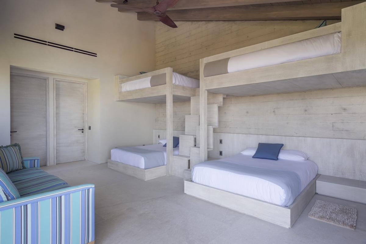 Bedroom 5 / Bunk Room: two queens, two doubles, and a sleeper sofa. This bedroom can be outfitted as a coed bunk room with two private baths with indoor/outdoor shower