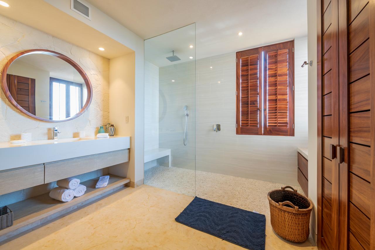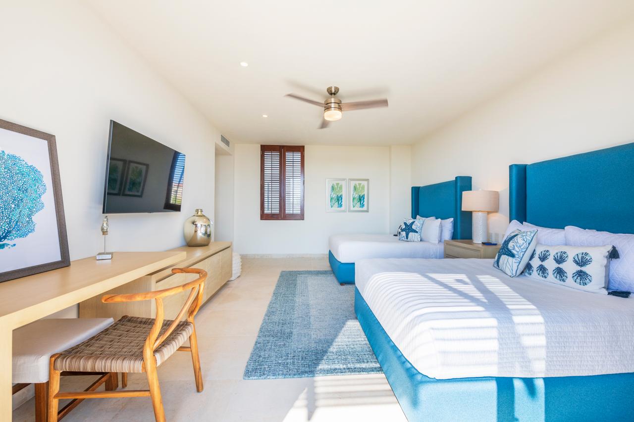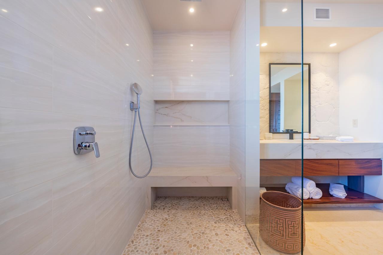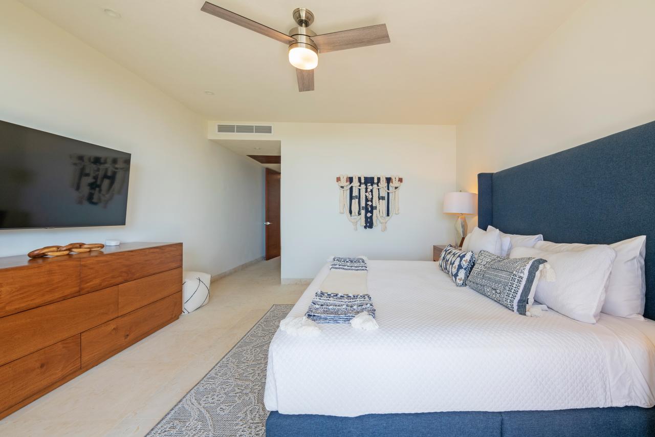Primary Bedroom: The Primary Bedroom is equipped with a king-sized bed, a TV, access to a shared patio with spectacular views, a ceiling fan, air conditioning, and a private furnished patio with an ocean view. There is also an ensuite bathroom with a bathtub and shower.