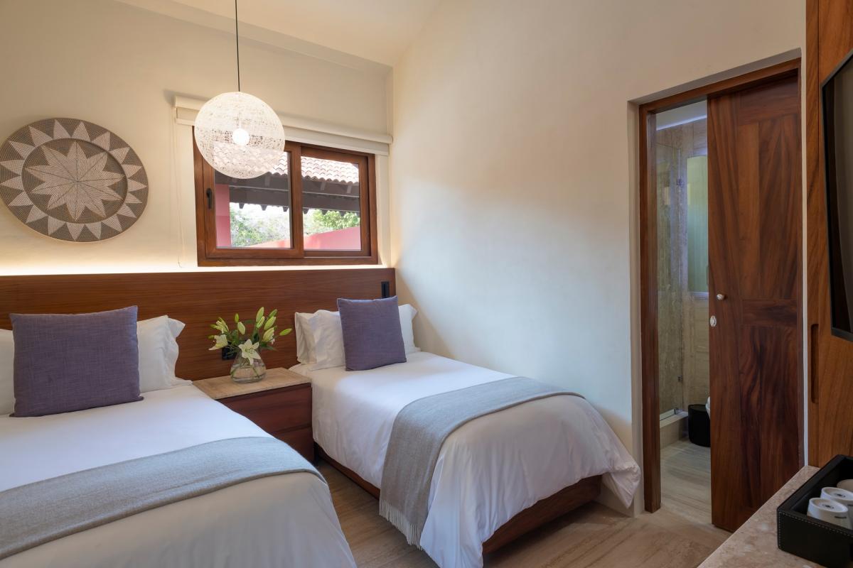 Bugambilias Suite 2: This spacious garden view suite offers two full-size beds, a television and Apple TV, personal security safe, an in-room minibar, a Nespresso® Coffee maker, and an ensuite bathroom with shower. The private patio offers a seating area and an outdoor shower. This suite can convert into One King Size and One Full-Size Bed or a double-size king bed with custom bed linens and is an excellent room to accommodate several younger guests.