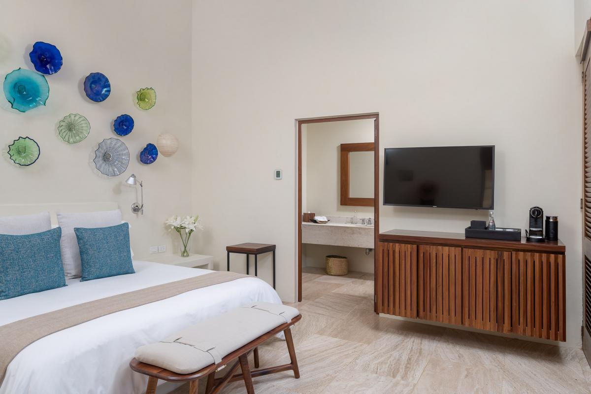 Bugambilias Suite 1: This spacious partial ocean view suite offers two full-size beds, a television and Apple TV, personal security safe, an in-room minibar, a Nespresso® Coffee maker, and an ensuite bathroom with shower. The private patio offers a seating area and an outdoor shower. This suite can convert into One King Size and One Full-Size Bed or a double-size king bed with custom bed linens and is an excellent room to accommodate several younger guests.