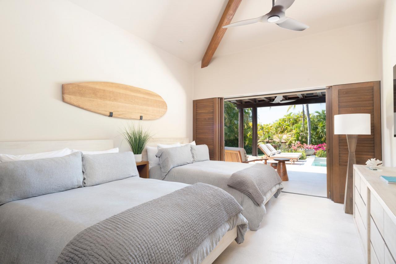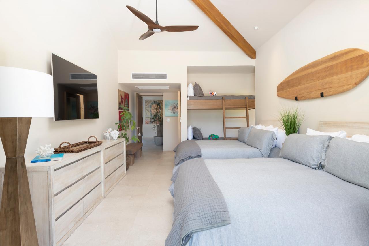 Bedroom 2: This room has two queen-sized beds and built-in adult-size bunk beds; this room sleeps six people. This room also has air conditioning, a poolside terrace, and an ensuite bathroom with a shower.