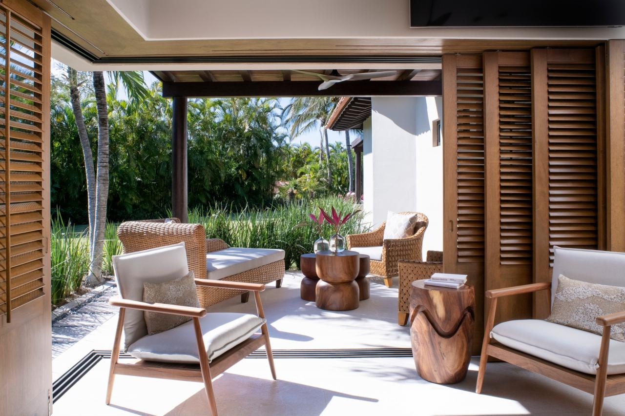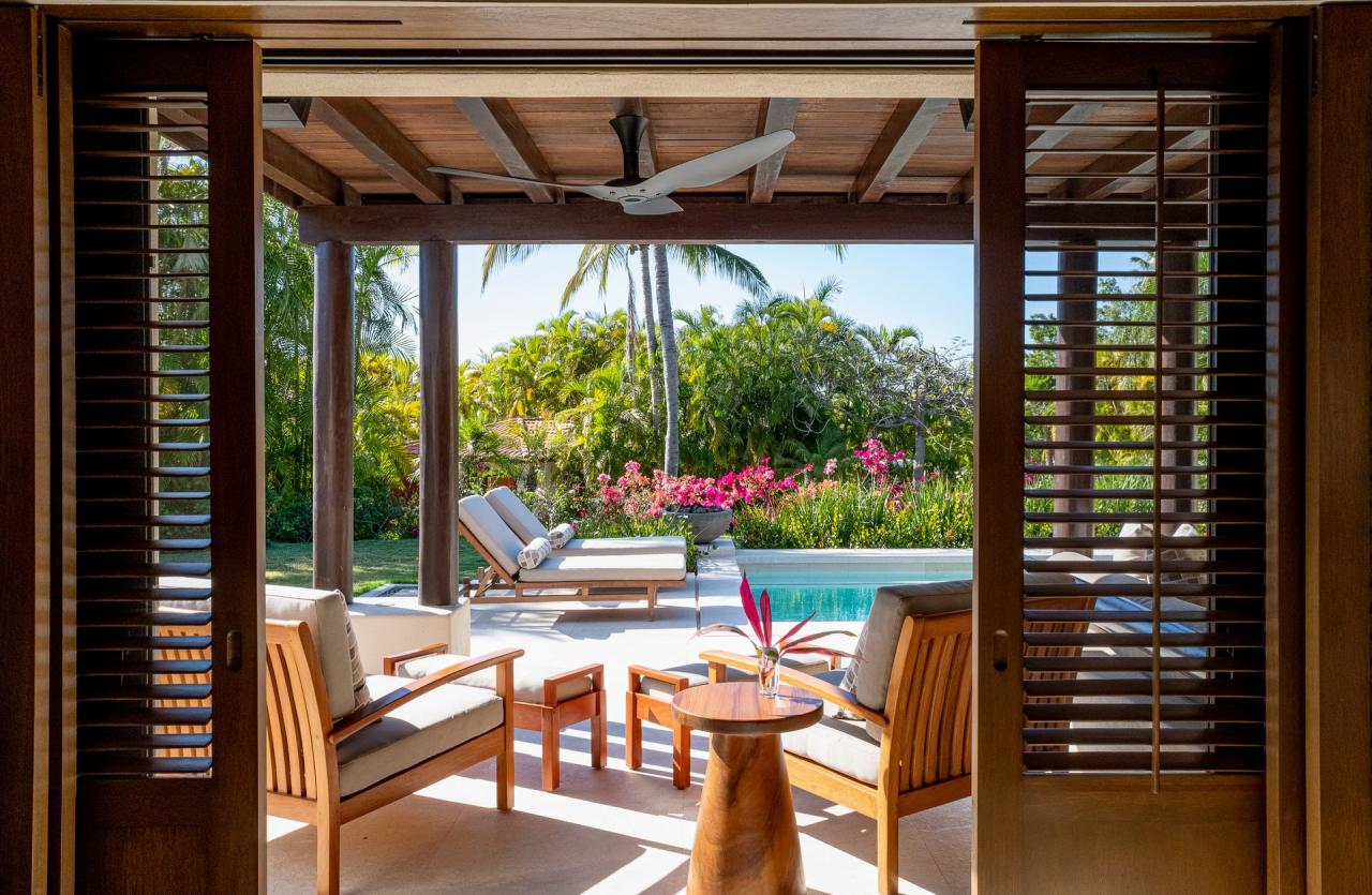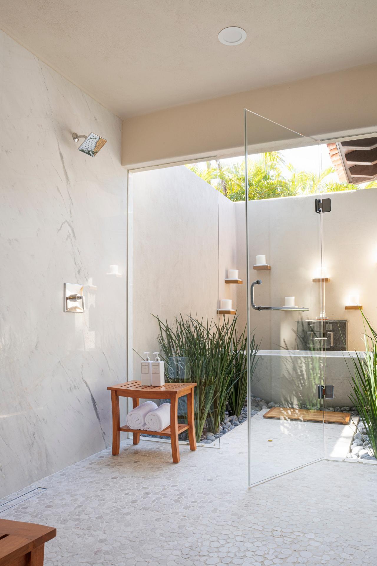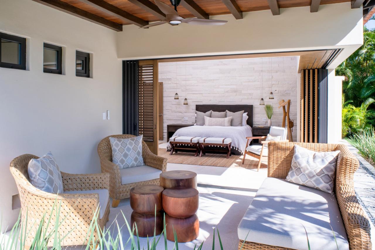 Bedroom 1: This room has a California King-sized bed, a TV, air conditioning, a private patio with outdoor furniture, and an ensuite bathroom. The ensuite bathroom is equipped with a rain shower, a marble outdoor soaking tub for two, and a dual vanity.
