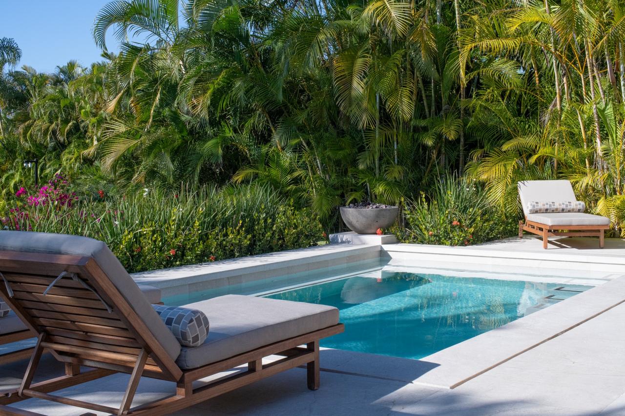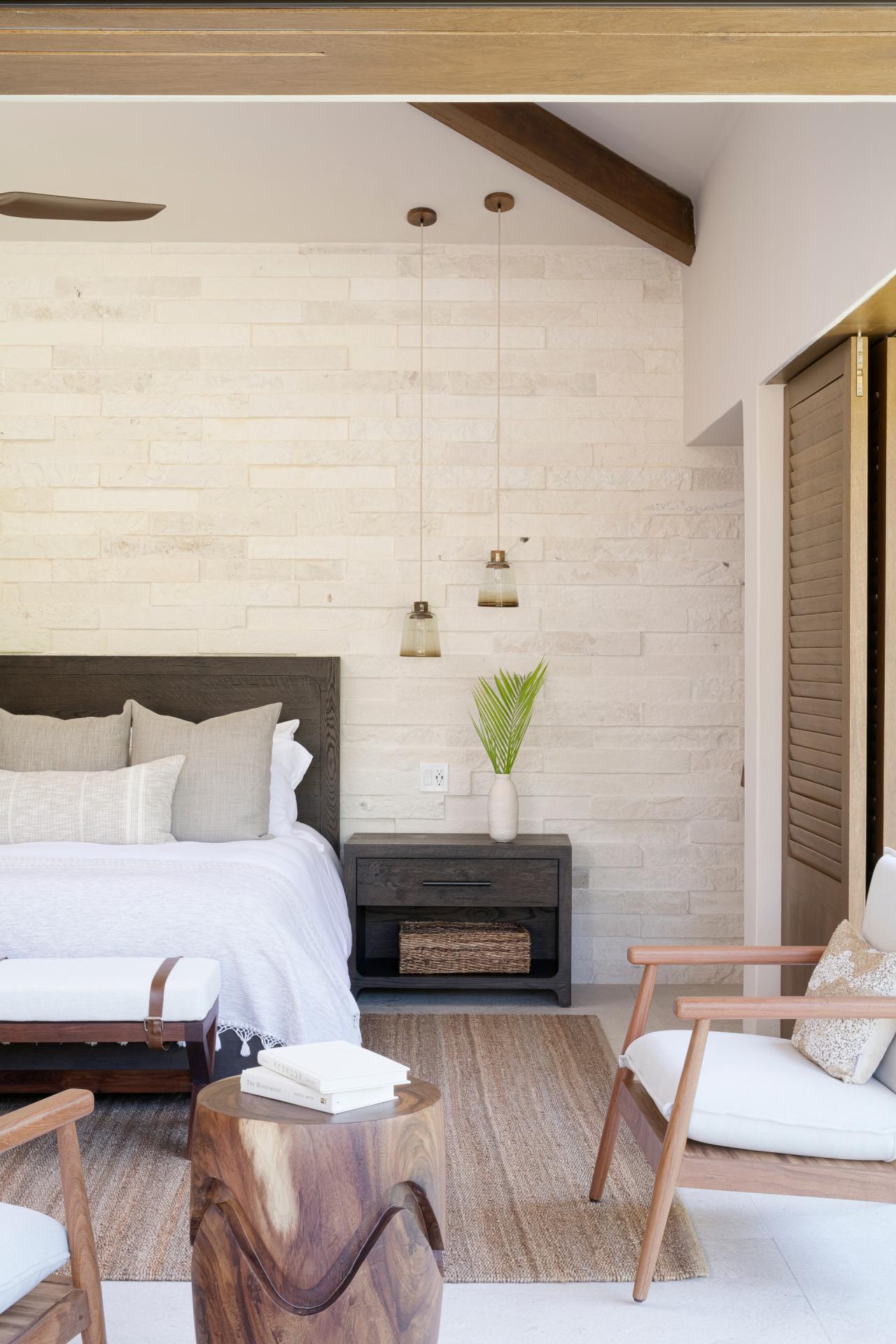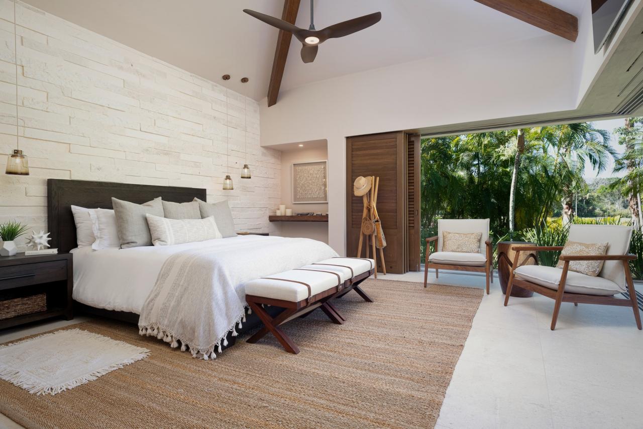 Bedroom 1: This room has a California King-sized bed, a TV, air conditioning, a private patio with outdoor furniture, and an ensuite bathroom. The ensuite bathroom is equipped with a rain shower, a marble outdoor soaking tub for two, and a dual vanity.