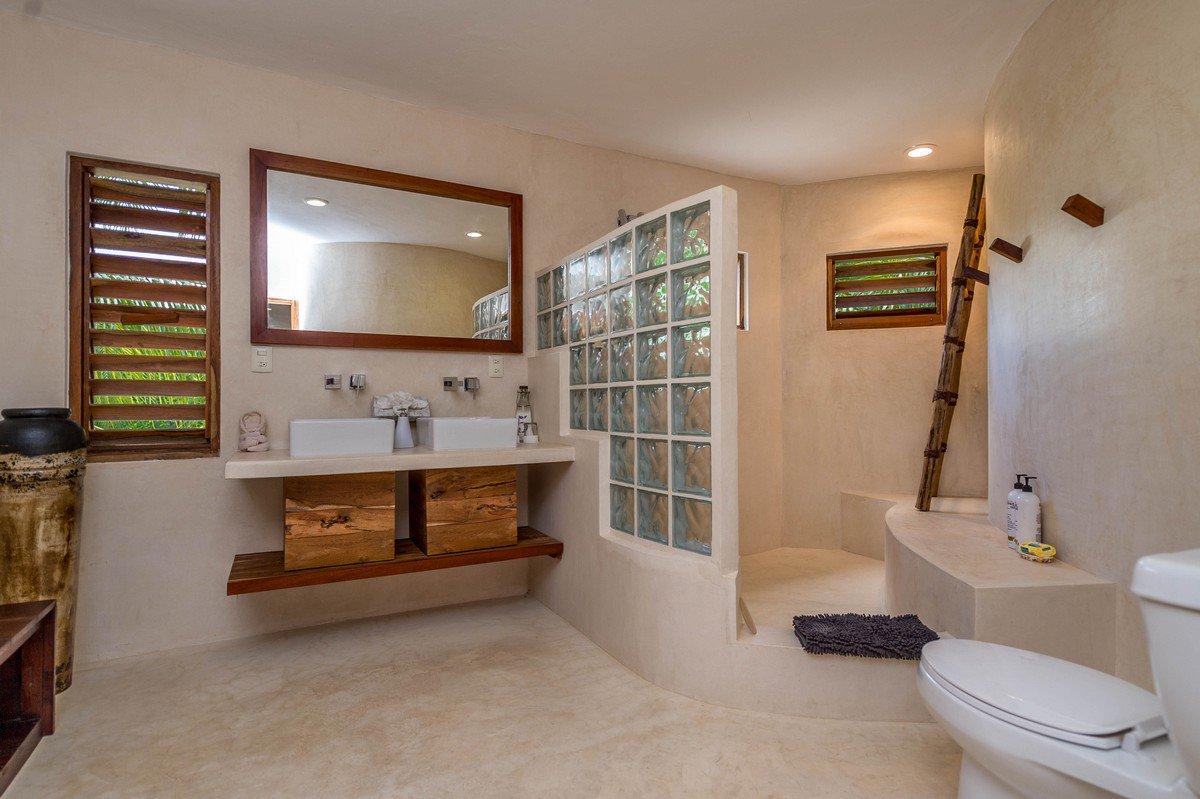 The finishes are consistent with the theme of casual, vacation luxury, but one that emphasizes the uniqueness of the Tulum location and ecology. Each large bedroom features high end bath products of both local and international origin, high thread count linens and pillow top mattress’, set against the cool, sleek polished concrete, stone and wood finishes of the bedrooms, floors and bath vanities. Of course, Casa Carolina features Wind and Solar power and a backup generator to meet the needs of any guest 24/7. Additionally, we have taken extra care to lessen our and your footprints in this pristine area by having a grey water waste system, 2 wells and purified water.