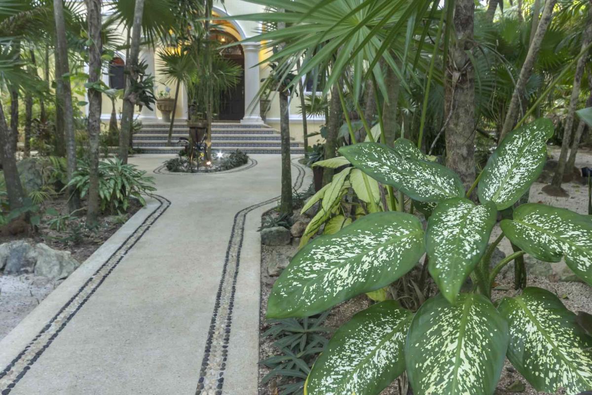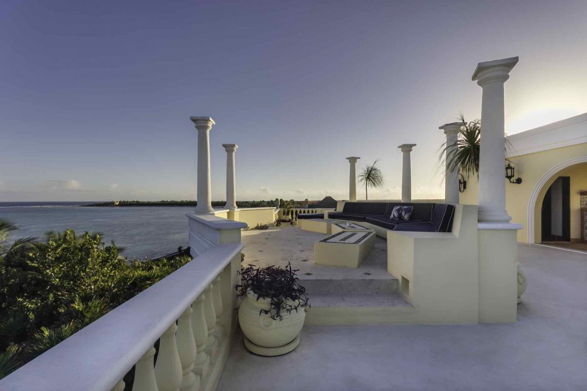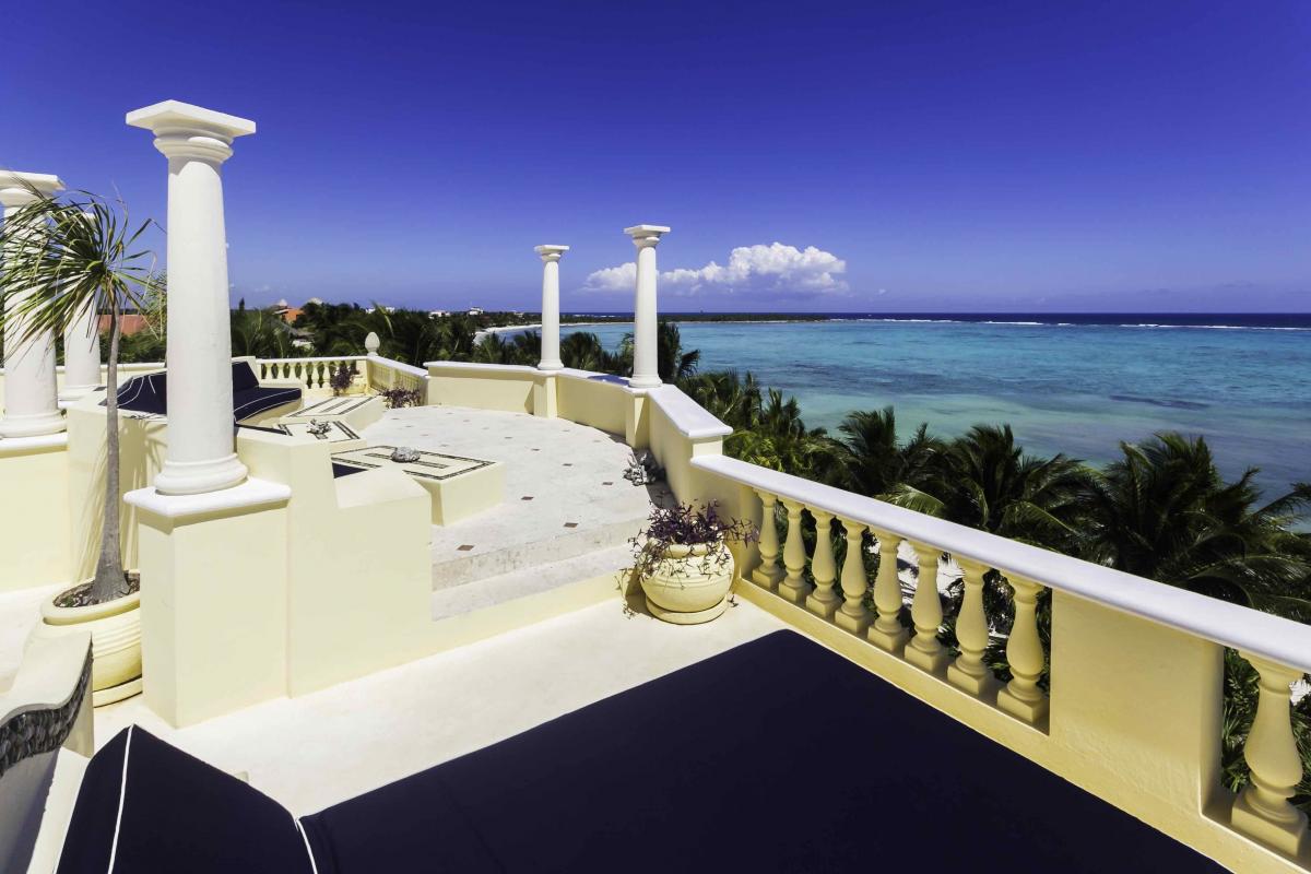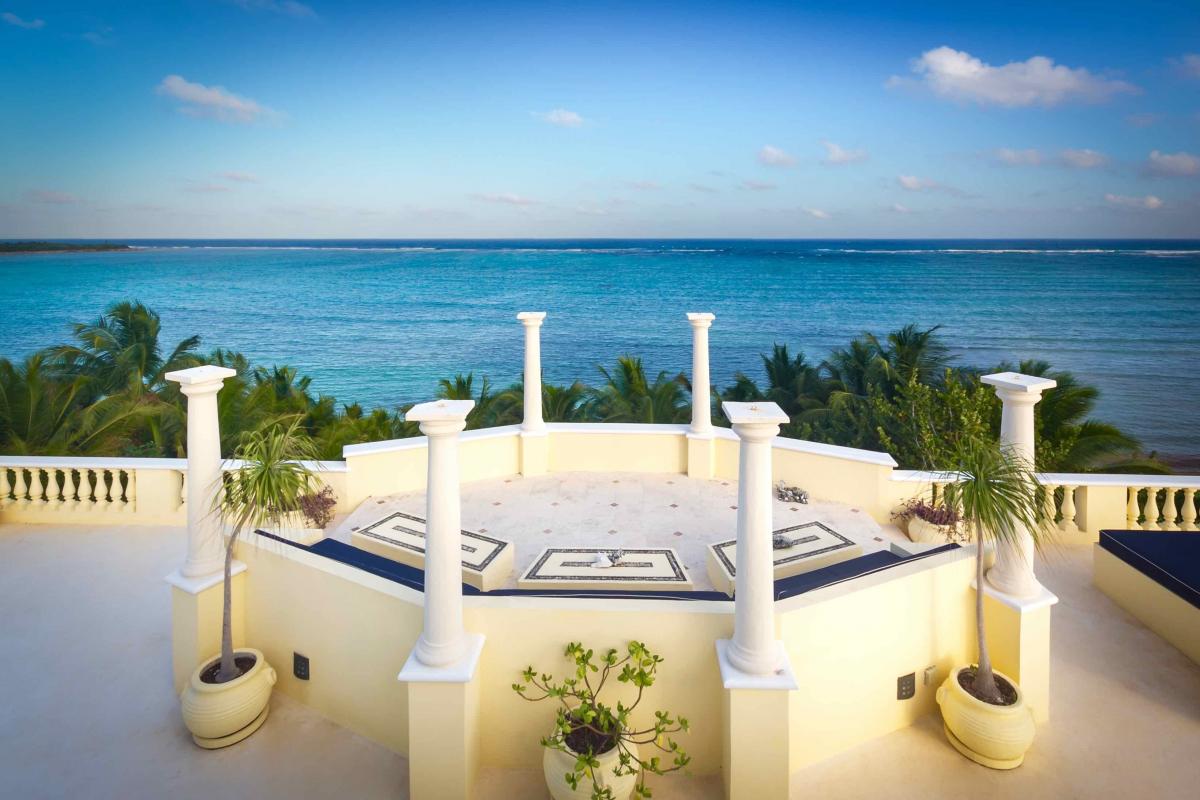 The beachfront patio is a perfect place to entertain; the spacious infinity pool is surrounded by chaise lounges and an outdoor dining area. The stone Grecian aqueduct spills into the pool, while the surrounding palm trees provide an atmosphere of seclusion and privacy. Our live-in staff is available for your every need, and arrangements can be made for day-trip and dining excursions to the best spots in the Riviera Maya, All you need do is ask.