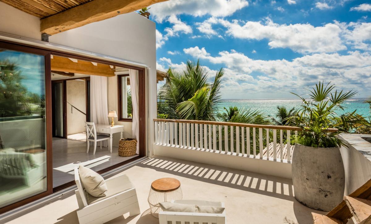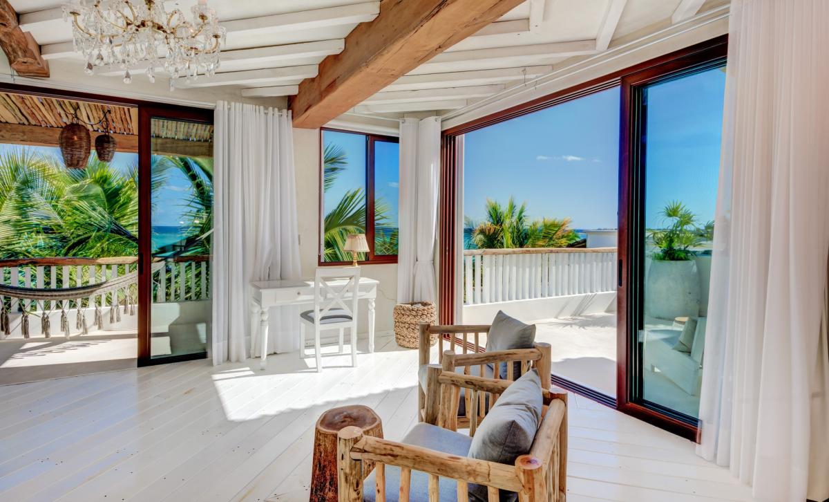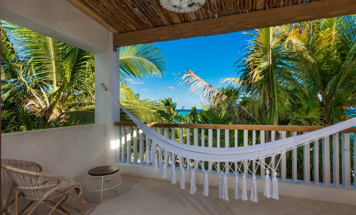 - Bedroom 2: Two double beds, en suite bathroom with shower and bathtub, AC, ceiling fan, closet, hammock, ocean view, private balcony, single bed