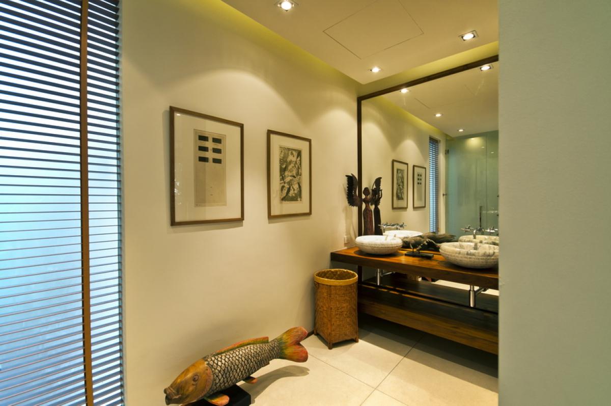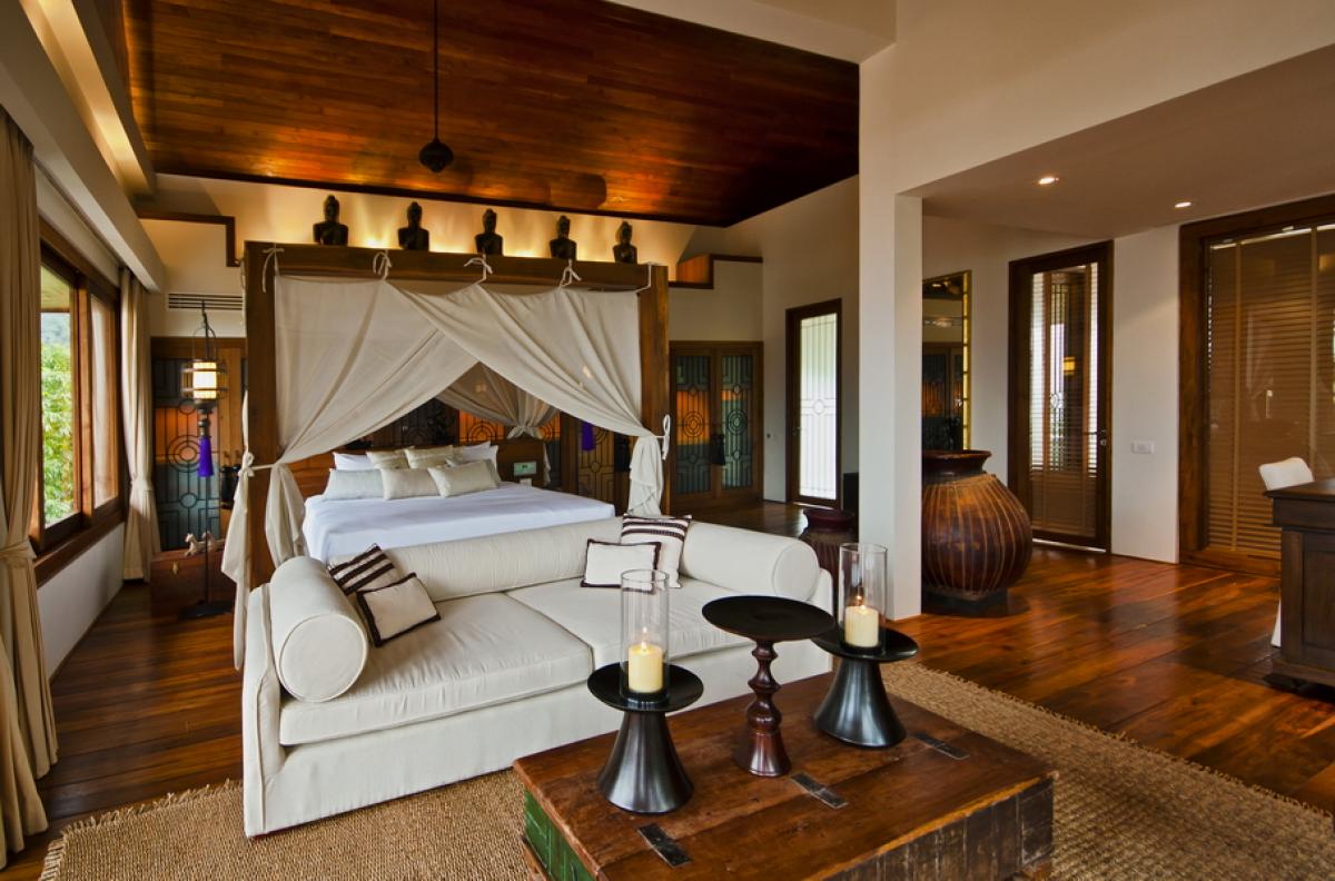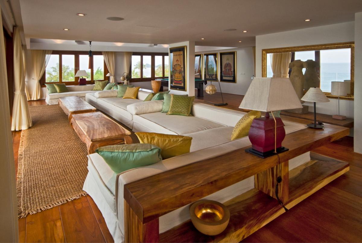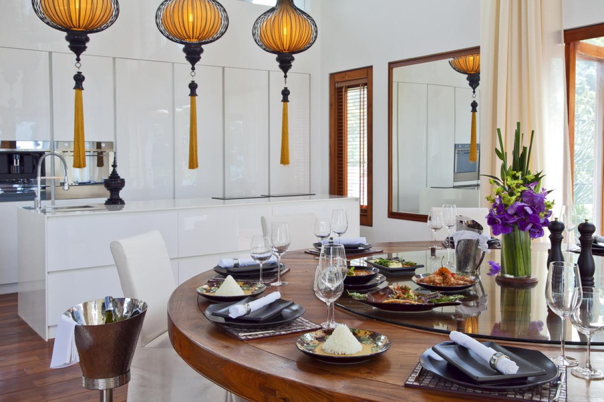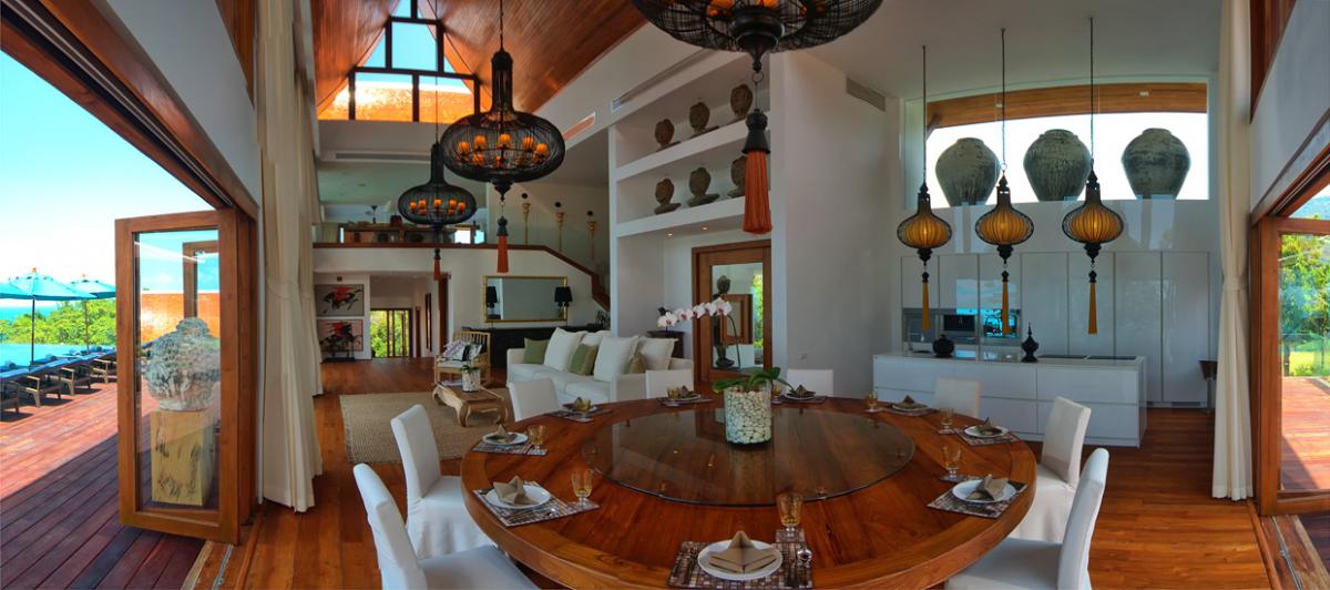 The main level begins with a majestic, stone-clad entrance that opens into a vaulted lounge and dining area furnished with fine contemporary Asian art and decor with wood and glass doors opening onto the large pool deck. The lounge extends into a spacious dining room with a 16-seater round solid Teak table, served by a fully fitted western show kitchen. A separate wet kitchen allows the staff to unobtrusively prepare meals for the guests.
