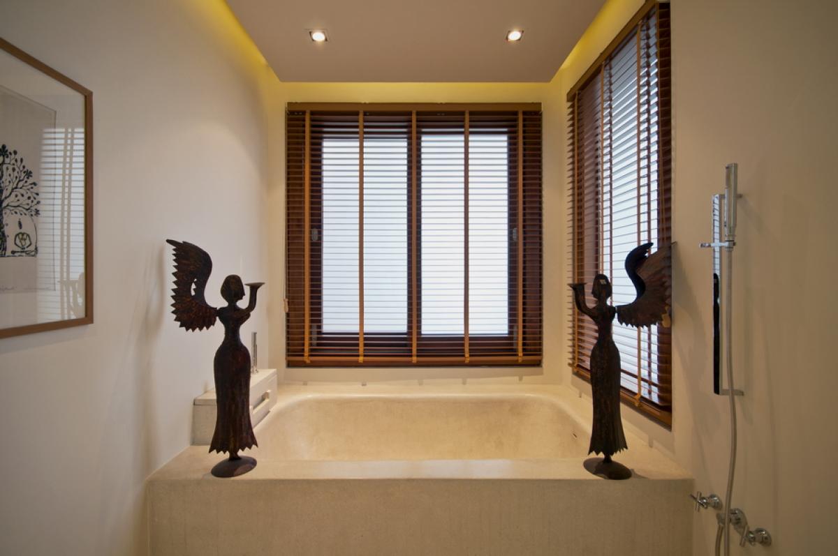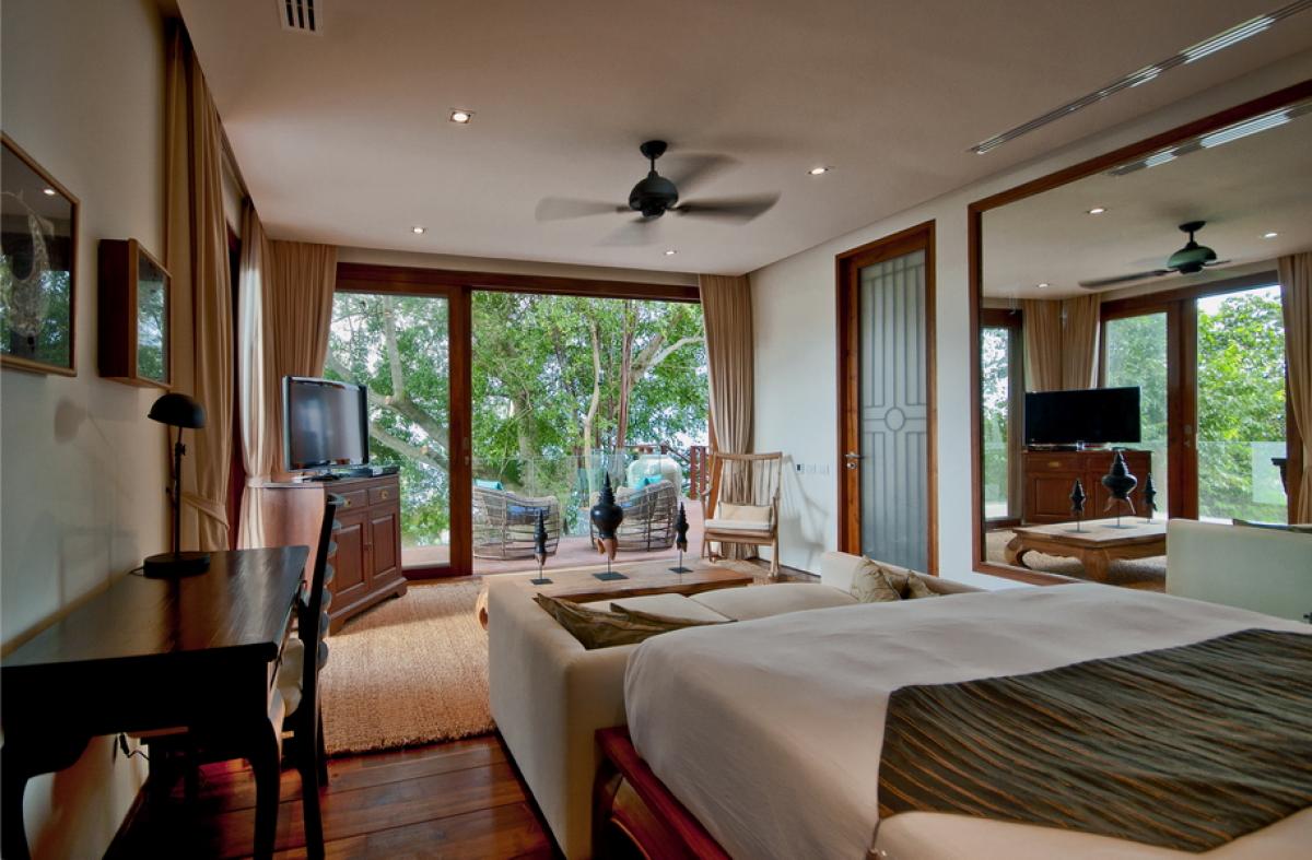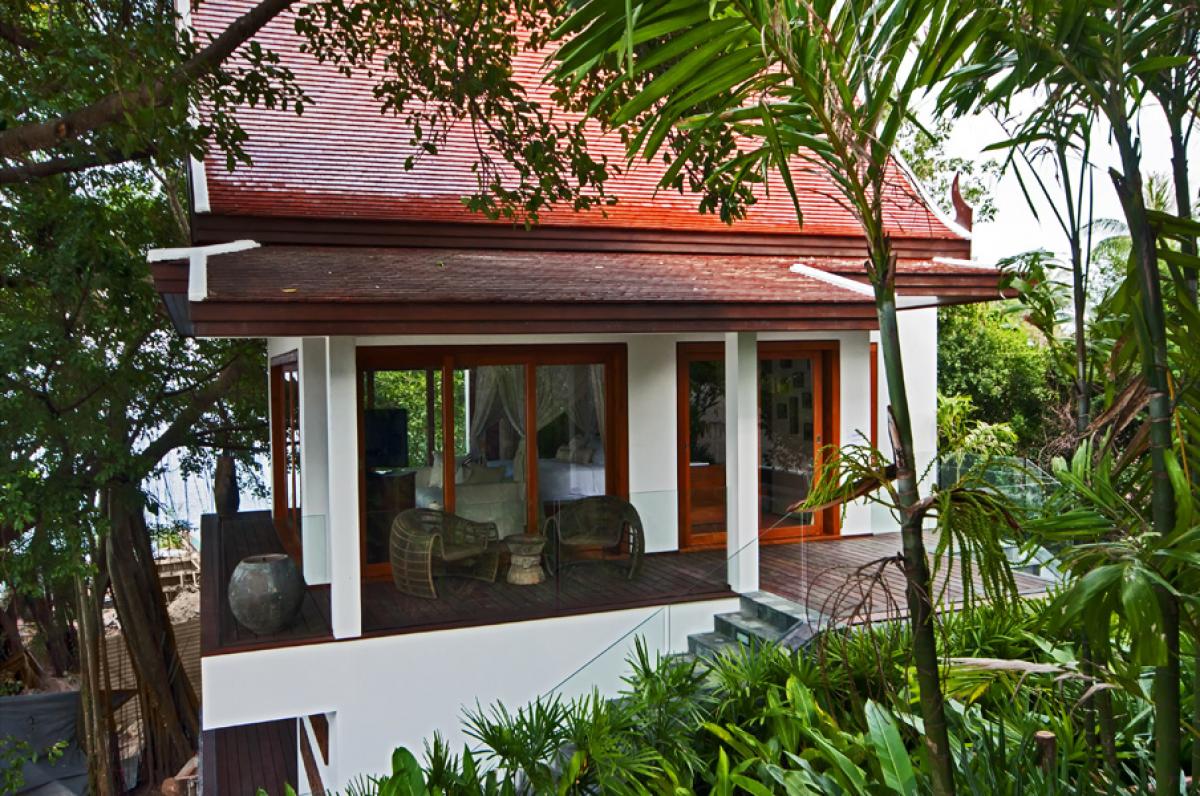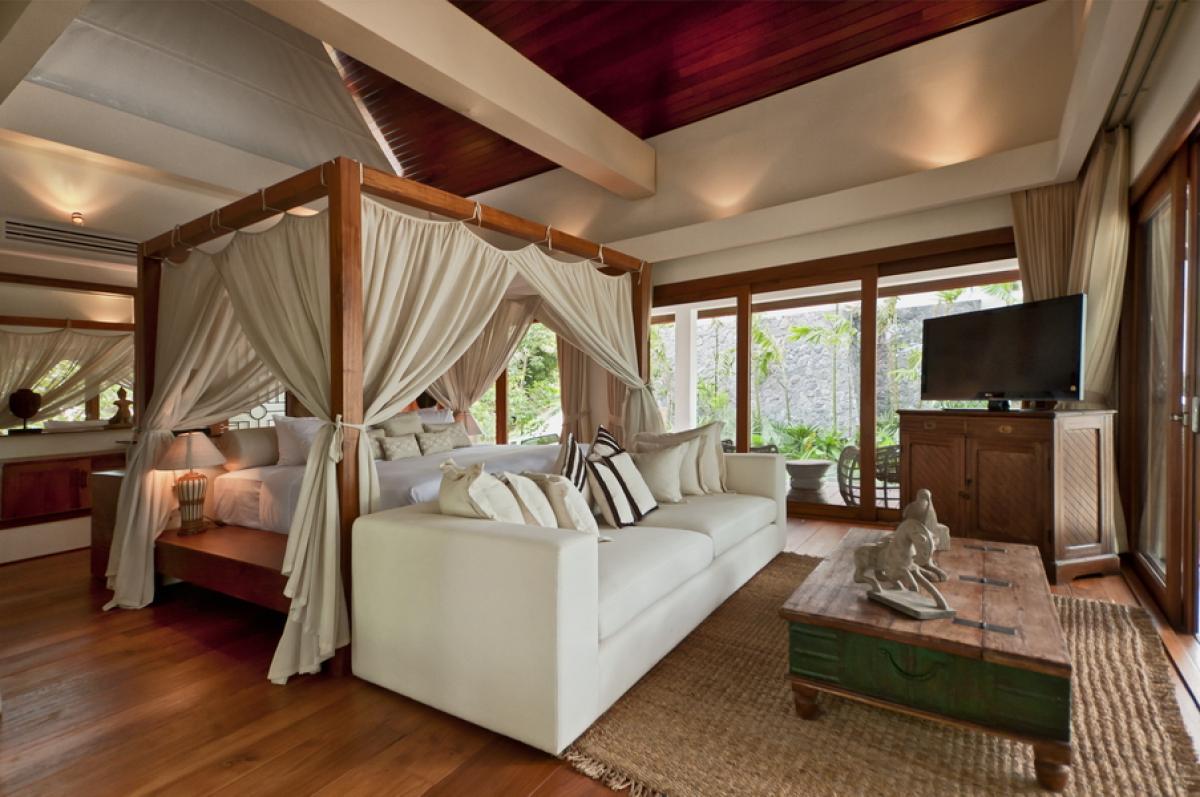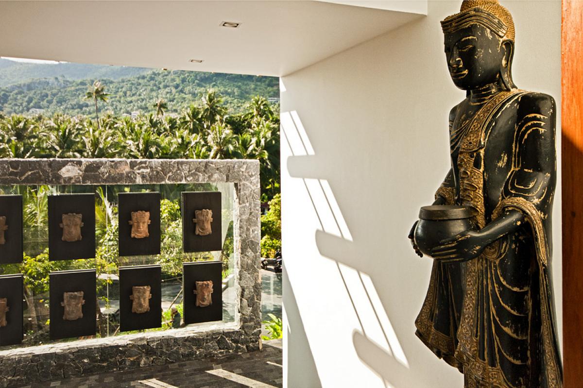 The main level begins with a majestic, stone-clad entrance that opens into a vaulted lounge and dining area furnished with fine contemporary Asian art and decor with wood and glass doors opening onto the large pool deck. The lounge extends into a spacious dining room with a 16-seater round solid Teak table, served by a fully fitted western show kitchen. A separate wet kitchen allows the staff to unobtrusively prepare meals for the guests.