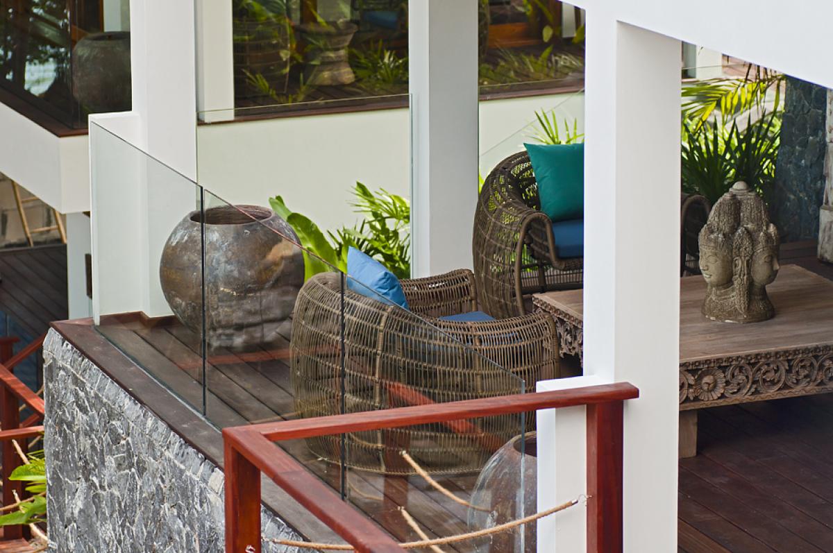 The Clubhouse opens onto a wide wooden multi level sun deck that is furnished. The main deck hosts sun loungers that borders the 32 meter infinity pool with built-in 8 person jacuzzi while the lower deck and its seaview boats several sofas. One side of the deck also features a roofed poolside relaxation sala or gazebo, while a second furnished sala is positioned as an ideal location for a BBQ for al fresco meals and drinks prepared by the private chef and the villa team.